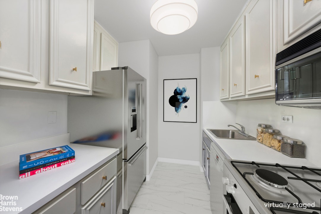 The living room stretches over 27 feet in length, providing ample room for a variety of furniture arrangements. The natural light is plentiful and the north facing views overlook West 67th Street, the Hotel Des Artistes, and the Central Park West Historic District. Step onto your own private balcony to take in the lovely views of the building garden and running fountain-perfect for unwinding or entertaining guests.