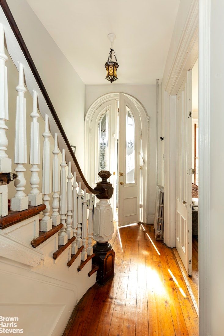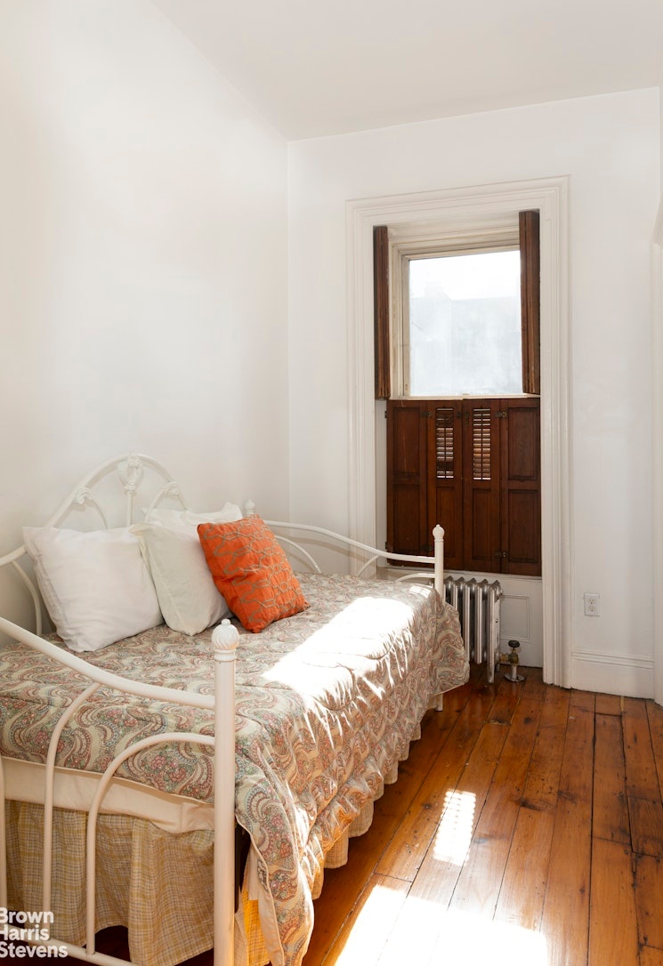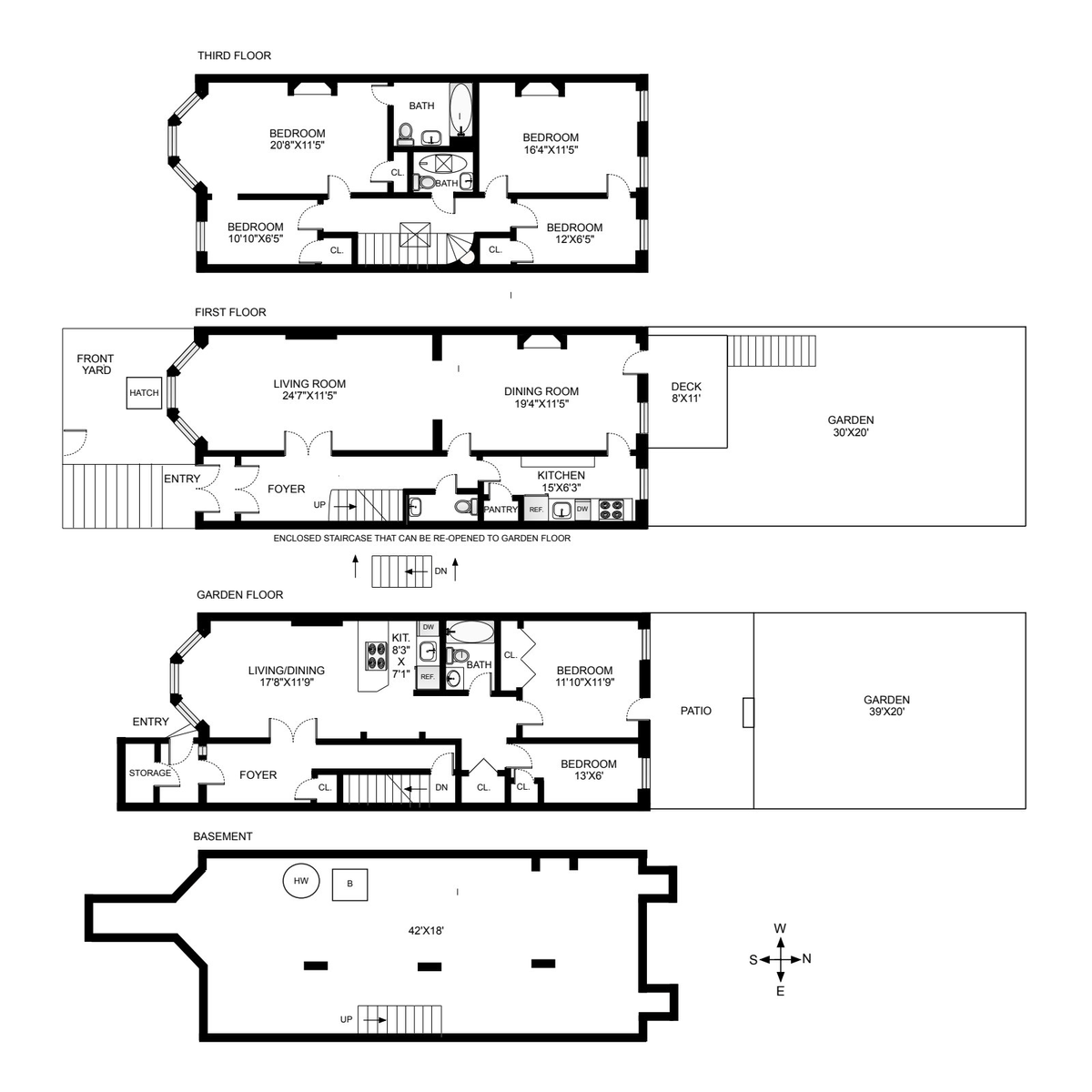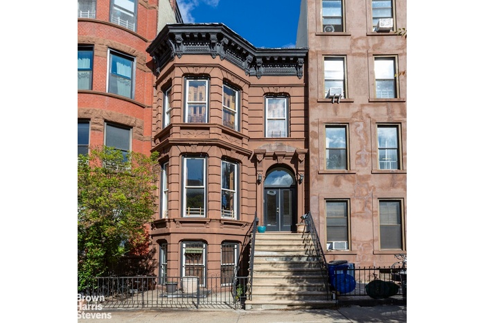 Two family, 3 story + cellar brownstone on 20 x 90 foot lot. Much original detail intact; plaster moldings, wood doors and window shutters. Garden level is a two bedroom, one bath unit with kitchen open to living room, and access to rear garden thru larger bedroom. Upper duplex has large living room with bay window, separate formal dining room and separate kitchen, powder room in hallway. Top floor has four bedrooms and two full baths; one ensuite to front bedroom. Metal deck off dining room on parlor floor. Rear garden. Large cellar contains gas boiler, water heater and meters.