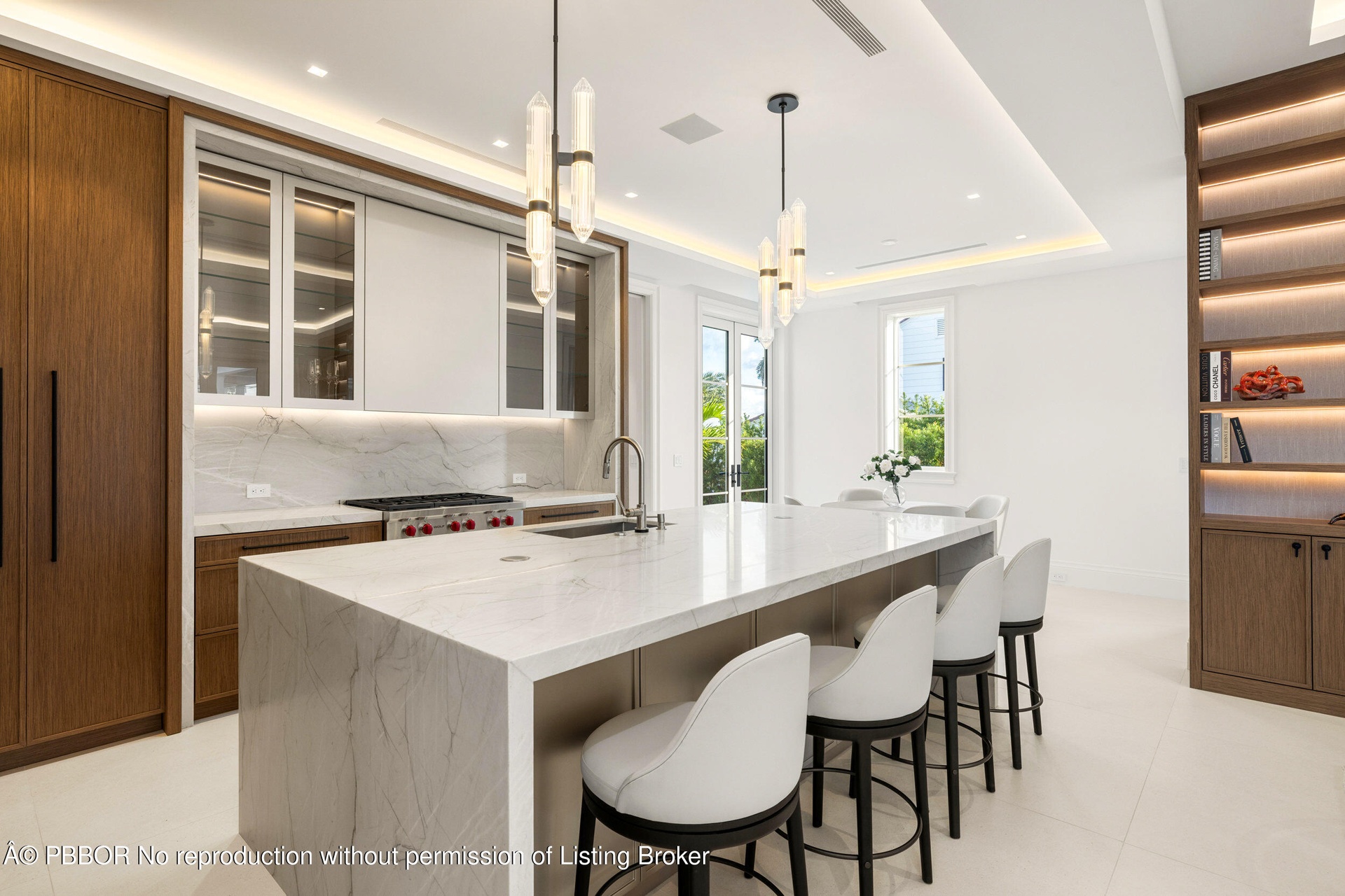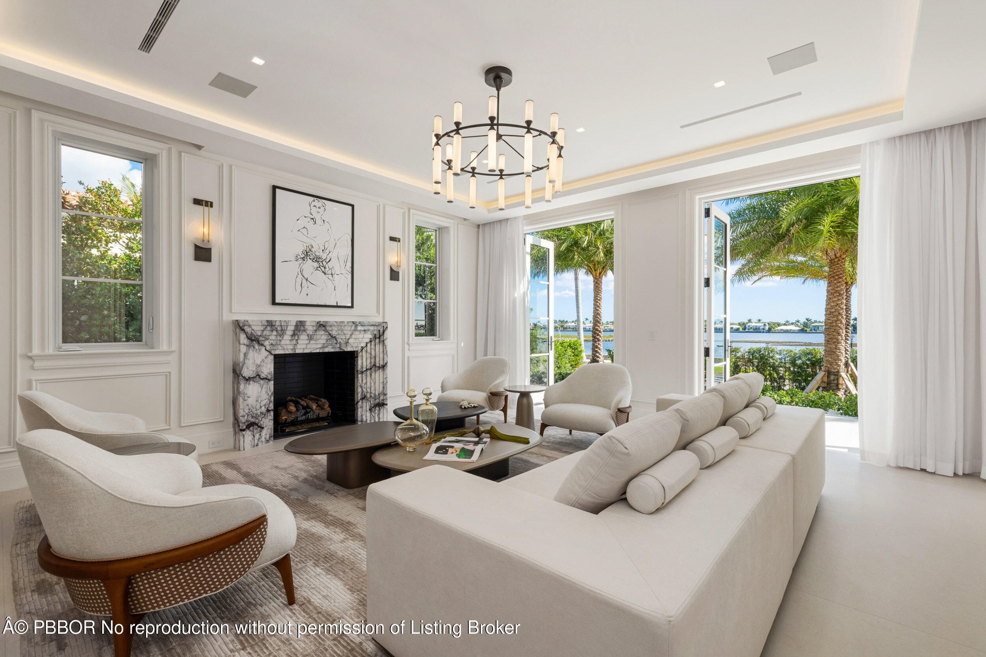 The main level features a bright foyer, a formal living room with marble fireplaces, and stunning views of the water. The chef's kitchen is equipped with Sub-Zero and Wolf appliances, natural stone countertops, custom cabinetry, and a large island that opens to the family room. The home also includes a formal dining room, a temperature-controlled wine cellar, a dedicated office, and a media room.