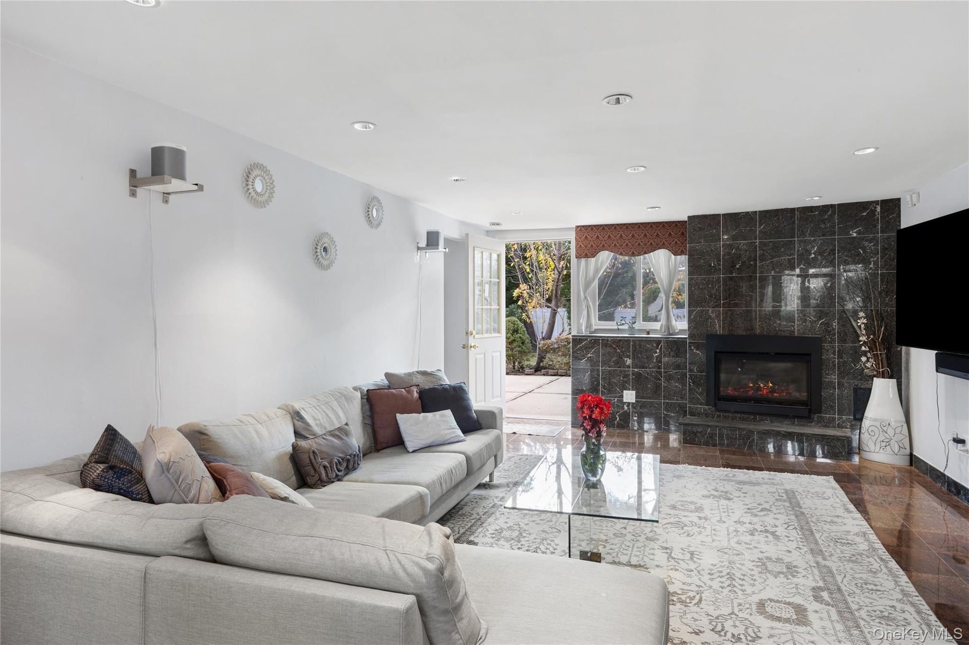 A Few Steps Down, The First-Floor Family Room Offers A Warm Gas Fireplace W/ Tiled Mantle & Remote Operation, Access To The Backyard & Patio, Powder Room, Finished Garage W/ Porcelanosa Tile & Entry To A Full Finished Basement, An Ideal Space For Recreation Or Work From Home Flexibility.