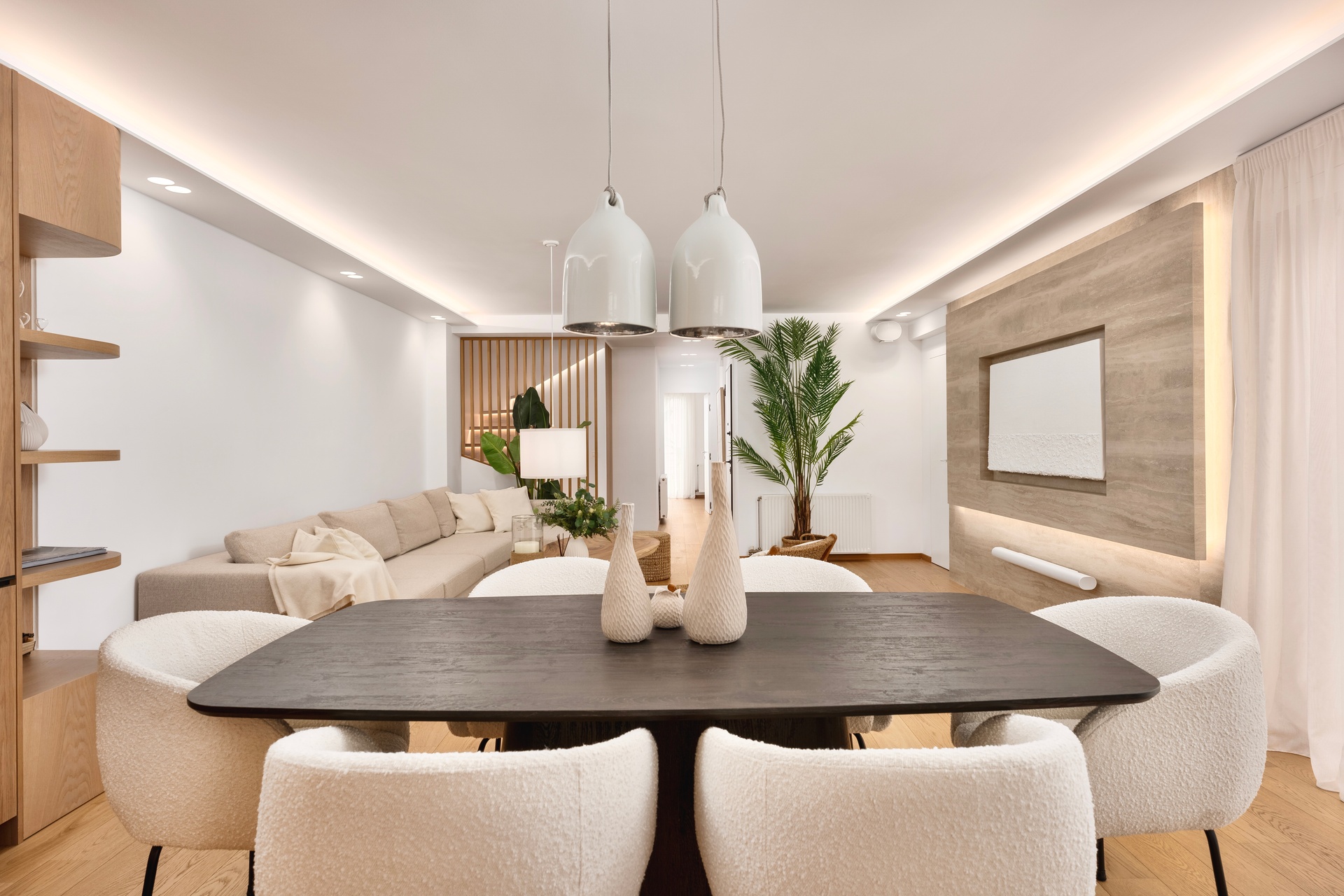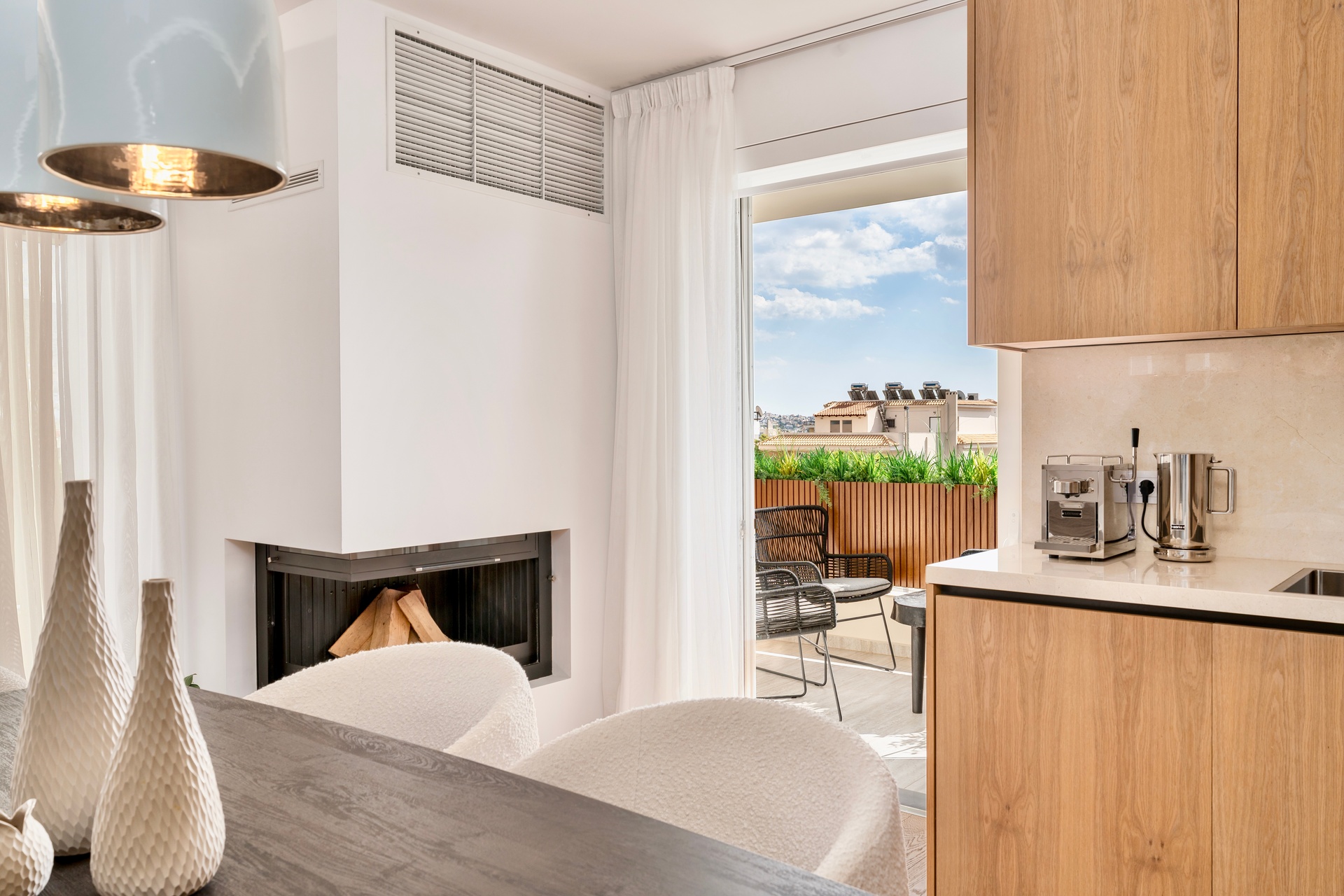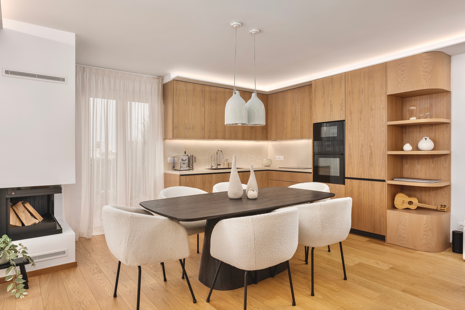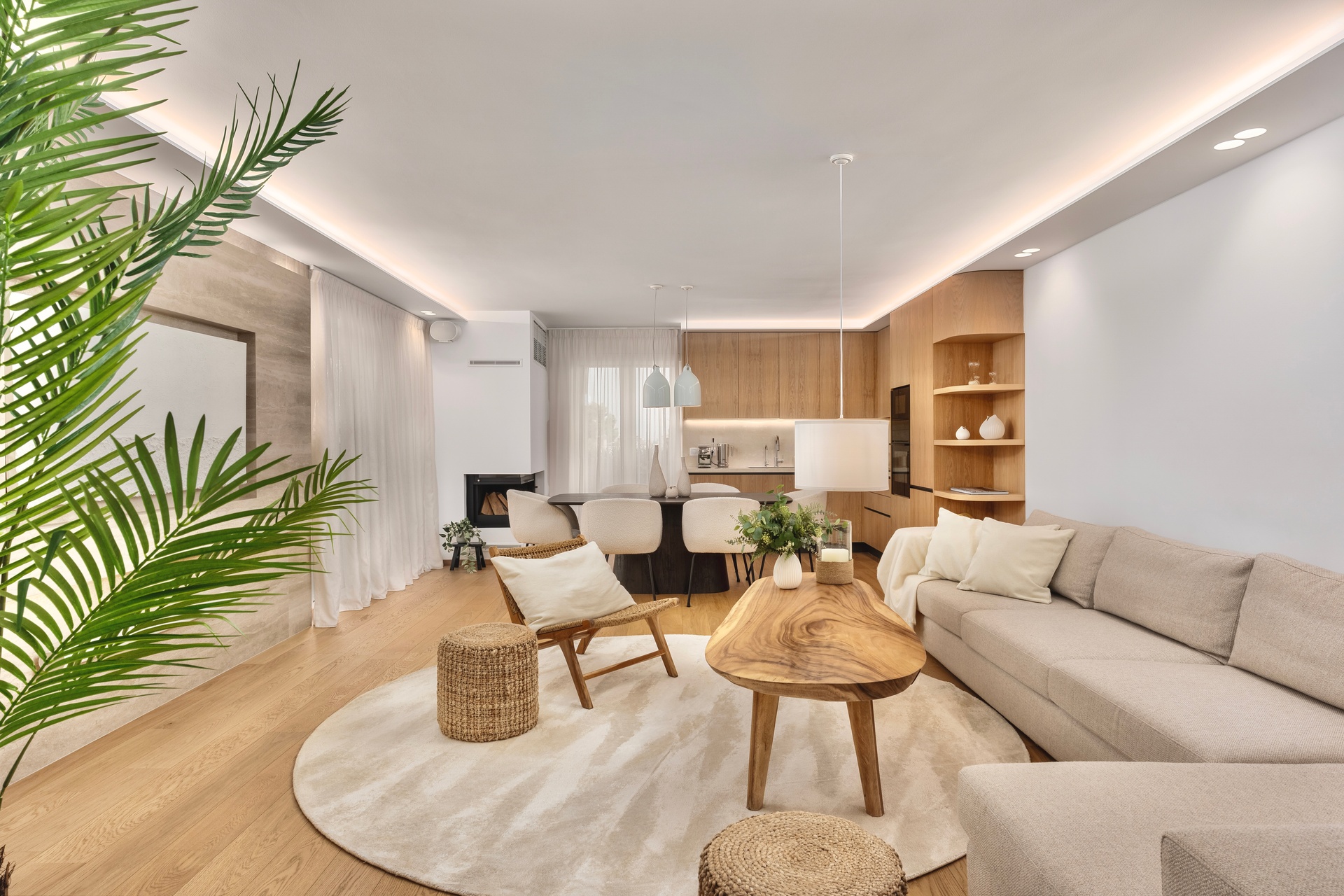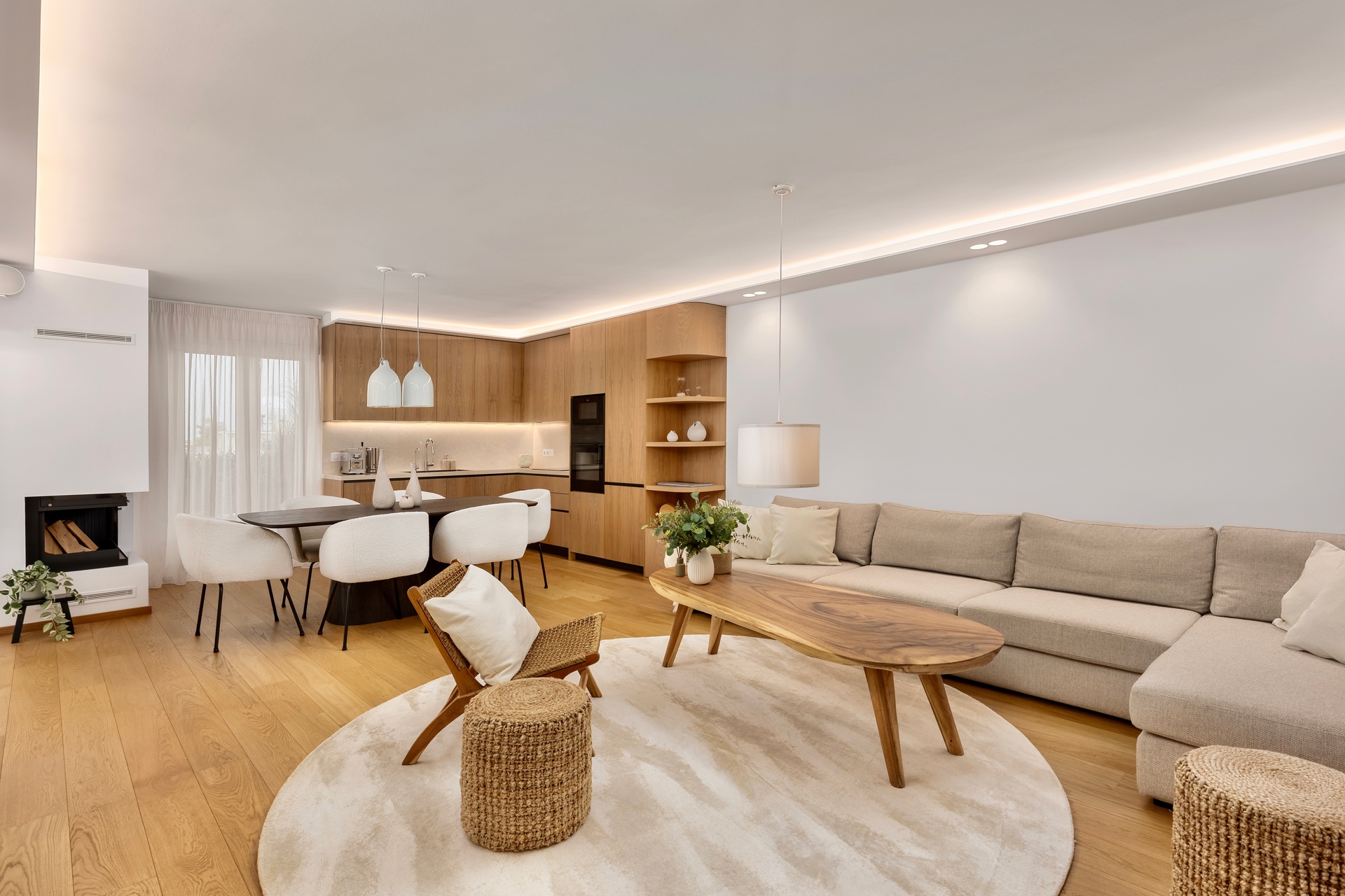 The main level welcomes you with a sunlit, south-facing living and dining area that flows onto a large terrace, creating an ideal setting for both relaxation and entertaining. The open-plan kitchen, crafted with natural stone and warm wood tones, is fitted with premium appliances and designed for everyday luxury.