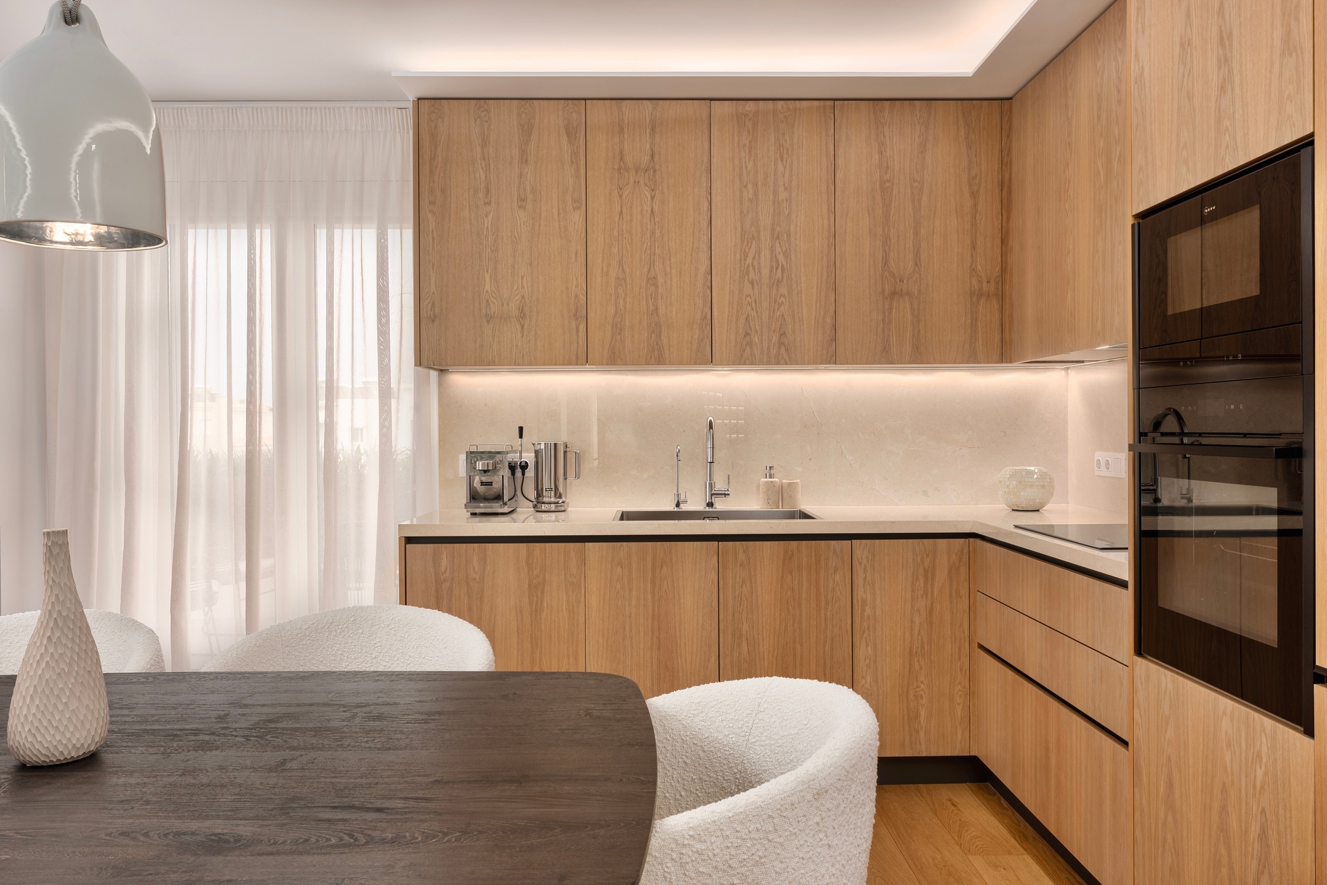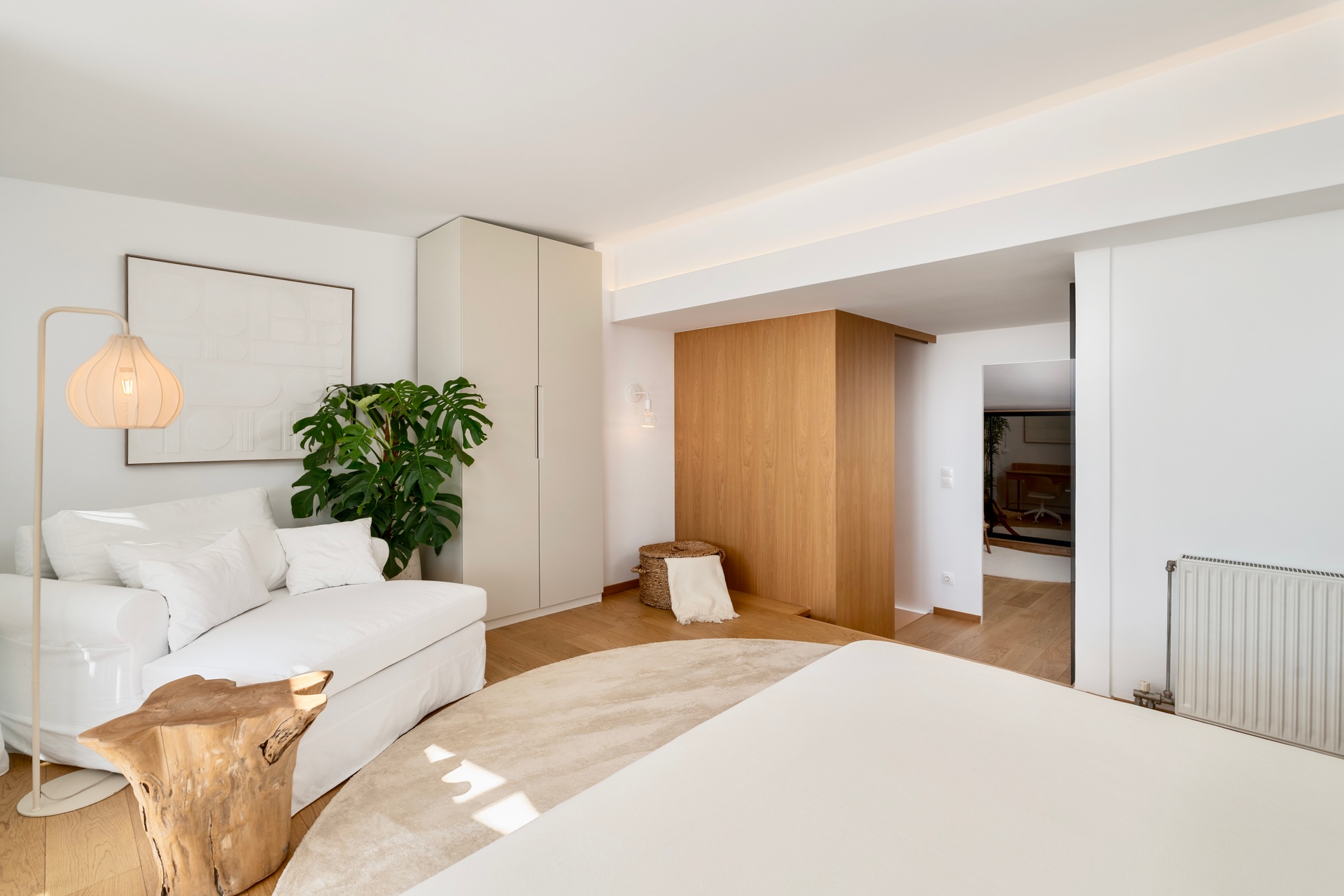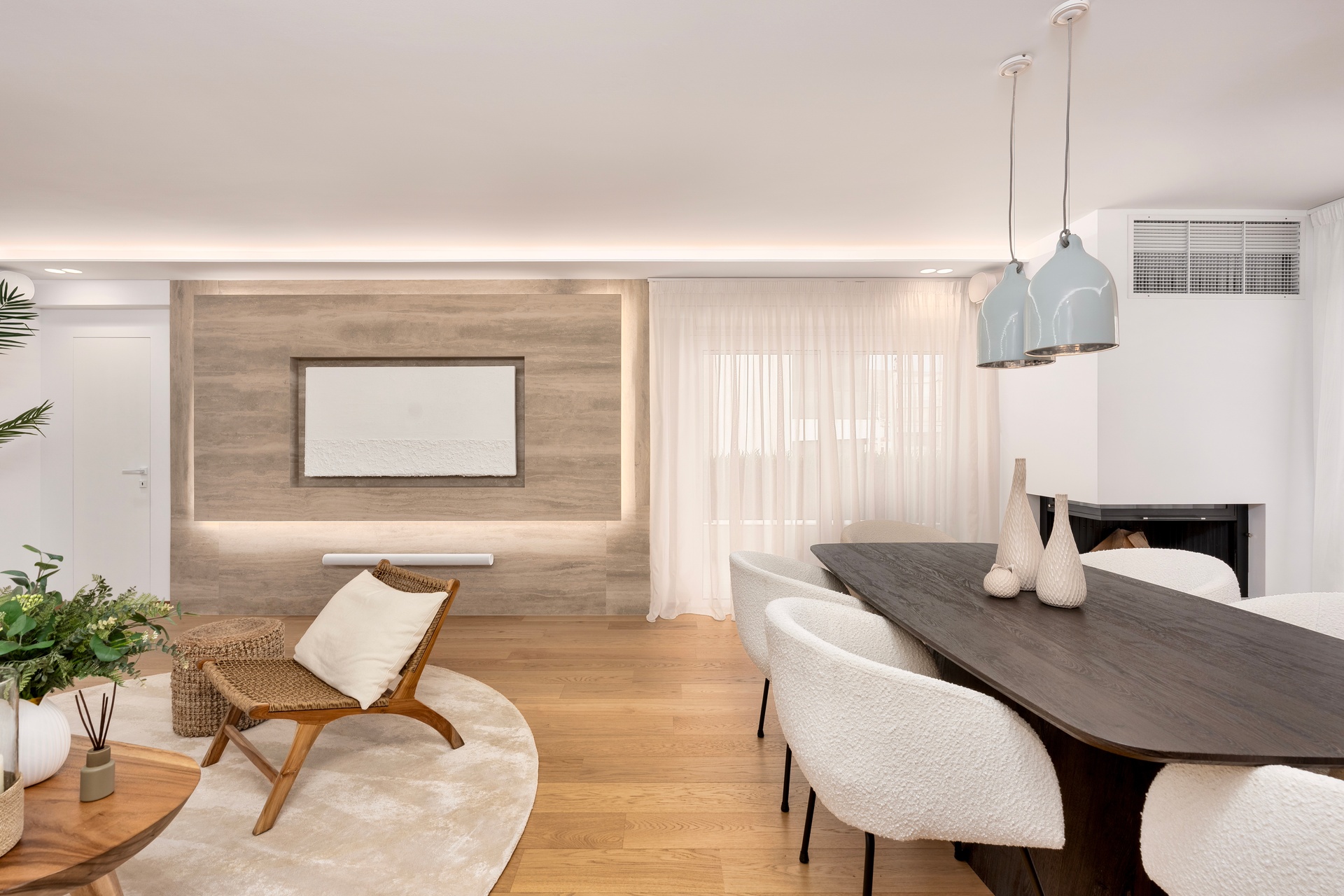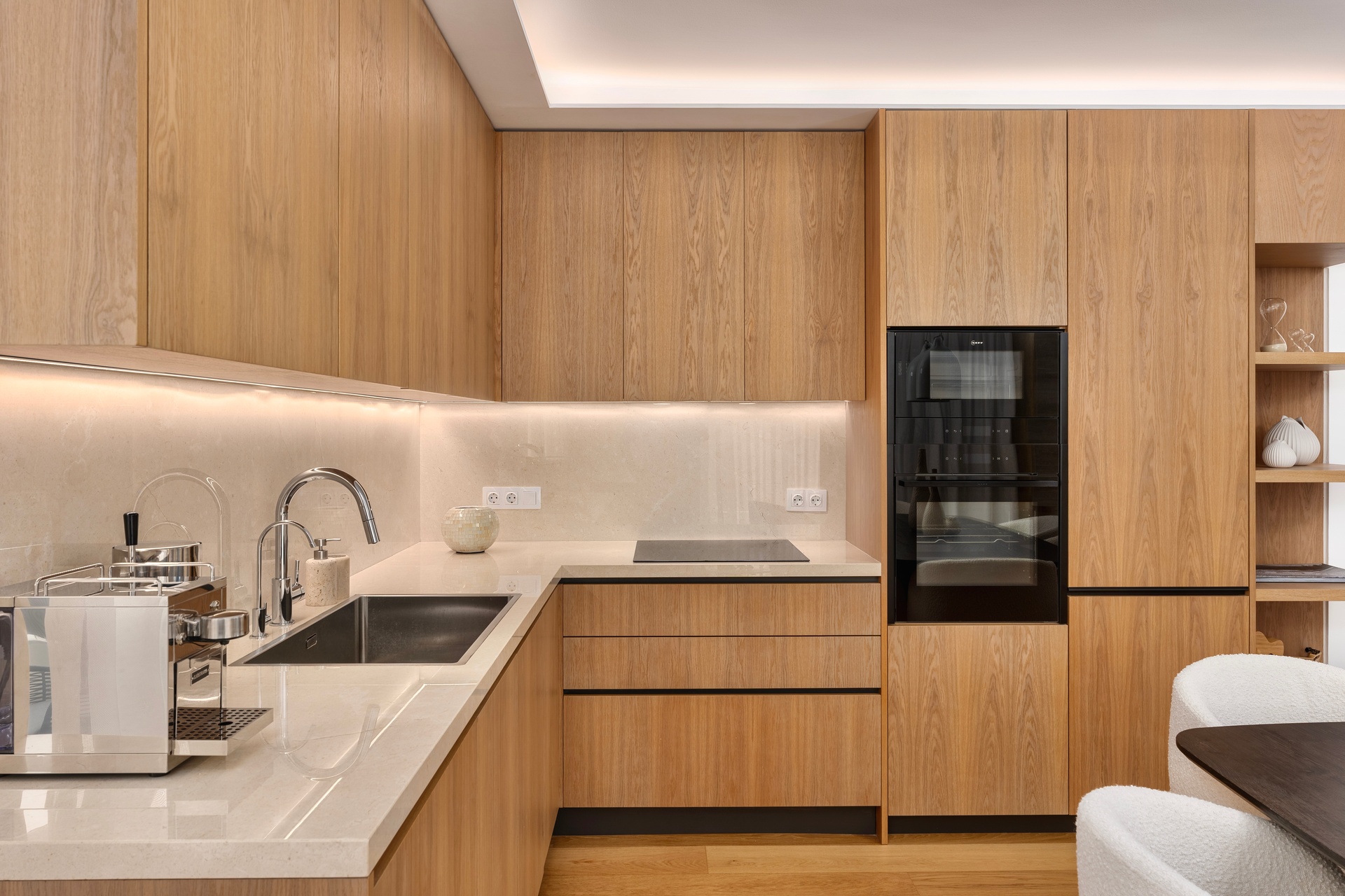 The main level welcomes you with a sunlit, south-facing living and dining area that flows onto a large terrace, creating an ideal setting for both relaxation and entertaining. The open-plan kitchen, crafted with natural stone and warm wood tones, is fitted with premium appliances and designed for everyday luxury.