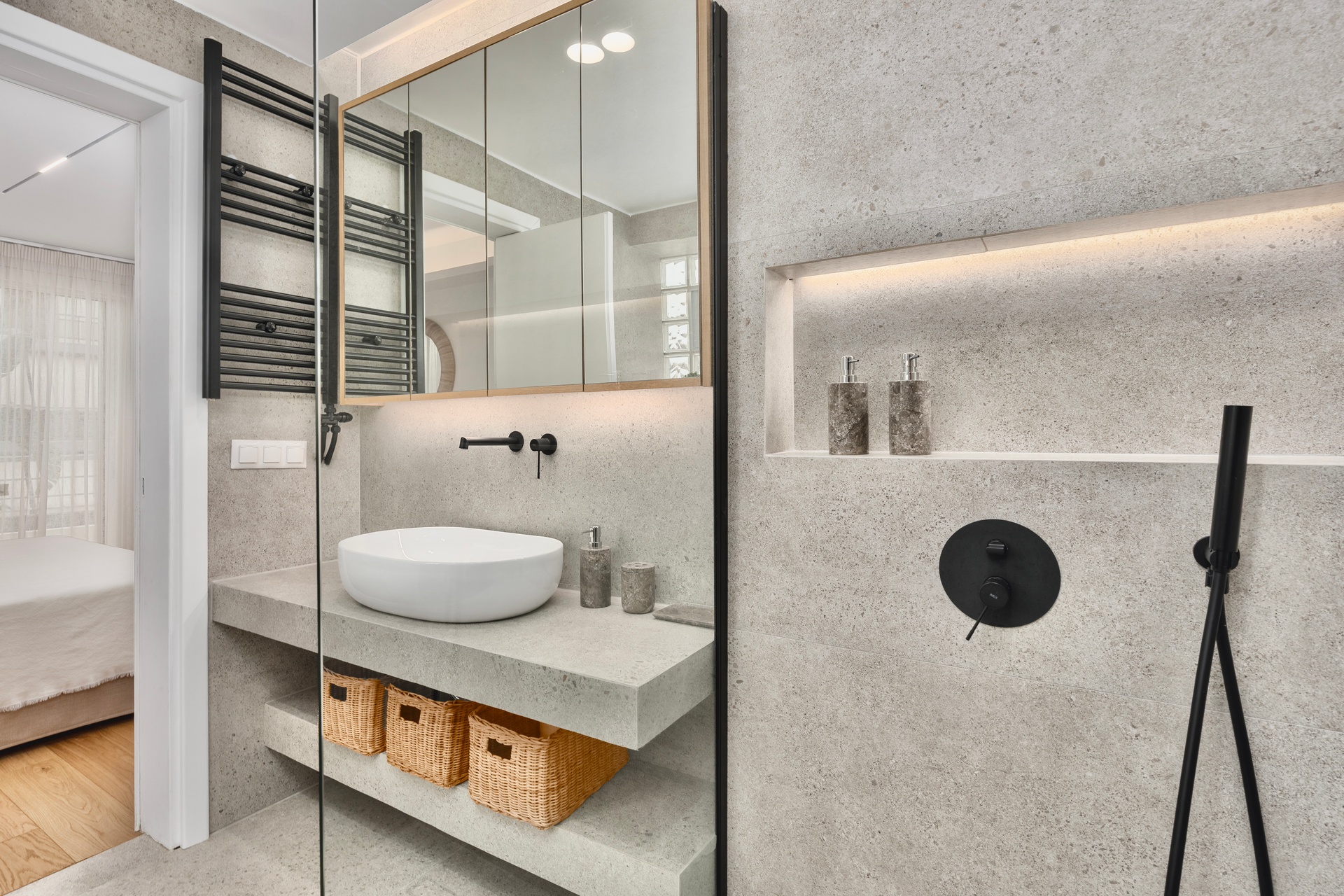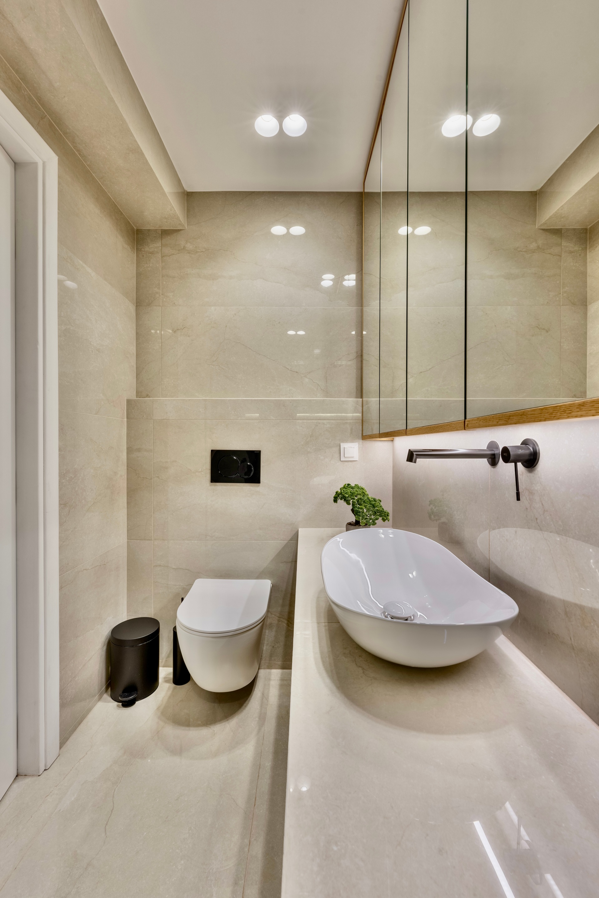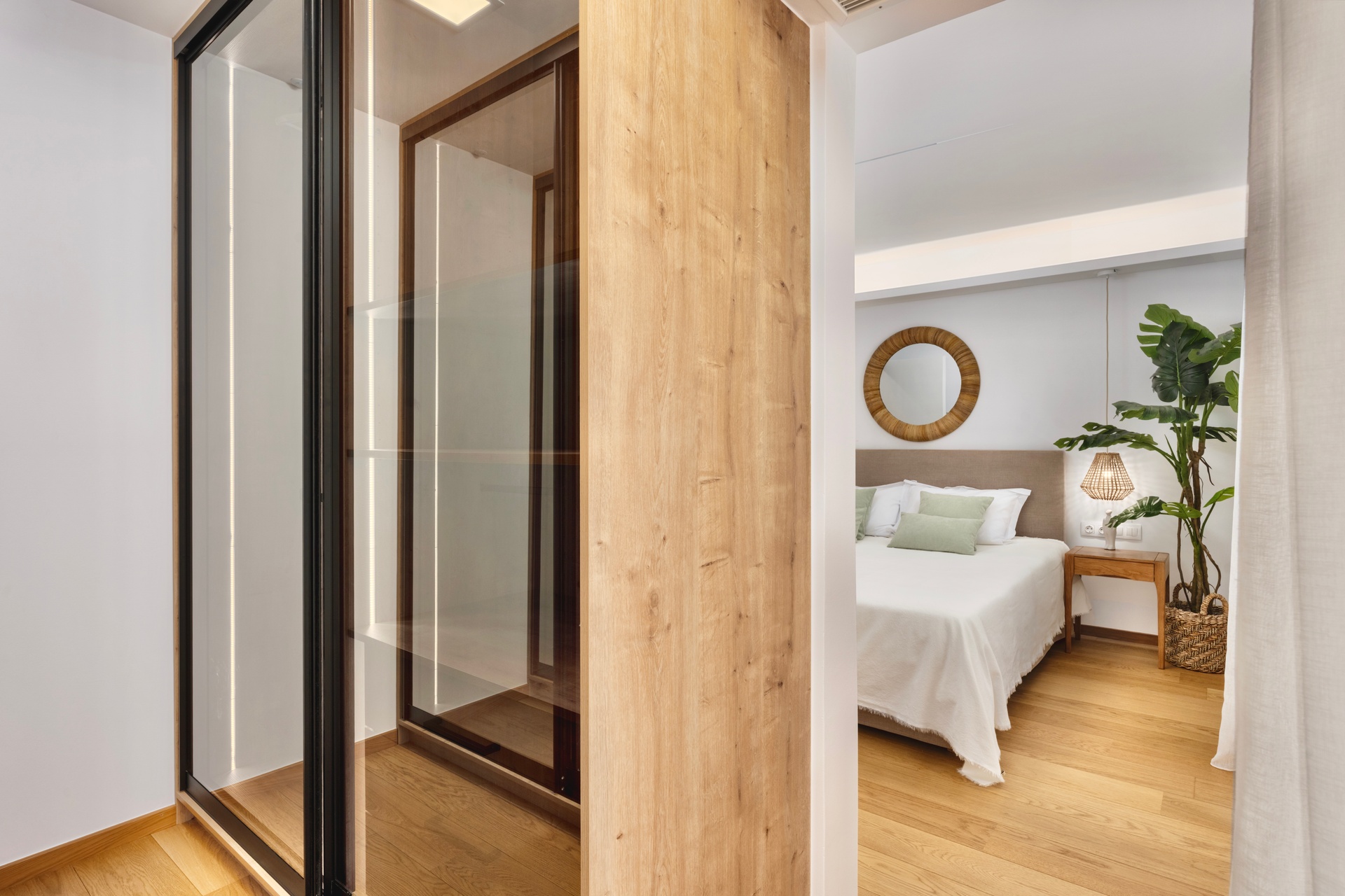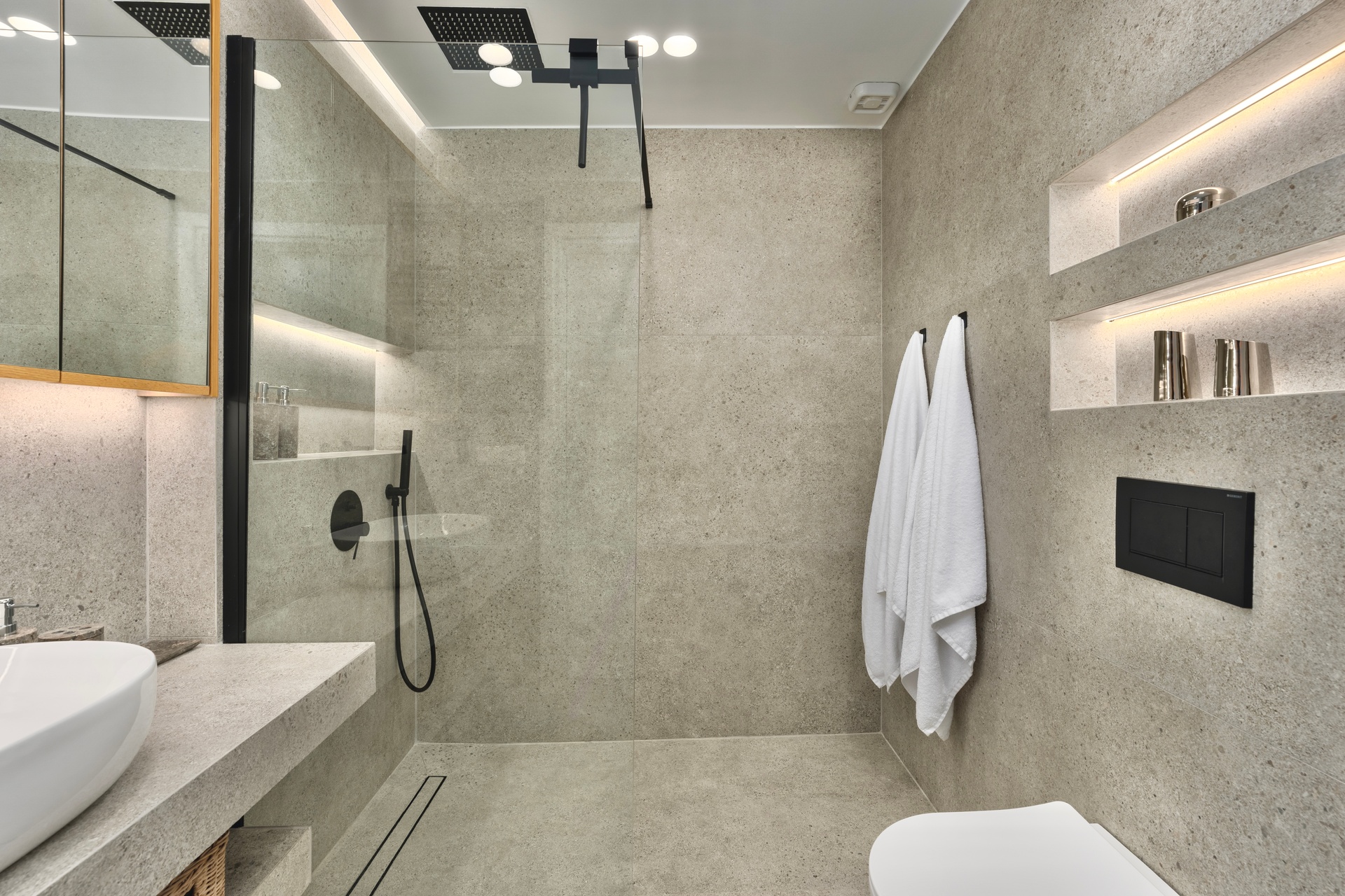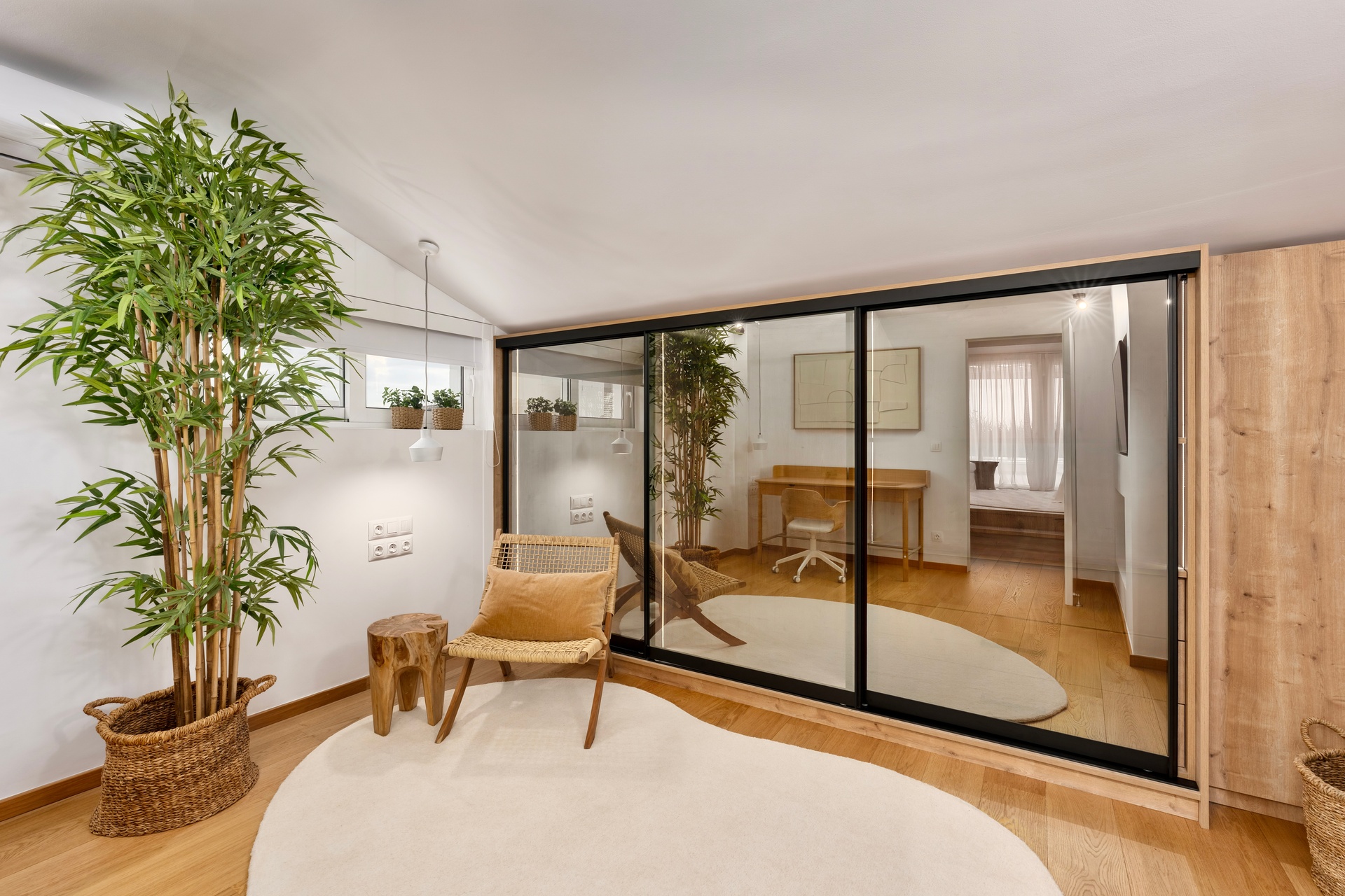 The main level welcomes you with a sunlit, south-facing living and dining area that flows onto a large terrace, creating an ideal setting for both relaxation and entertaining. The open-plan kitchen, crafted with natural stone and warm wood tones, is fitted with premium appliances and designed for everyday luxury.