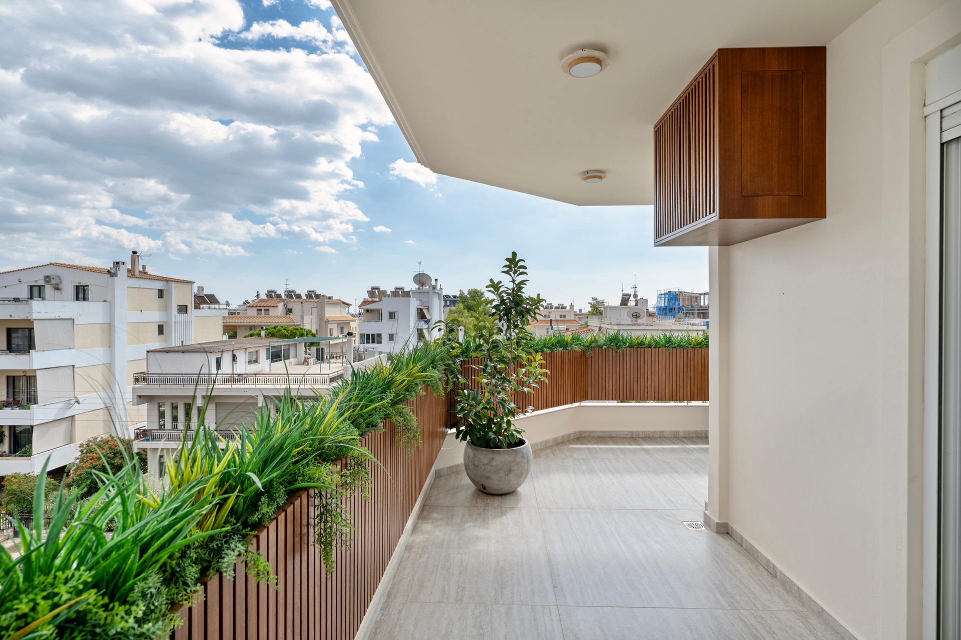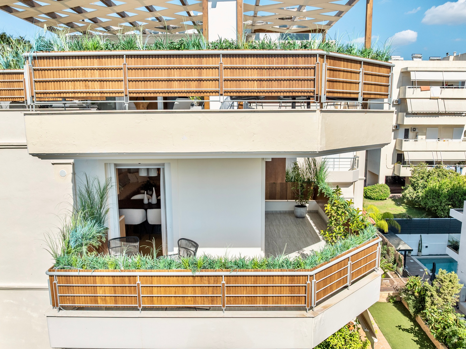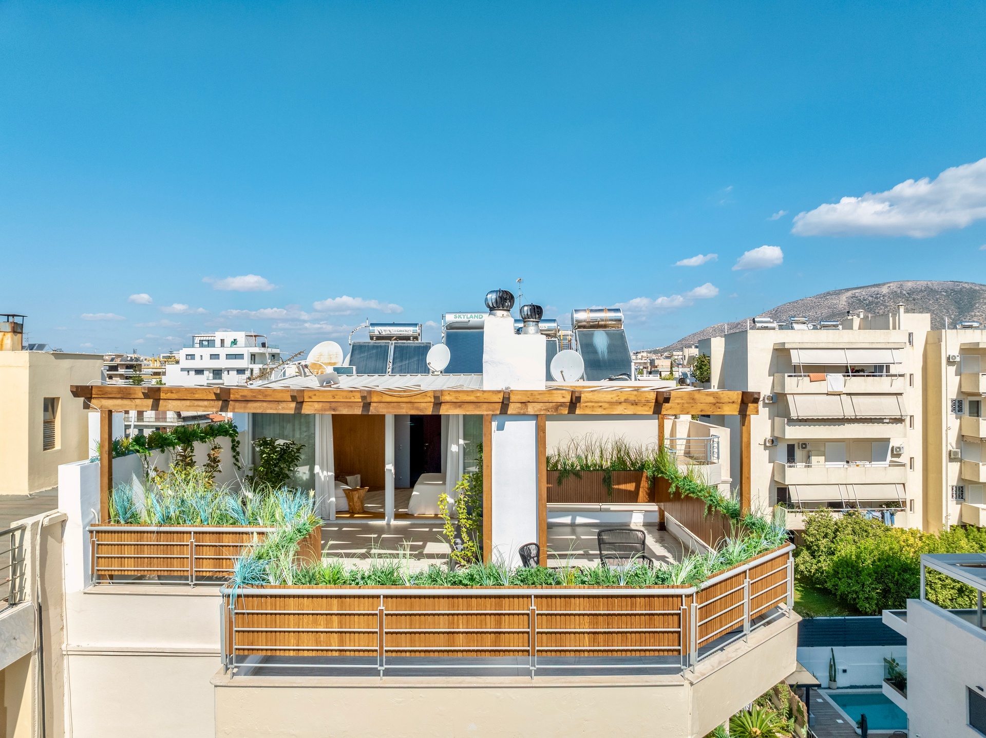 Positioned in one of Glyfada’s most desirable neighbourhoods, this fully renovated residence spreads across two beautifully curated floors, complemented by spacious terraces with captivating sea and mountain views from the verdant slopes of the Athenian hills to the sparkling Aegean.