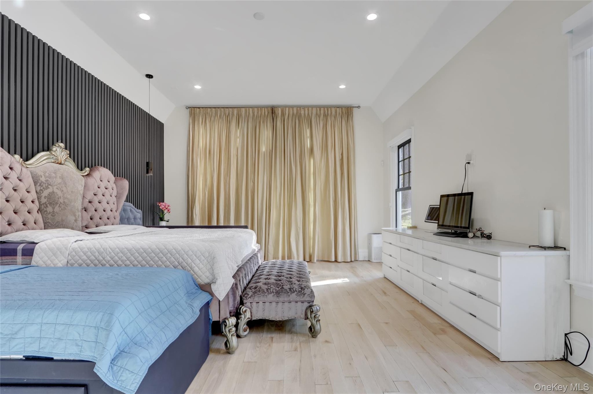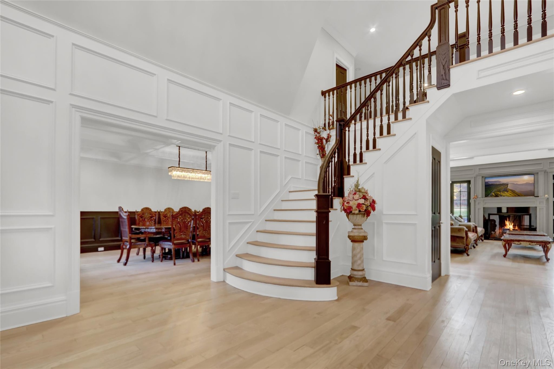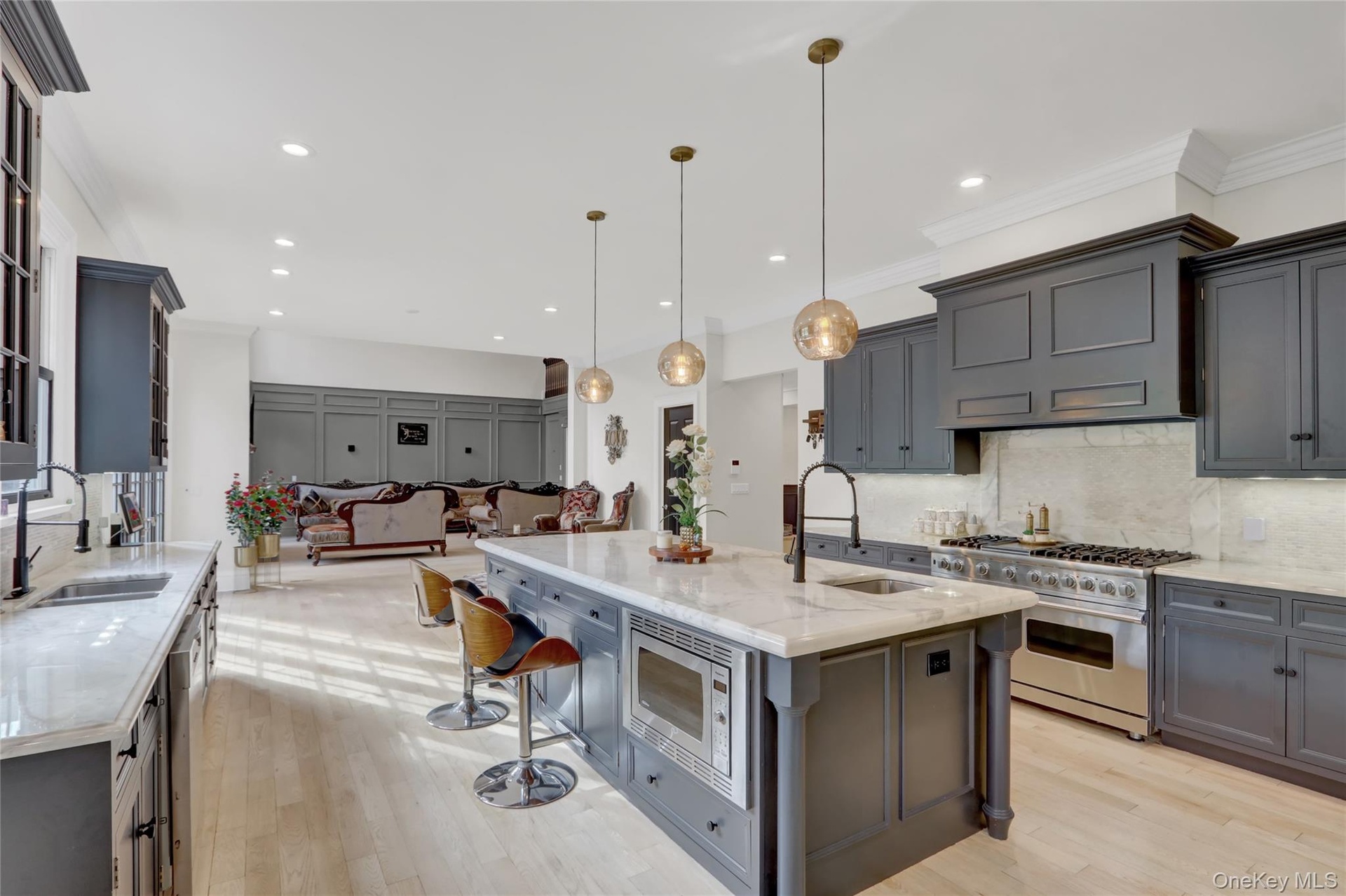 The grand foyer with 17-ft ceilings leads to sun-filled interiors featuring light oak floors, custom millwork, and soaring vaulted ceilings. The double-height living room with fireplace opens to expansive bluestone terraces. A formal dining room connects to an elegant butler’s pantry with wine cooler and ice maker.