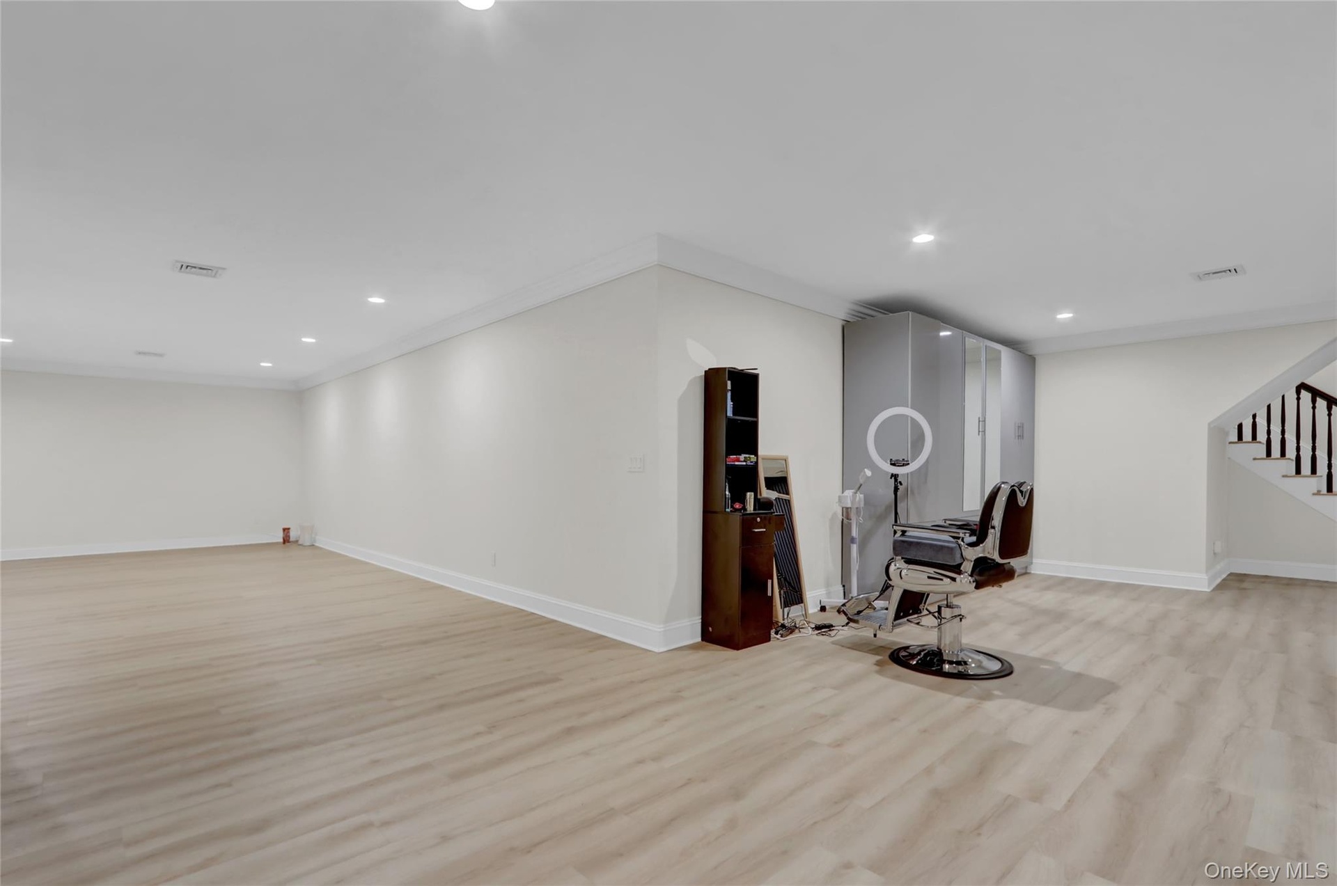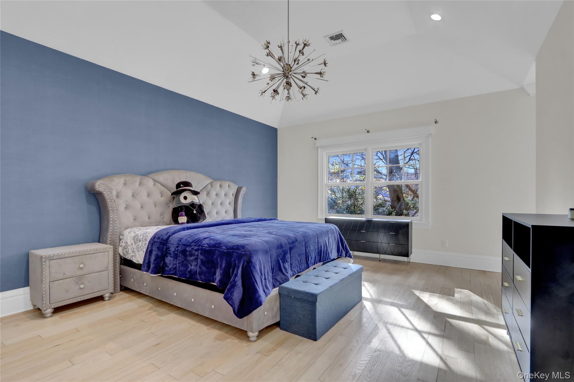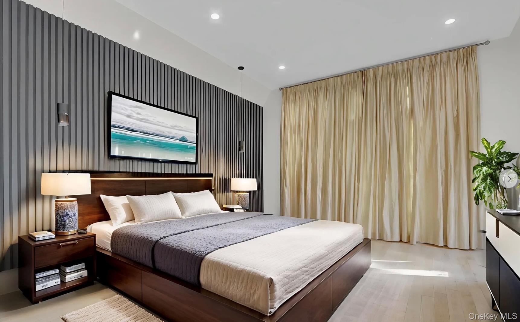 The grand foyer with 17-ft ceilings leads to sun-filled interiors featuring light oak floors, custom millwork, and soaring vaulted ceilings. The double-height living room with fireplace opens to expansive bluestone terraces. A formal dining room connects to an elegant butler’s pantry with wine cooler and ice maker.