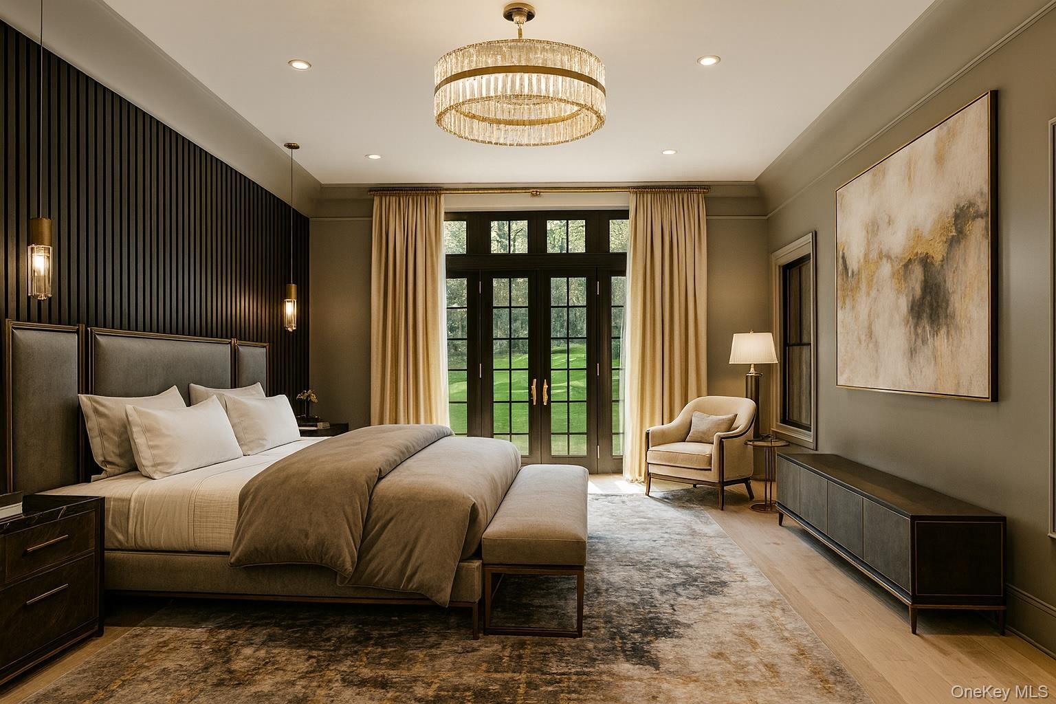 The chef’s kitchen showcases custom cabinetry, Calacatta marble countertops, top of the line appliances, massive center island, transitioning into a vaulted family room with wood-burning fireplace and French doors. The west wing primary suite includes custom dressing rooms, dual custom-style baths with rainfall showers, soaking tub, and heated floors, plus garden access.