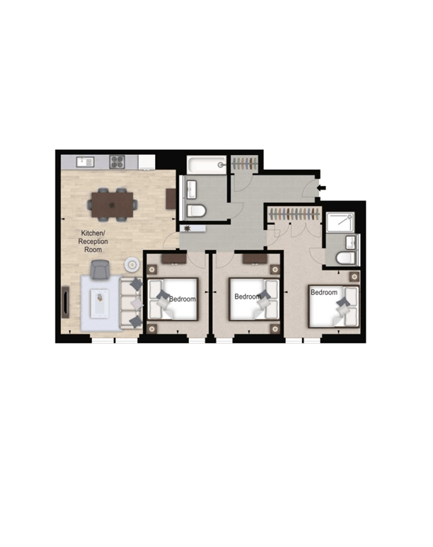 The master bedroom includes a luxurious en-suite bathroom, complemented by two further double bedrooms and a guest bathroom. Every room has been thoughtfully designed with bespoke storage and high-quality finishes, reflecting understated elegance and modern convenience.
