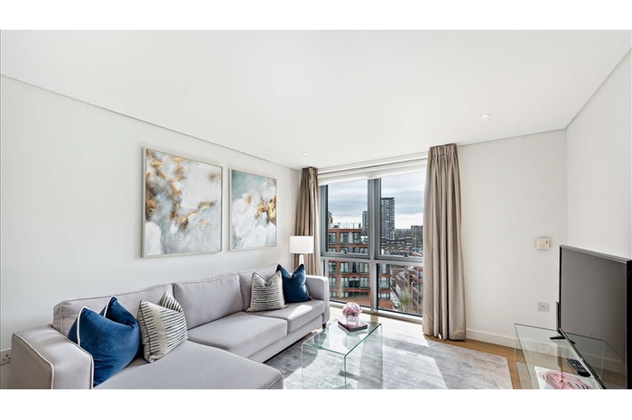 Arranged on the eighth floor of this prestigious development, the apartment features an expansive open-plan reception and dining area flowing seamlessly into a modern, fully fitted kitchen. Large windows capture stunning water views, creating a bright and inviting space perfect for entertaining or relaxing in style.