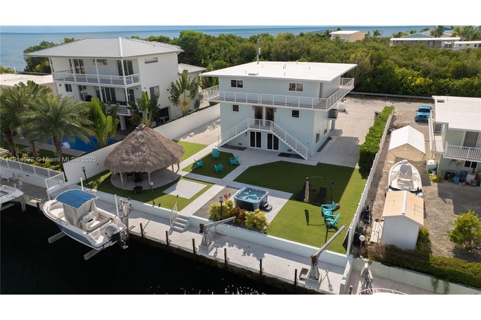 Discover this unique and versatile property in Port Largo, featuring a remarkable legal duplex with breathtaking ocean views. Each side-by-side townhome includes 2 bedrooms and 2.5 bathrooms, with all bedrooms thoughtfully designed as en-suites for ultimate privacy and comfort. With 75 feet of waterfrontage, concrete dock with 20K lbs boat lift. The wide 80 ft deep-water canal provides direct ocean access to the world-famous Key Largo waters ideal for boating, fishing, and diving. Downstairs, you'll find a spacious 760 sq ft storage and a Tiki Hut, perfect for outdoor relaxation. Each side has its own separate electric and water meters. Furniture negotiable. This property boasts excellent rental potential and is also perfect for two families looking to share a second home. Owner/Agent.