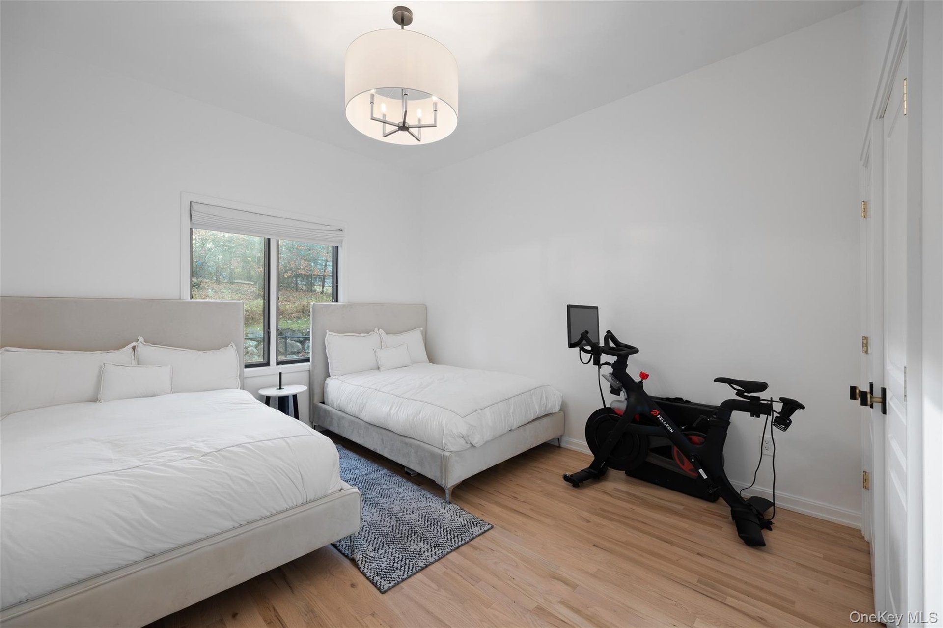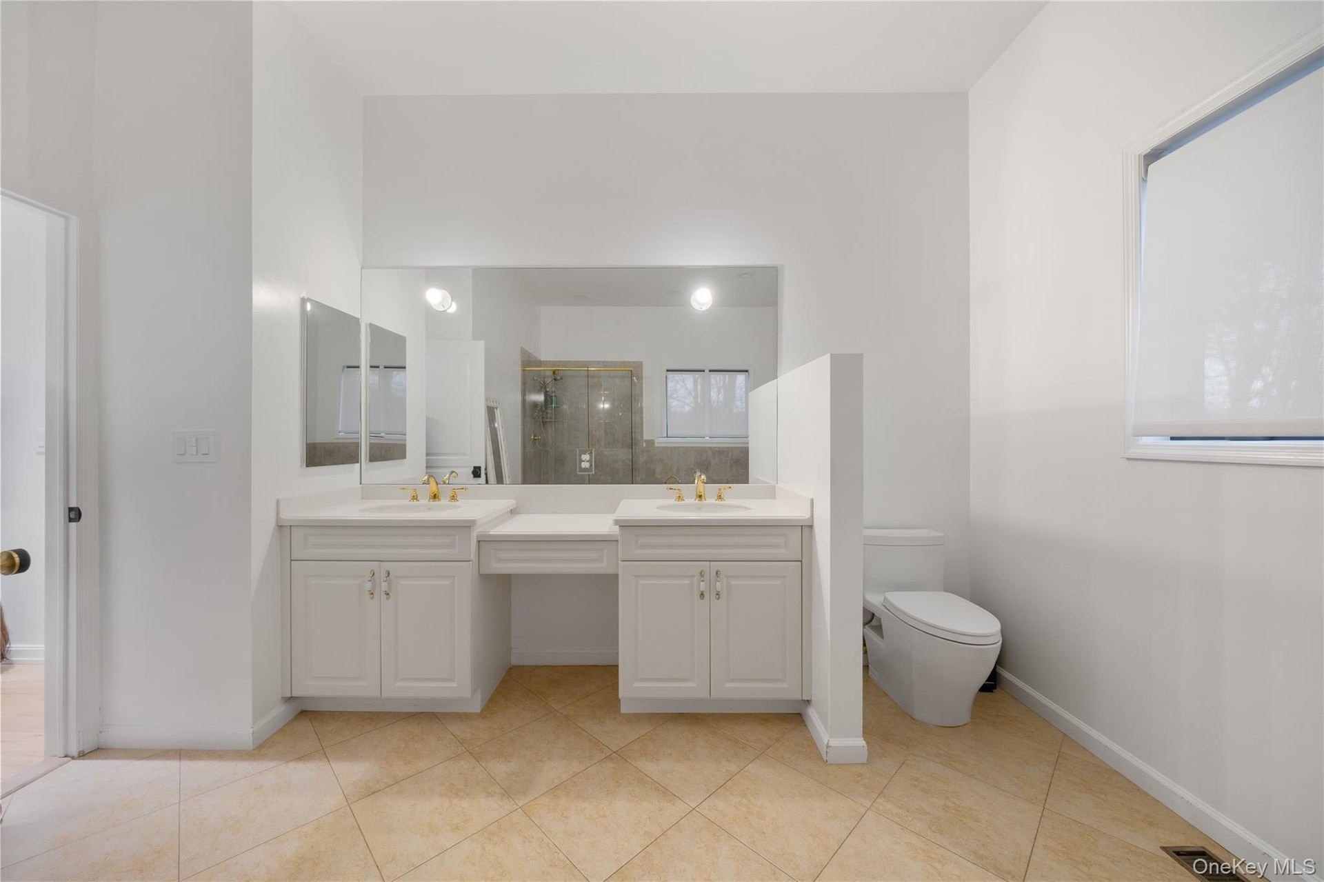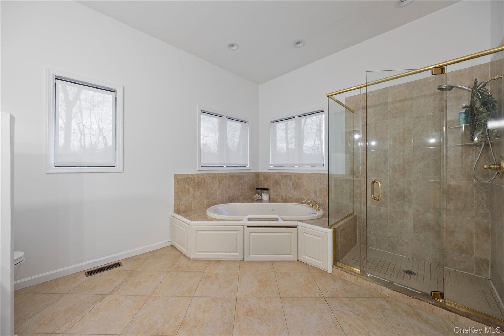 The private bedroom wing includes two spacious bedrooms and a full bath. The luxurious primary suite features a walk-in closet, vanity area, jacuzzi tub, and glass shower. A fourth bedroom connects to a powder room with space to add a shower.