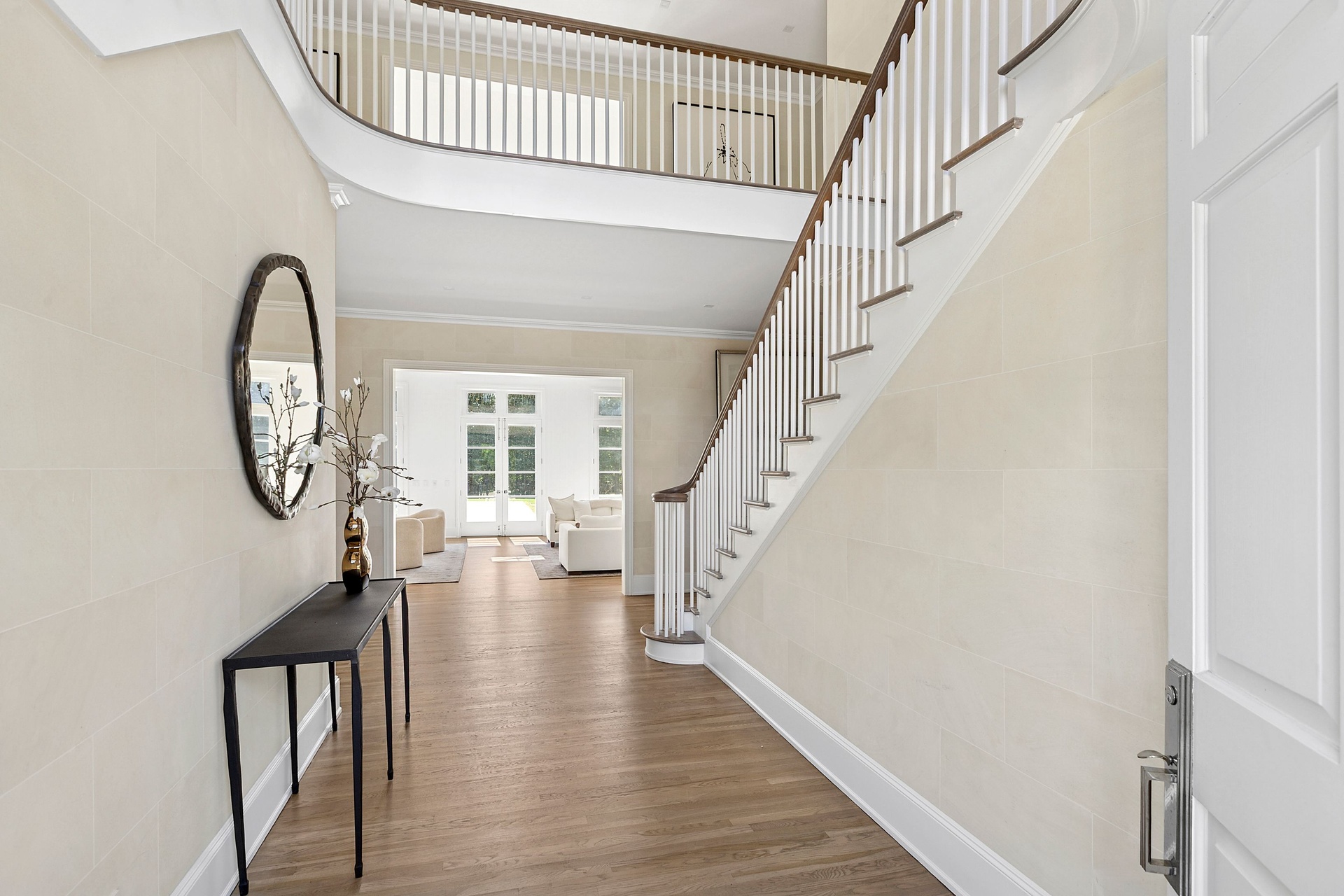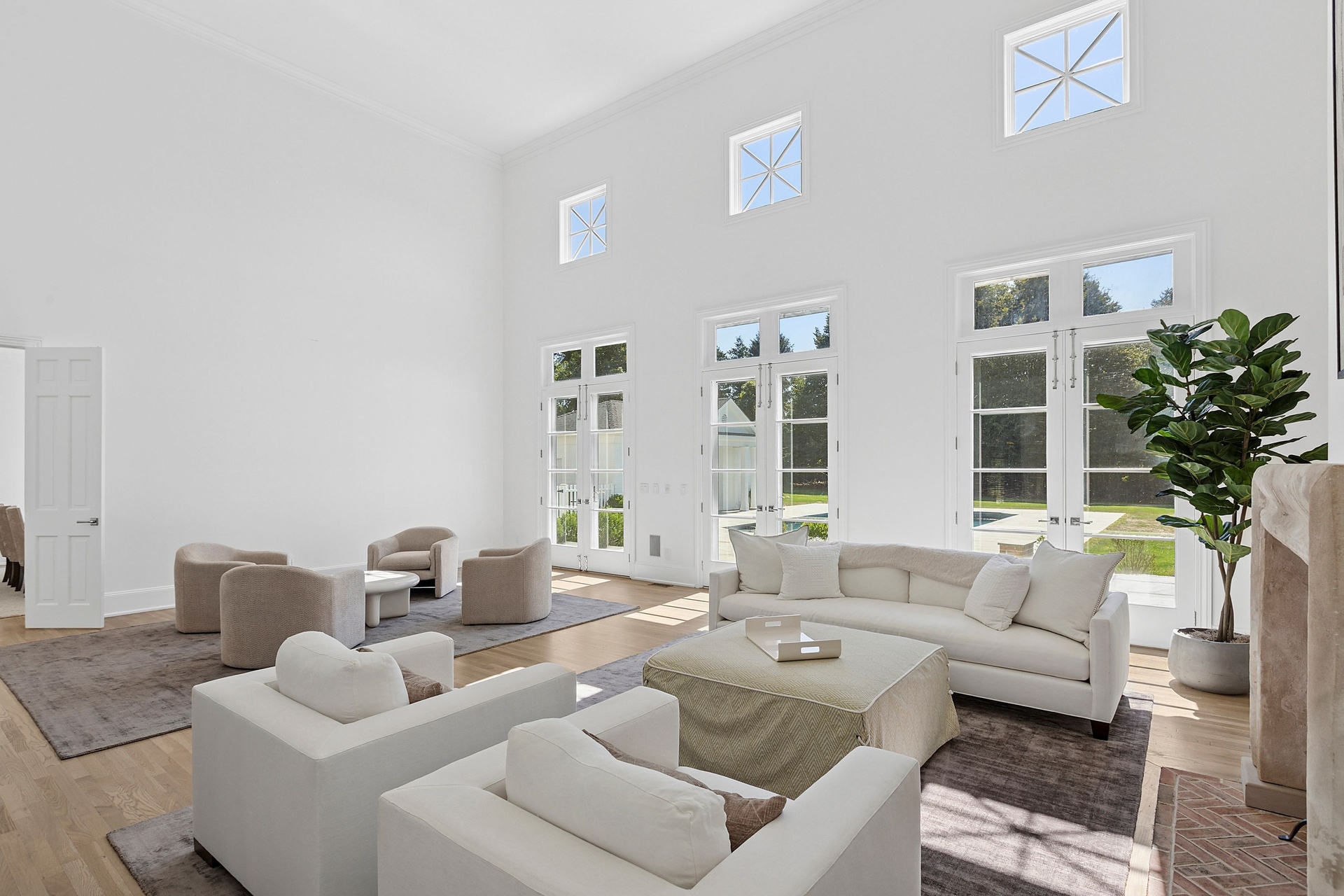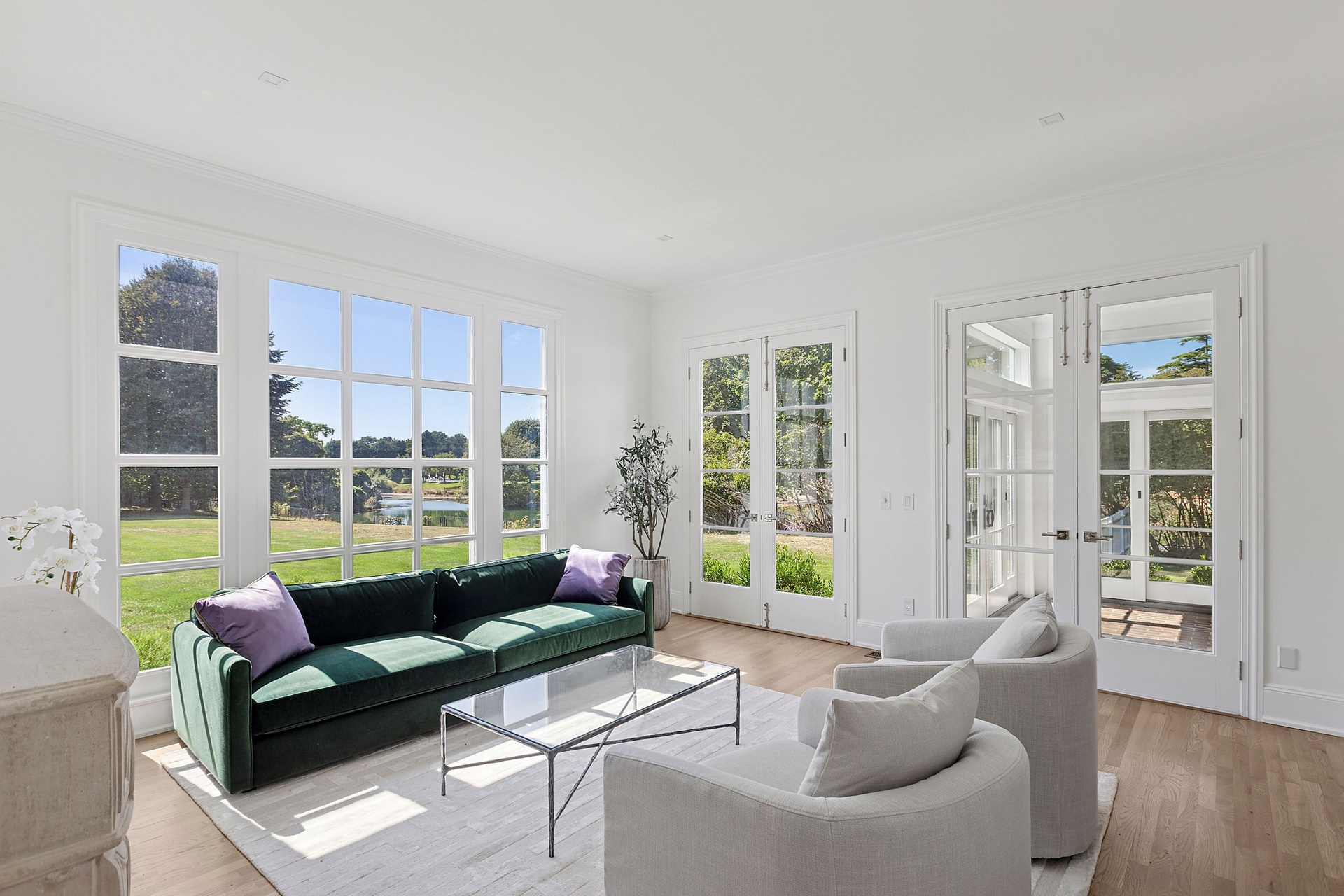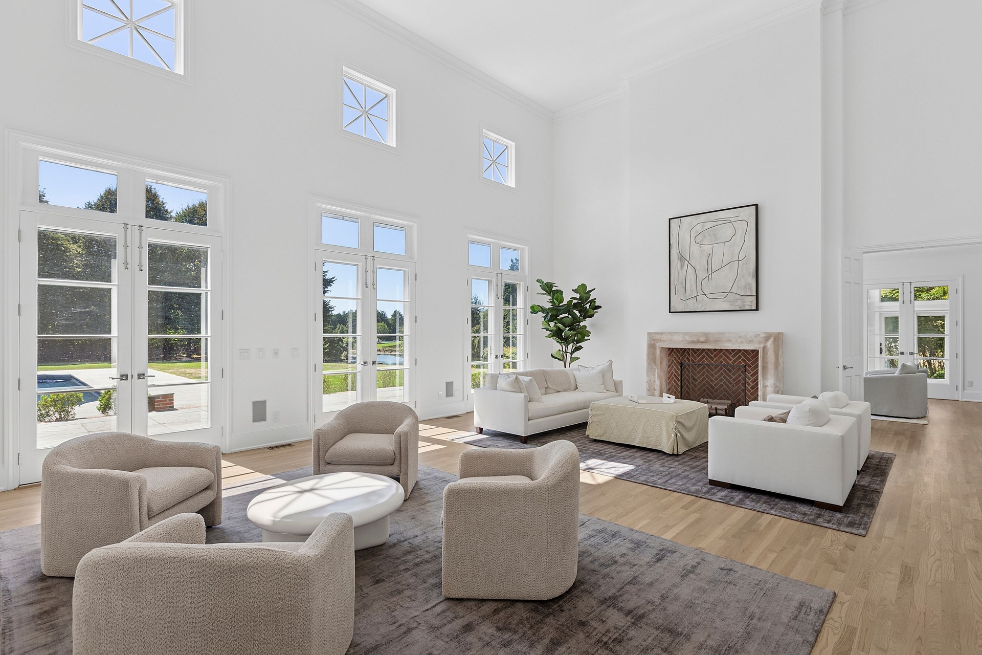 The double-height entry hall sets the tone, flooded with natural light that pours in from every direction thanks to a thoughtfully opened and cleared landscape. Sightlines extend through the great room’s towering ceilings and over a dozen French doors that lead to stone patios, expansive lawns, and serene water views. Throughout this 5,000± square-foot residence, matte-finished hardwood floors, custom millwork, and refined lighting create a warm, modern elegance that feels both curated and inviting.