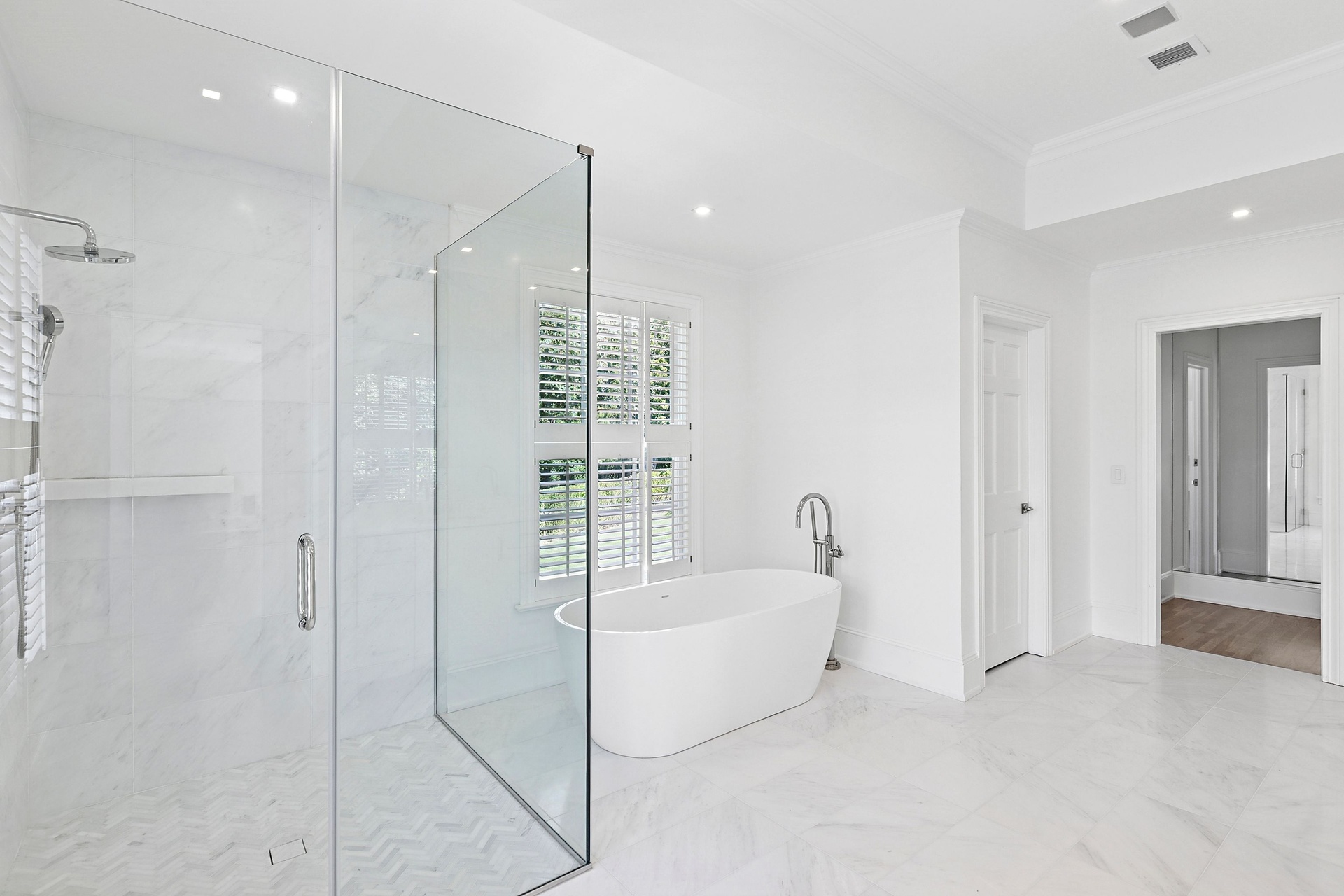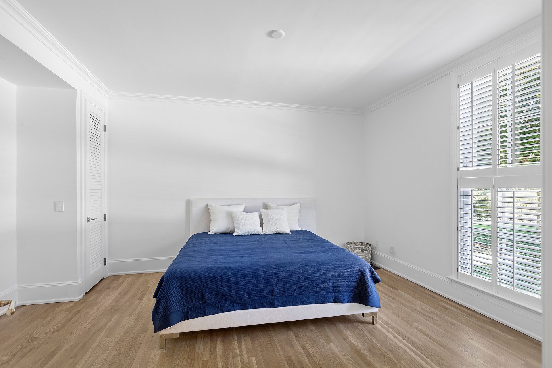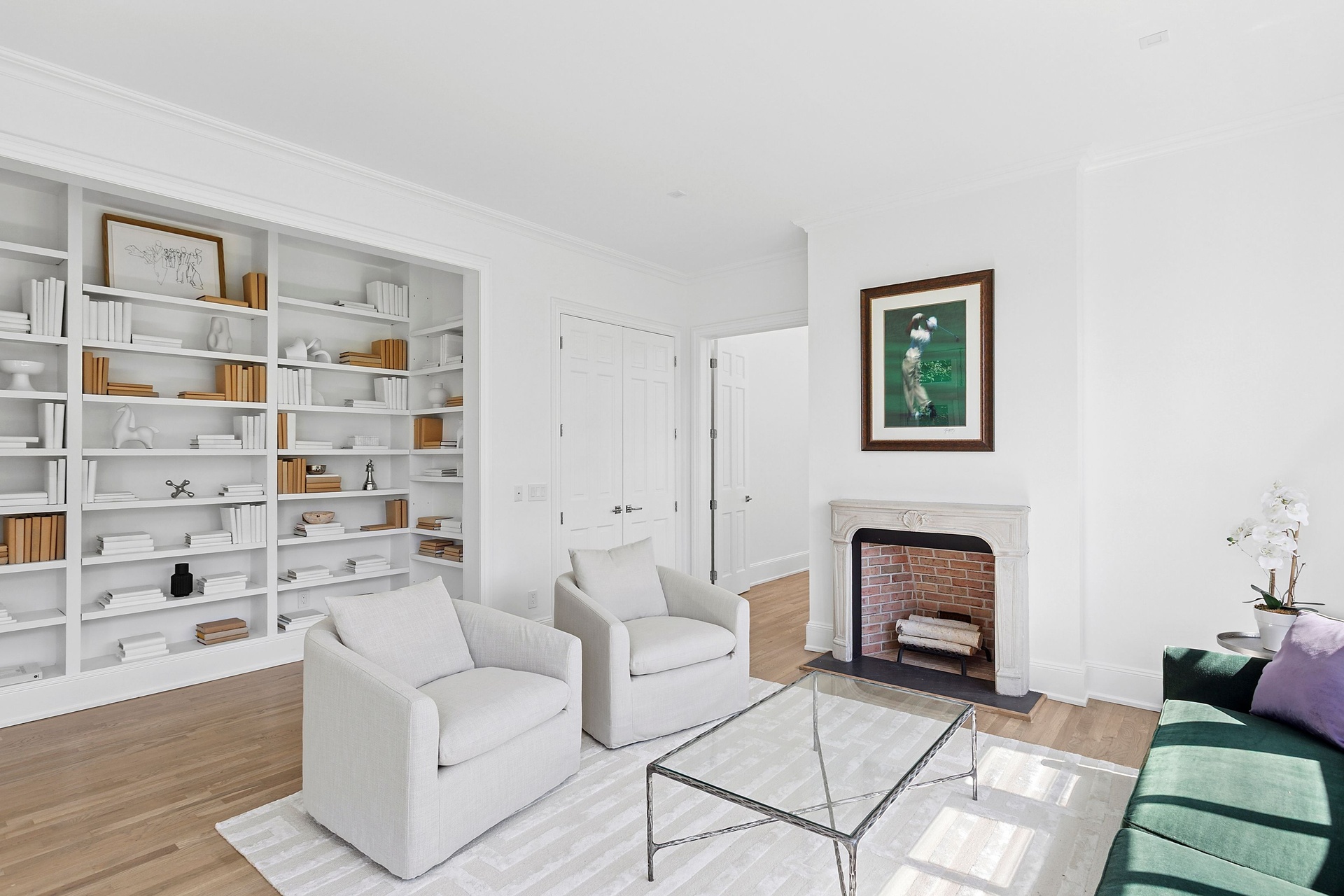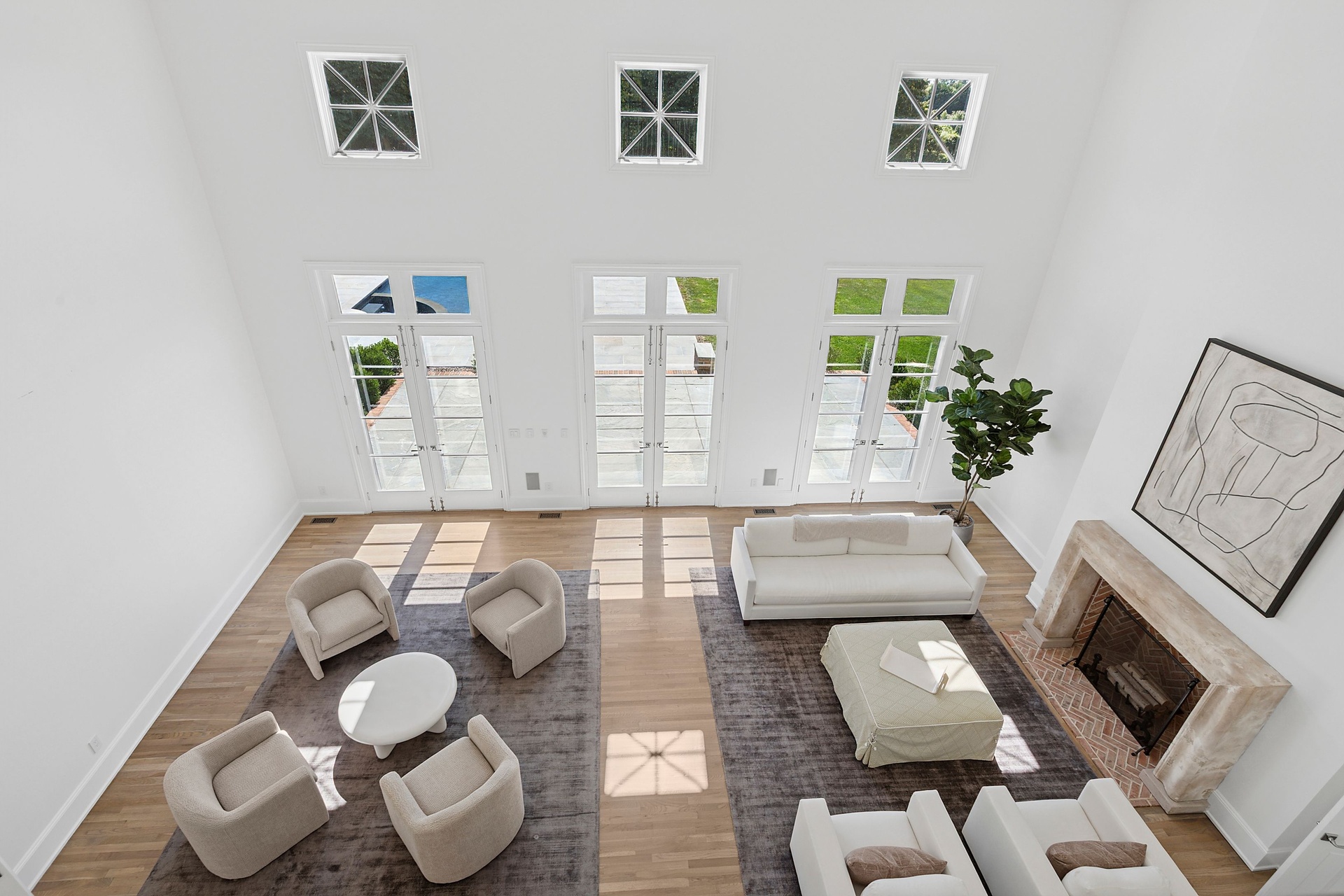 The double-height entry hall sets the tone, flooded with natural light that pours in from every direction thanks to a thoughtfully opened and cleared landscape. Sightlines extend through the great room’s towering ceilings and over a dozen French doors that lead to stone patios, expansive lawns, and serene water views. Throughout this 5,000± square-foot residence, matte-finished hardwood floors, custom millwork, and refined lighting create a warm, modern elegance that feels both curated and inviting.