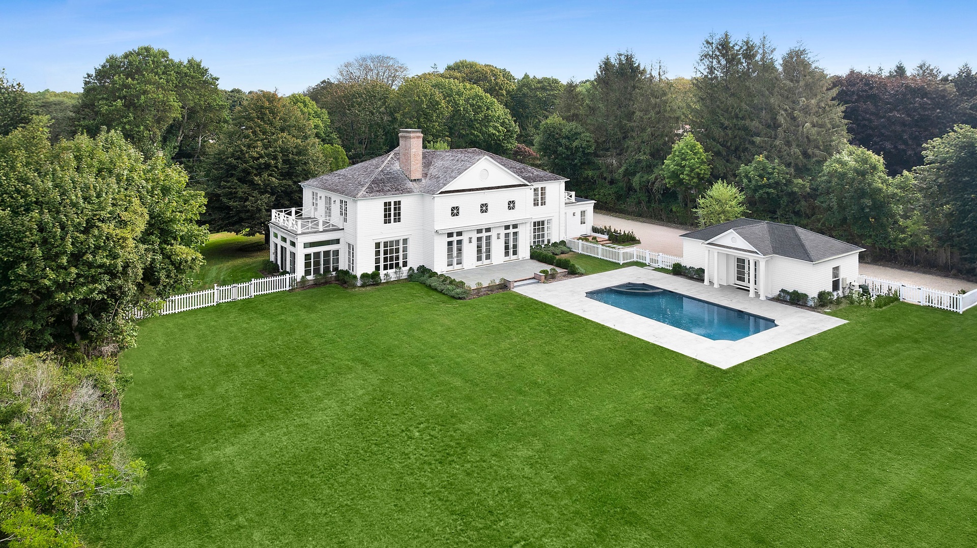 Outside, the property is a sanctuary unto itself. Wide lawns stretch toward the water, bordered by mature trees and lush, meticulously refreshed landscaping. The newly enhanced pool features an in-pool spa. It is anchored by a fully renovated pool house, offering a sitting area, changing room, separate shower, and WC—perfectly designed for days spent on the terrace or evenings entertaining at sunset.