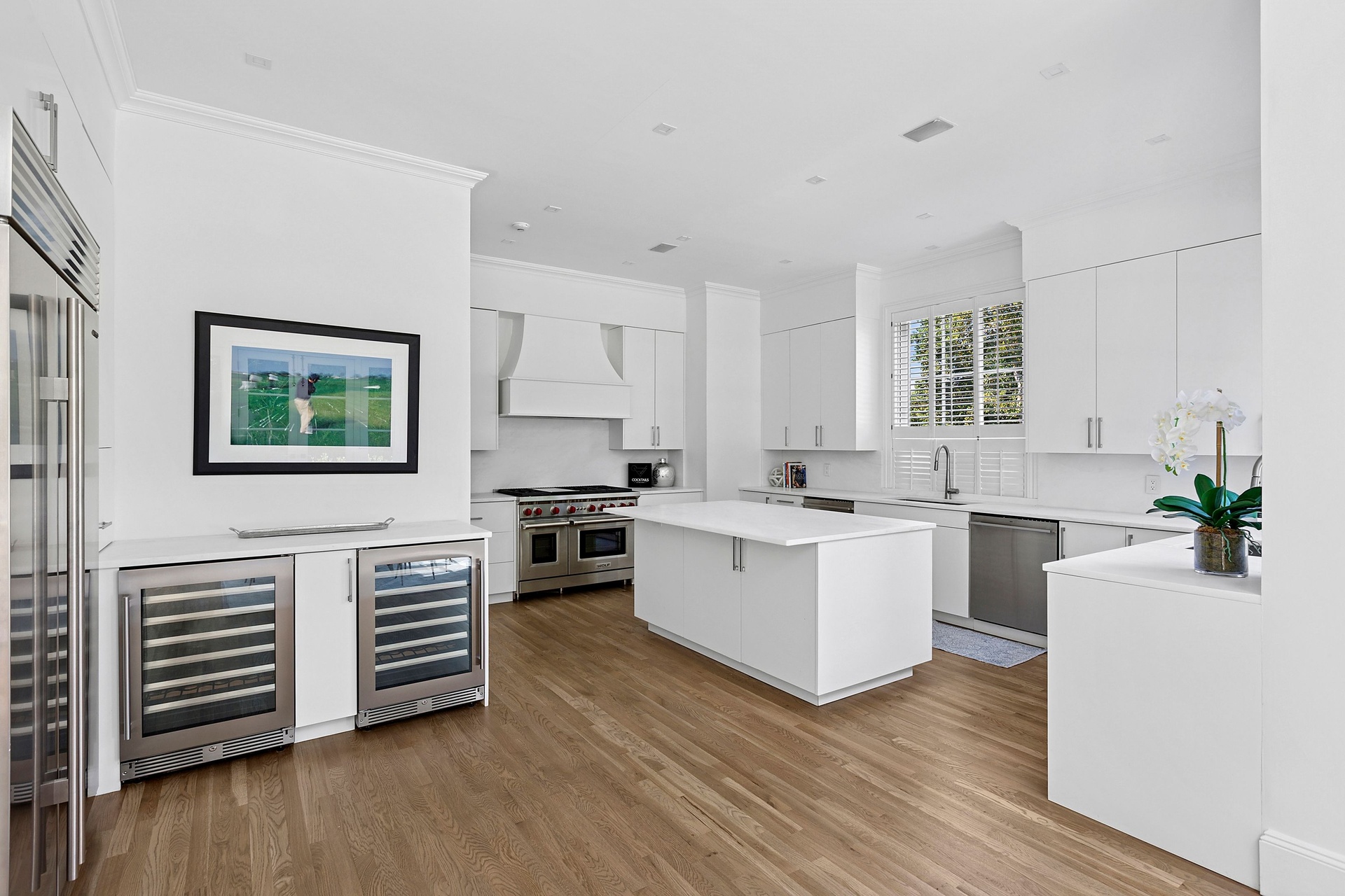 At the heart of the home, the brand-new chef’s kitchen blends clean design with professional-grade functionality. Marble countertops sweep across crisp custom cabinetry, framing a full suite of premium appliances, including a Wolf range, dual dishwashers, convection and microwave ovens, a Sub-Zero refrigerator/freezer, and under-counter beverage coolers. A breakfast area surrounded by glass opens to the gardens, completing a space tailor-made for gatherings both casual and elevated.