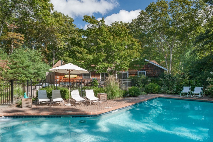 The indoor living room offers plenty of seating for movie night or entertaining, adjacent to a large open eat-in kitchen with skylight and glass sliding doors opening out to the back patio. Relax next to the wood burning fireplace in the den with skylight, high ceilings, and glass sliding doors looking out to the back yard and pool area. The first-floor master has an en suite bath, while both guest (queen size) bedrooms share the nearby guest bath. At the end of a long tree-lined driveway, this private property offers plenty of space for your cars, paddle boards, kayaks, and toys.