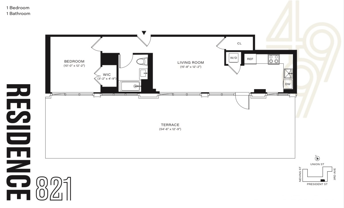 Welcome to the only south-facing one-bedroom residence of its kind with a private outdoor terrace in this brand-new building in Gowanus, Brooklyn.