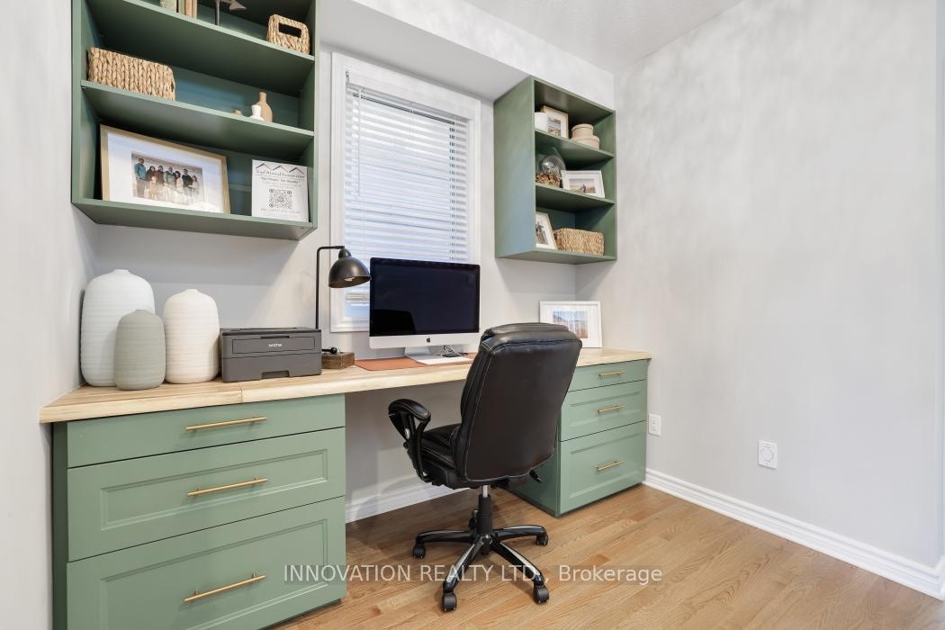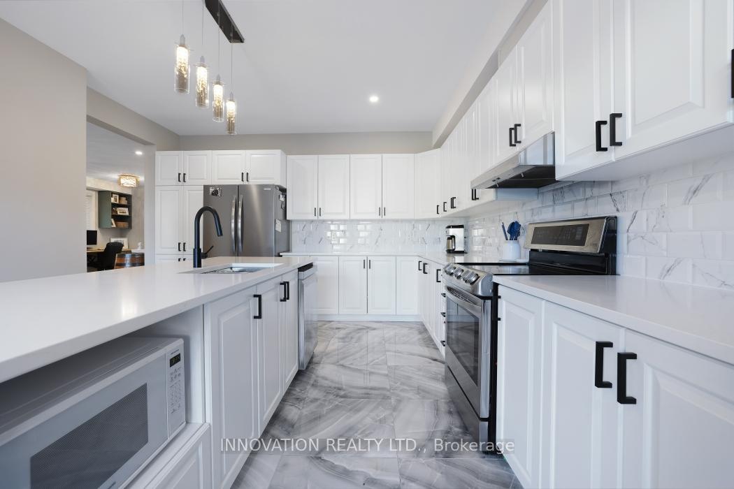 PRICED TO SELL! Approx 2400 sq ft ABOVE GRADE. Imagine living in this super spacious home with main floor home office space! This home offers a very flexible floor plan for family living & entertaining. Soaring 9' ceilings on the main floor highlight the bright and airy feel throughout. The main floor den features custom cabinetry, perfect for work at home or as a homework station. New quartz counters in the HUGE kitchen with French doors to the raised deck; great for barbecues. Feed the family or let your guests enjoy a glass of wine & conversation at the huge center island while you prepare a meal. The great room features an architecturally inspired ceiling with French doors to the other side of the deck. The over-sized family room features a floor-to-ceiling tiled gas fireplace. Brand new hardwood flooring was installed on the upper levels. The primary suite is super spacious with spa-like ensuite. There is a jack 'n jill bathroom to for the secondary bedrooms or turn one side back into the laundry area! The garage is insulated and heated to serve as a workshop, if you like! The lower level has over-sized windows with a rough-in for another bathroom. Immediate occupancy is available!
