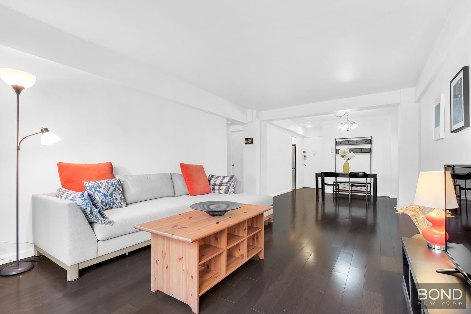 NEW LISTING! SHOWINGS BY APPOINTMENT THROUGHOUT THE HOLIDAY WEEKEND! Size matters! This massive furnished true 1-bedroom co-op for rent features an ultra-spacious living room with beamed ceilings and two large closets, plus a separate windowed dining area. The immense bedroom has two closets and easily accommodates a queen size bed plus an array of additional furniture. The renovated kitchen features granite counter tops and backsplash, a ceramic tile floor and stainless steel appliances, including a microwave; the updated bath has a pedestal sink, enhanced lighting and a bidet. This bright and tranquil corner home, which features walls of north-facing windows in the living room and bedroom and a west-facing window in the dining area, is move-in ready, with new floors and air conditioners, and window treatments and furniture included.