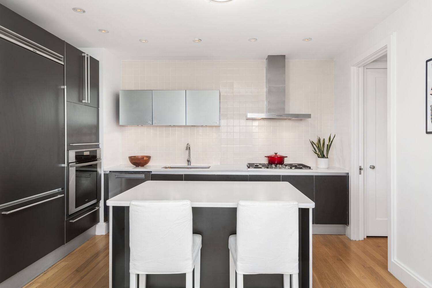 The chef's eat-in kitchen is a standout, featuring a sleek island perfect for casual dining, along with top-of-the-line appliances including a Viking refrigerator and Miele oven and cooktop. Ample counter and cabinet space complete this thoughtfully designed culinary space.