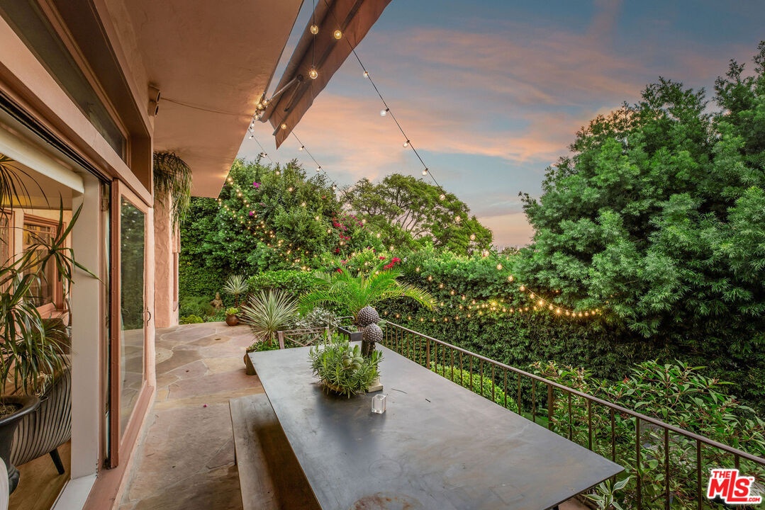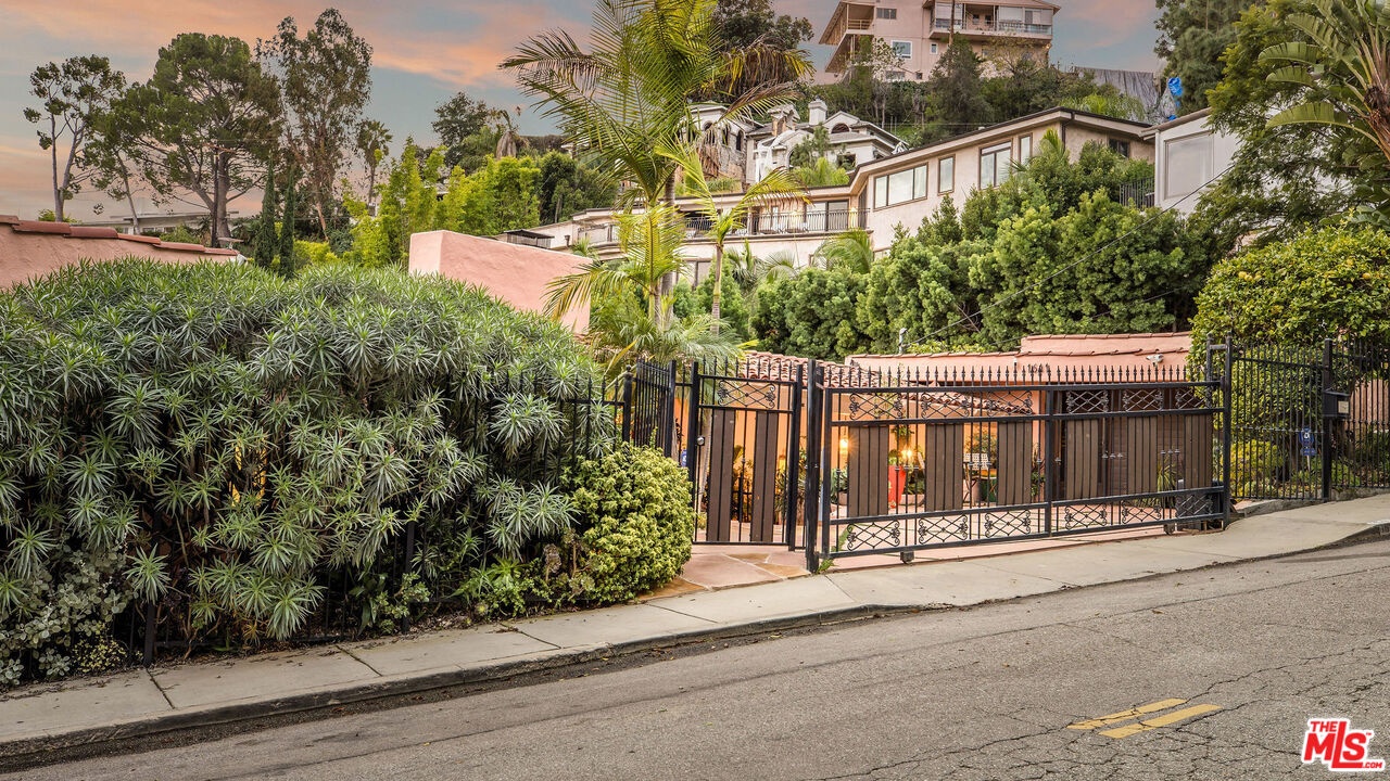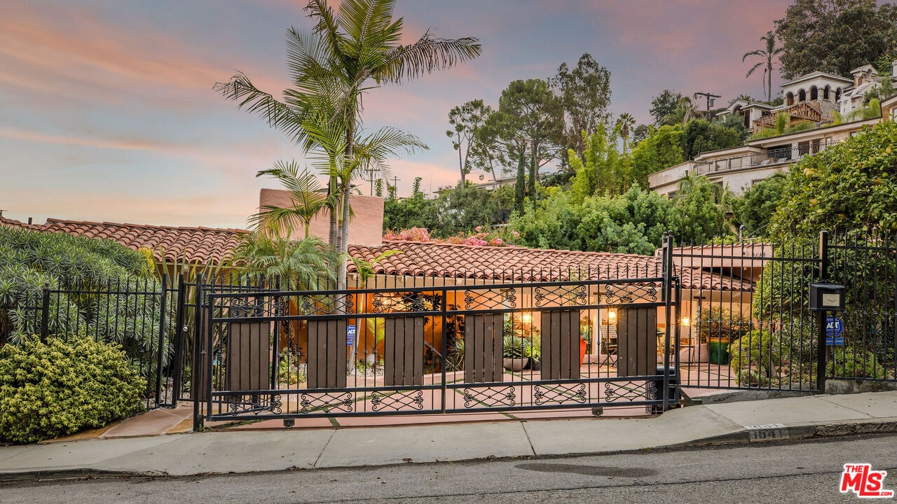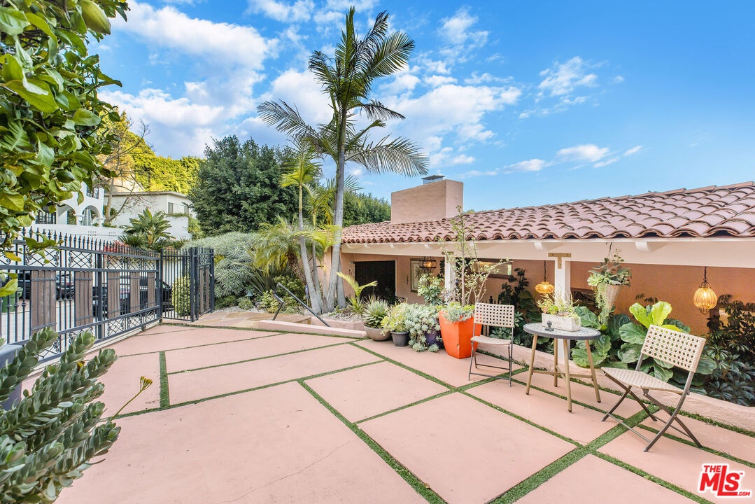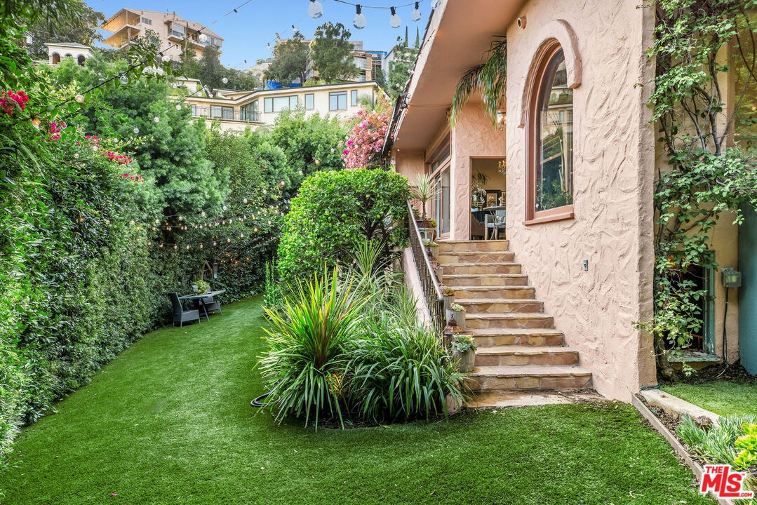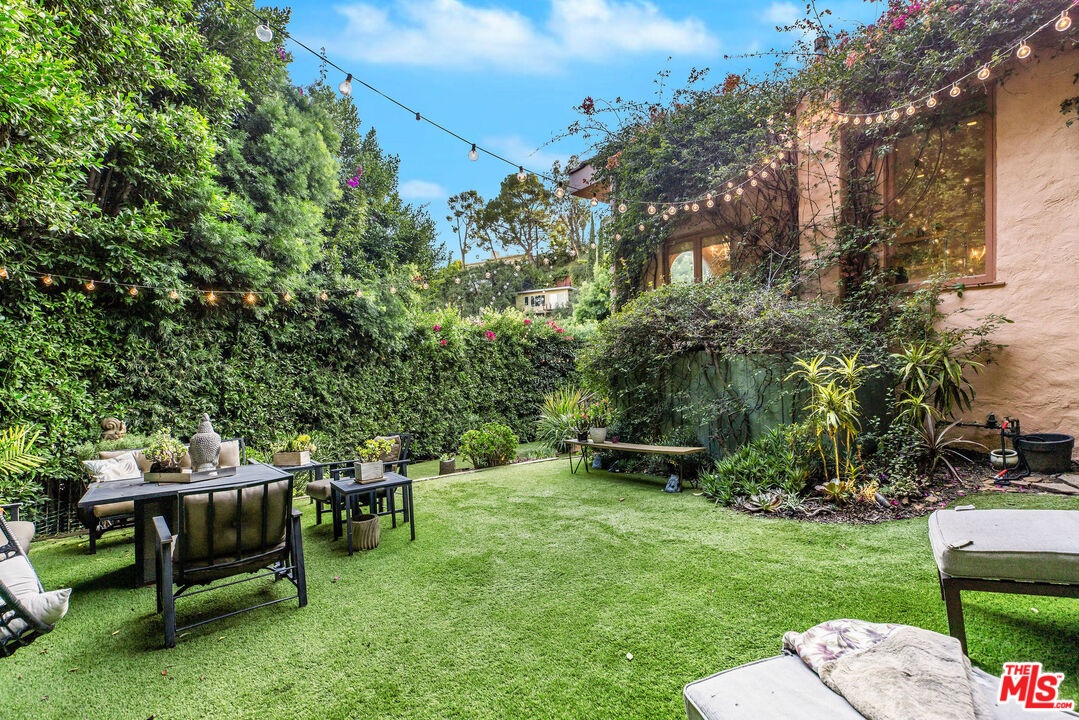 Step inside this classic Hollywood Hills Spanish and it immediately wraps you in that old-world magic everyone wants but hardly ever finds. You enter through a charming foyer anchored by a statement chandelier, then flow into a bright and airy living room with garden-facing windows, a beautiful fireplace, and warm hardwood floors that set the tone for the entire home. To the left, a character-filled dining room with built-in bookshelves leads to a thoughtfully updated kitchen with stone countertops, stainless steel appliances, and a huge picture window that pours in natural light. Just off this wing sits a guest bedroom with a full bath and laundry connections, ideal for visitors or a private office. Down the main hallway are three more bedrooms. The ensuite sits quietly on its own with a generous closet, and two additional bedrooms complete the layout, one with French doors that open directly to the garden. Step outside and the home transforms into its own hillside retreat. The main patio overlooks multiple entertaining terraces, each framed by lush greenery and draped in romantic string lights. There's a tranquil fountain, a dining area, and a charming casita-style nook that feels straight out of the Chateau Marmont. Below the main level, you'll find a bonus basement area with abundant storage plus its own washer and dryer a rare functional perk in the Hills. The garage has been converted into a bonus space with a half bath, perfect as a guest suite, creative studio, game room, or anything your life needs it to be. The property is gated, sits on an oversized lot, and captures the warmth and character of true Spanish Mediterranean architecture.