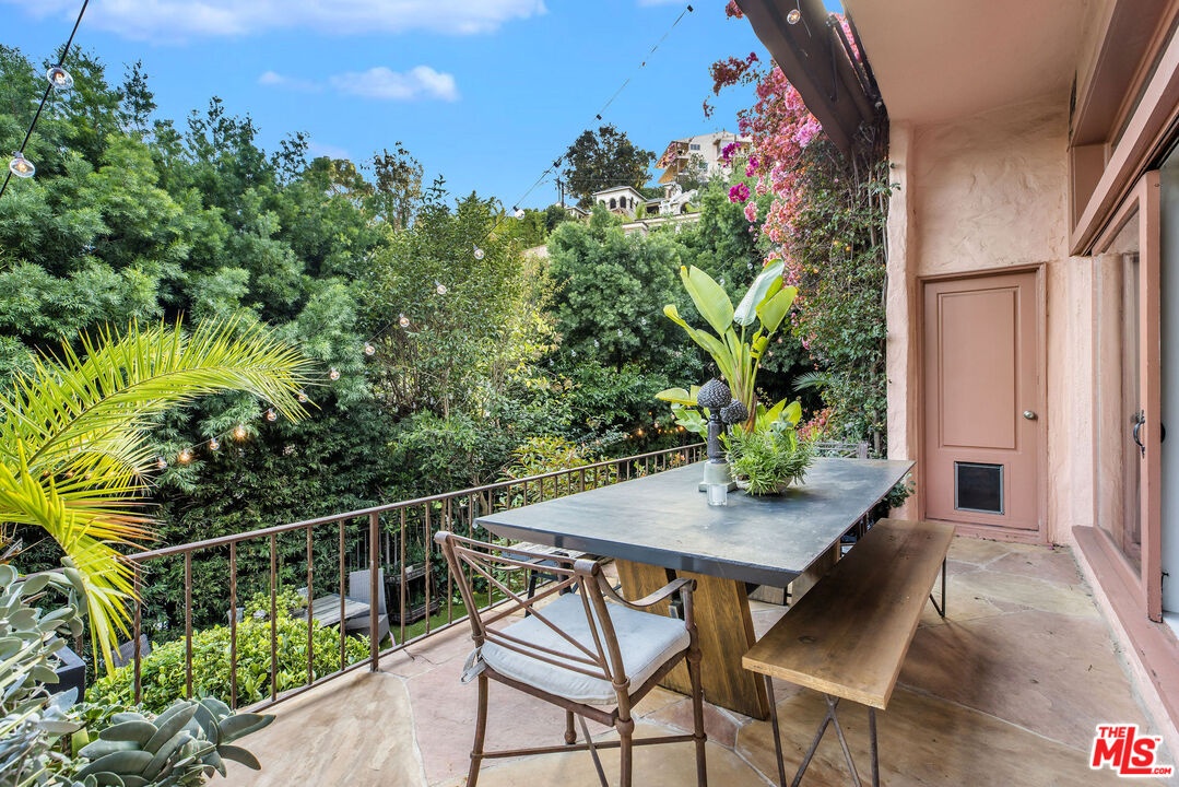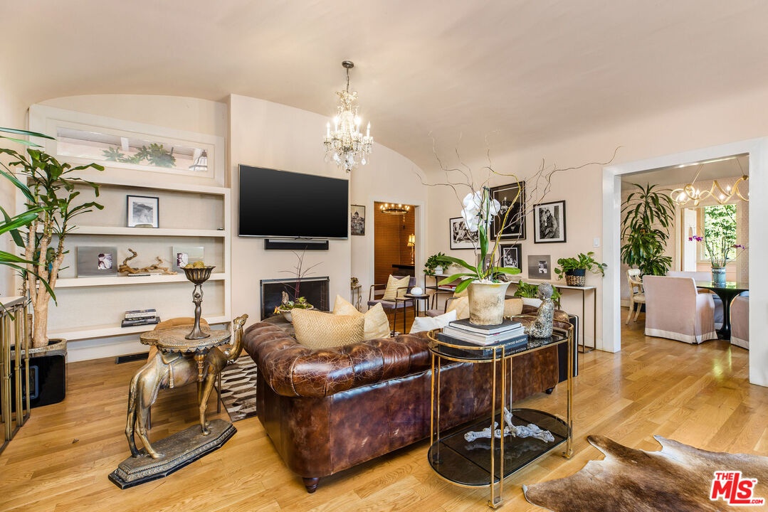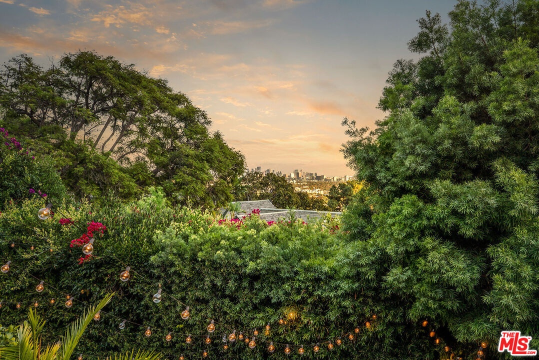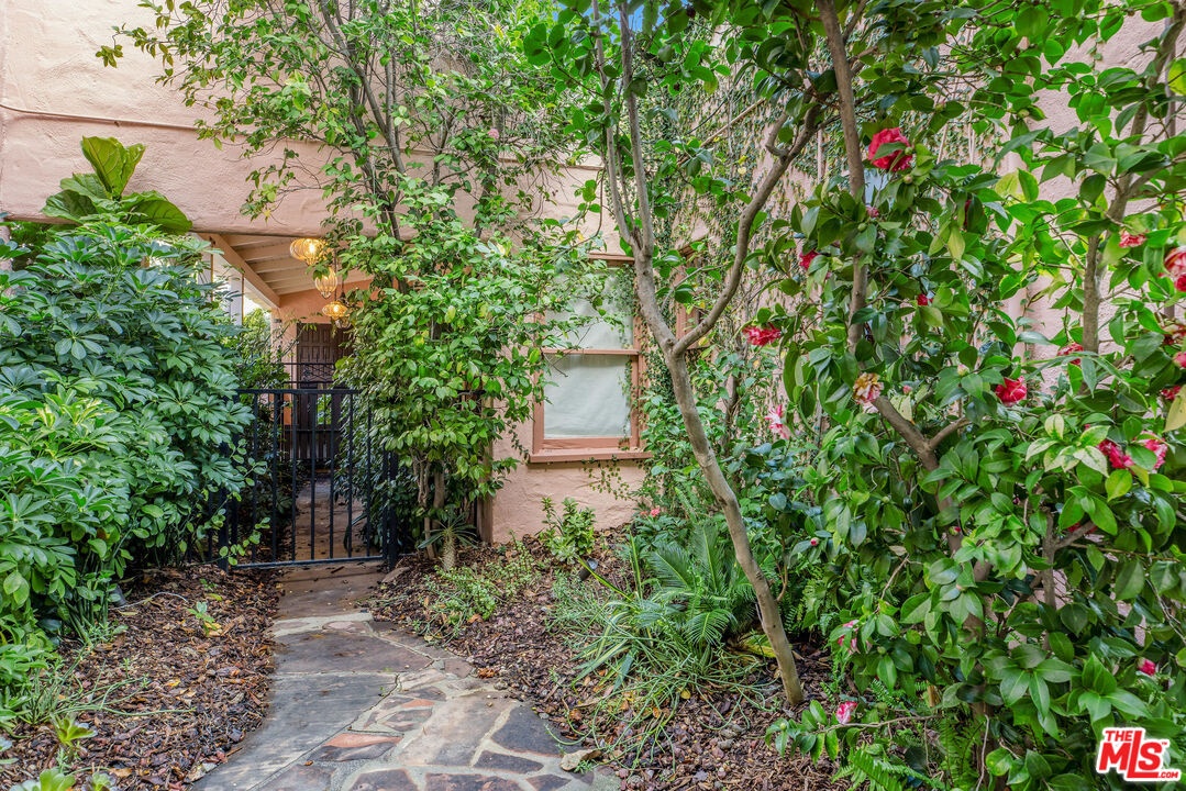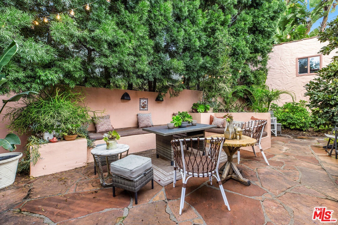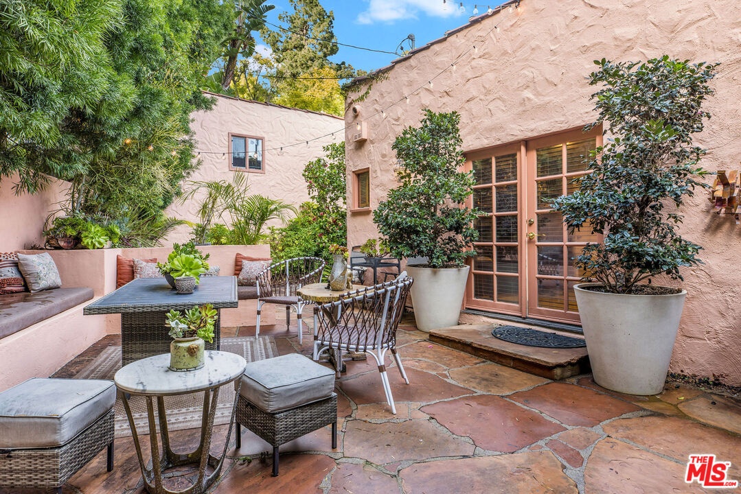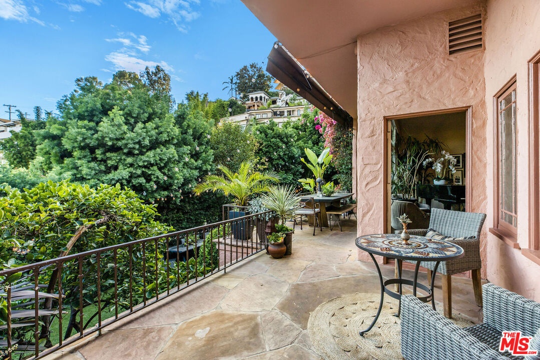 Step inside this classic Hollywood Hills Spanish and it immediately wraps you in that old-world magic everyone wants but hardly ever finds. You enter through a charming foyer anchored by a statement chandelier, then flow into a bright and airy living room with garden-facing windows, a beautiful fireplace, and warm hardwood floors that set the tone for the entire home. To the left, a character-filled dining room with built-in bookshelves leads to a thoughtfully updated kitchen with stone countertops, stainless steel appliances, and a huge picture window that pours in natural light. Just off this wing sits a guest bedroom with a full bath and laundry connections, ideal for visitors or a private office. Down the main hallway are three more bedrooms. The ensuite sits quietly on its own with a generous closet, and two additional bedrooms complete the layout, one with French doors that open directly to the garden. Step outside and the home transforms into its own hillside retreat. The main patio overlooks multiple entertaining terraces, each framed by lush greenery and draped in romantic string lights. There's a tranquil fountain, a dining area, and a charming casita-style nook that feels straight out of the Chateau Marmont. Below the main level, you'll find a bonus basement area with abundant storage plus its own washer and dryer a rare functional perk in the Hills. The garage has been converted into a bonus space with a half bath, perfect as a guest suite, creative studio, game room, or anything your life needs it to be. The property is gated, sits on an oversized lot, and captures the warmth and character of true Spanish Mediterranean architecture.