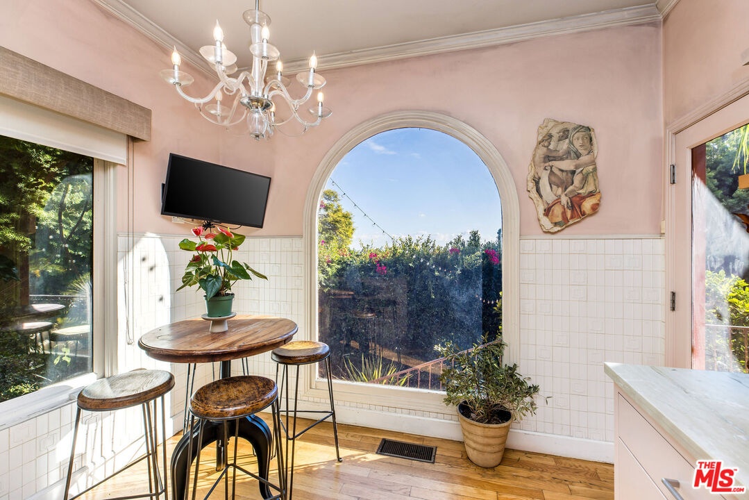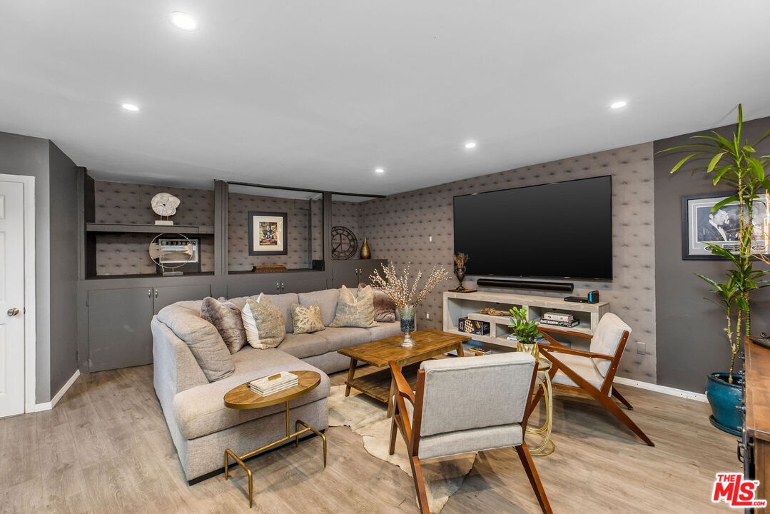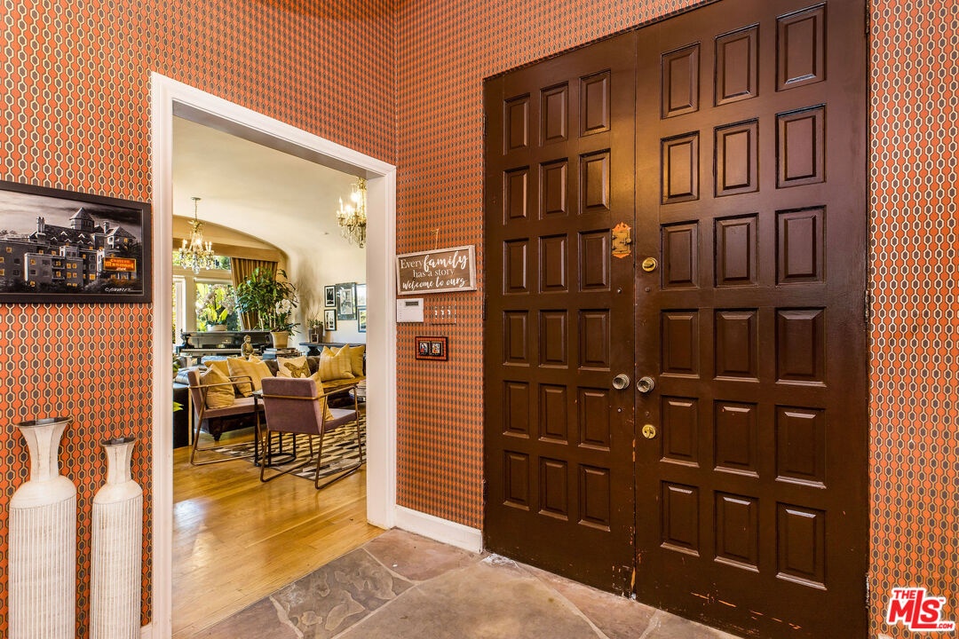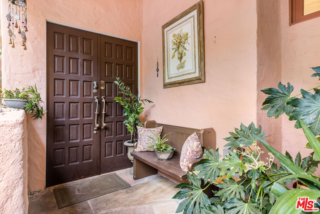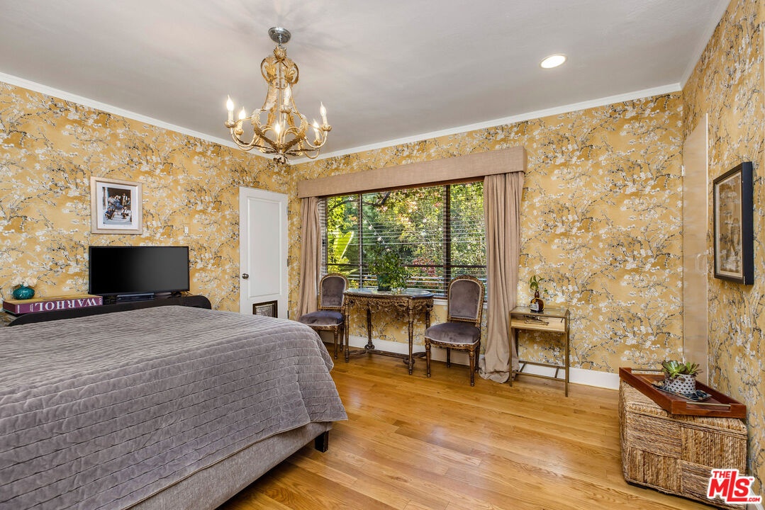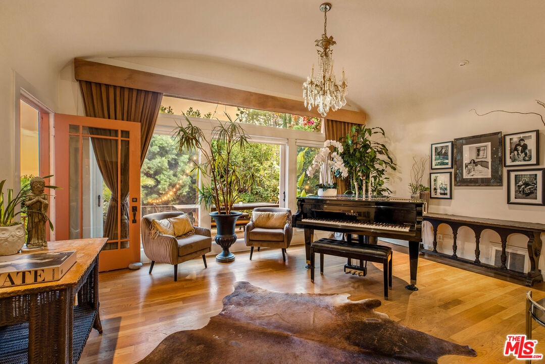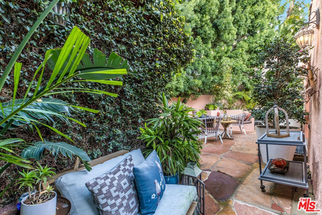 Step inside this classic Hollywood Hills Spanish and it immediately wraps you in that old-world magic everyone wants but hardly ever finds. You enter through a charming foyer anchored by a statement chandelier, then flow into a bright and airy living room with garden-facing windows, a beautiful fireplace, and warm hardwood floors that set the tone for the entire home. To the left, a character-filled dining room with built-in bookshelves leads to a thoughtfully updated kitchen with stone countertops, stainless steel appliances, and a huge picture window that pours in natural light. Just off this wing sits a guest bedroom with a full bath and laundry connections, ideal for visitors or a private office. Down the main hallway are three more bedrooms. The ensuite sits quietly on its own with a generous closet, and two additional bedrooms complete the layout, one with French doors that open directly to the garden. Step outside and the home transforms into its own hillside retreat. The main patio overlooks multiple entertaining terraces, each framed by lush greenery and draped in romantic string lights. There's a tranquil fountain, a dining area, and a charming casita-style nook that feels straight out of the Chateau Marmont. Below the main level, you'll find a bonus basement area with abundant storage plus its own washer and dryer a rare functional perk in the Hills. The garage has been converted into a bonus space with a half bath, perfect as a guest suite, creative studio, game room, or anything your life needs it to be. The property is gated, sits on an oversized lot, and captures the warmth and character of true Spanish Mediterranean architecture.