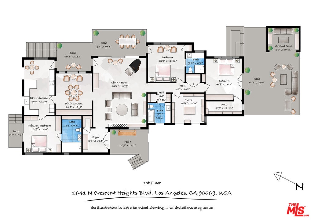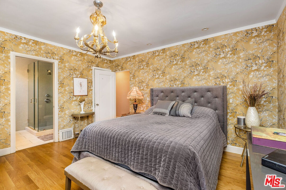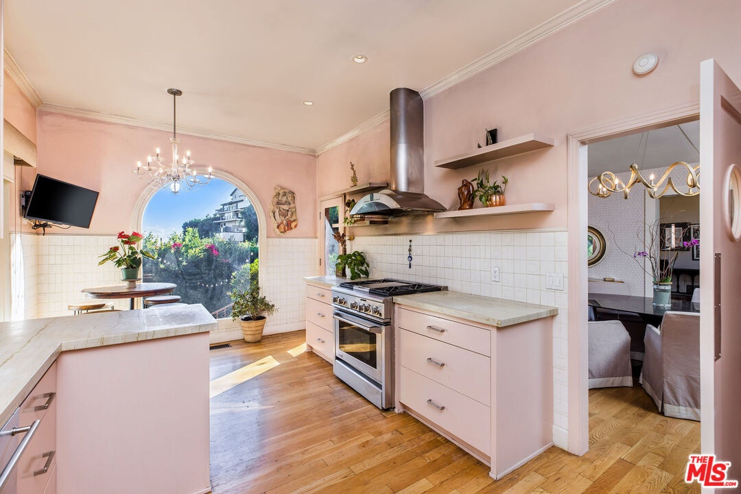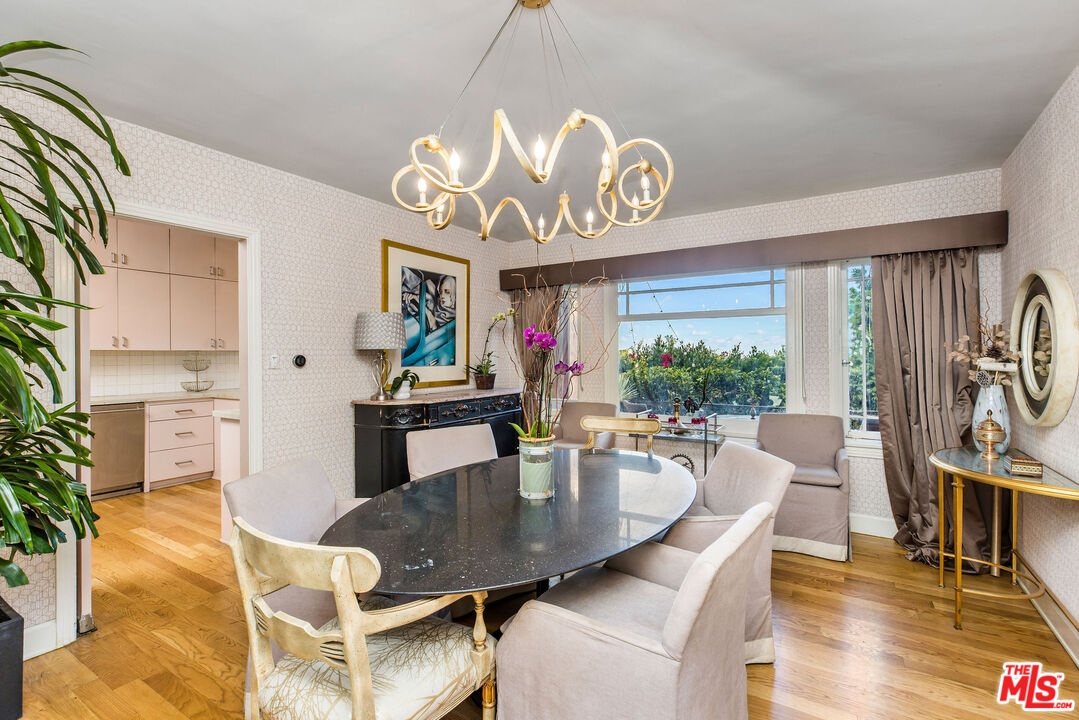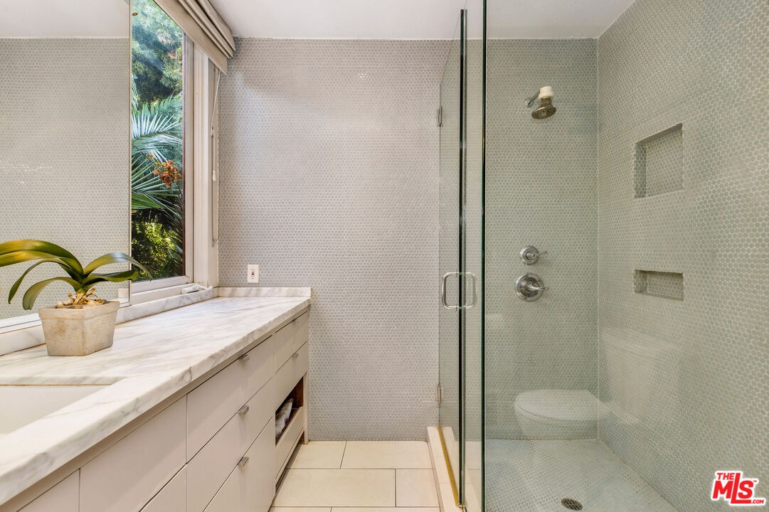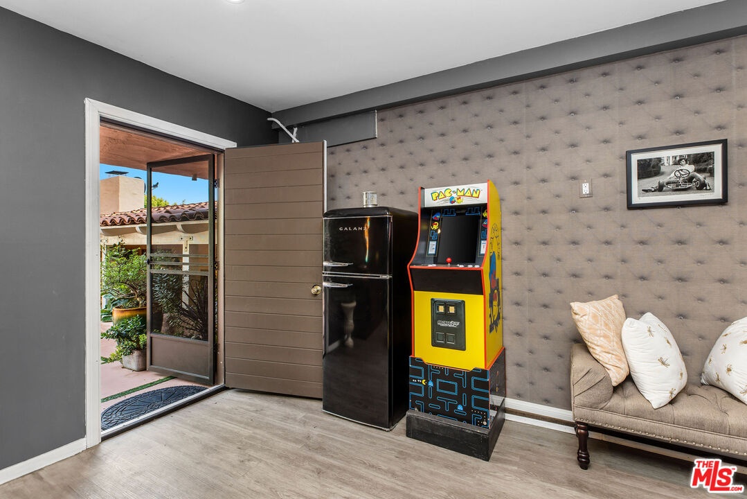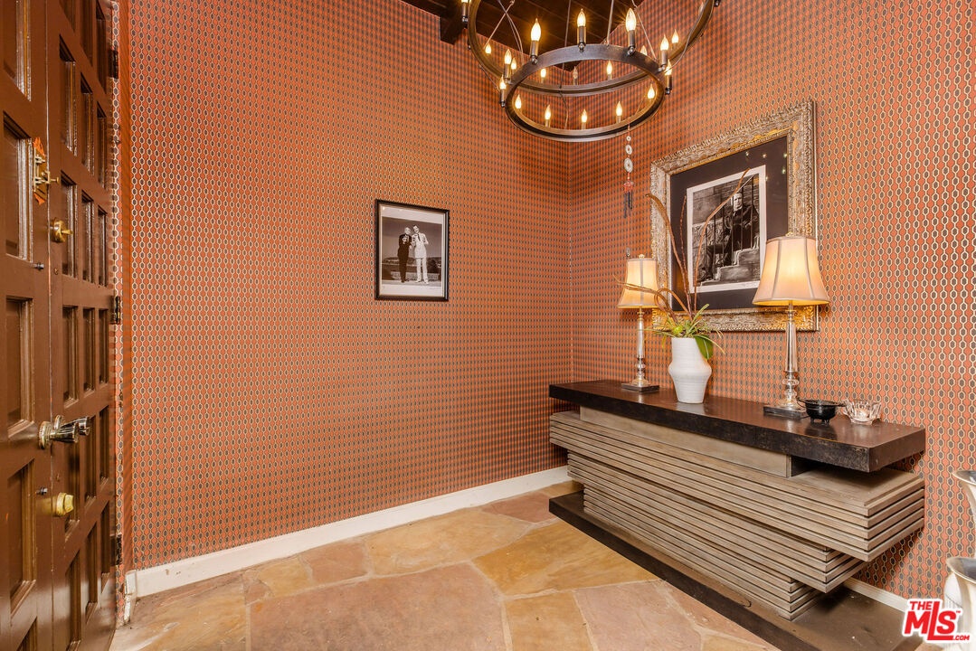 Step inside this classic Hollywood Hills Spanish and it immediately wraps you in that old-world magic everyone wants but hardly ever finds. You enter through a charming foyer anchored by a statement chandelier, then flow into a bright and airy living room with garden-facing windows, a beautiful fireplace, and warm hardwood floors that set the tone for the entire home. To the left, a character-filled dining room with built-in bookshelves leads to a thoughtfully updated kitchen with stone countertops, stainless steel appliances, and a huge picture window that pours in natural light. Just off this wing sits a guest bedroom with a full bath and laundry connections, ideal for visitors or a private office. Down the main hallway are three more bedrooms. The ensuite sits quietly on its own with a generous closet, and two additional bedrooms complete the layout, one with French doors that open directly to the garden. Step outside and the home transforms into its own hillside retreat. The main patio overlooks multiple entertaining terraces, each framed by lush greenery and draped in romantic string lights. There's a tranquil fountain, a dining area, and a charming casita-style nook that feels straight out of the Chateau Marmont. Below the main level, you'll find a bonus basement area with abundant storage plus its own washer and dryer a rare functional perk in the Hills. The garage has been converted into a bonus space with a half bath, perfect as a guest suite, creative studio, game room, or anything your life needs it to be. The property is gated, sits on an oversized lot, and captures the warmth and character of true Spanish Mediterranean architecture.