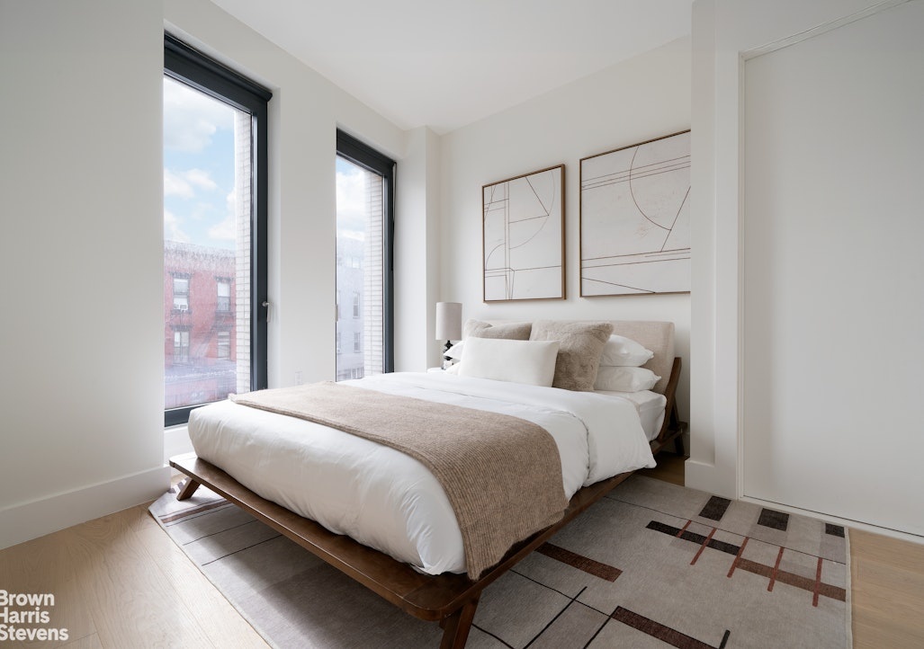Residence 4A's 1 bedroom, 1 bathroom layout exemplifies the pinnacle of luxury living. The interiors are adorned with rich white oak engineered wood floors, creating a warm and inviting atmosphere. The spacious and open floor plan allows for effortless entertaining and comfortable living leading out to a private balcony. The state-of-the-art kitchen is a chef's dream, featuring sleek white countertops and a blend of custom painted wood shaker cabinetry and elegant open shelving that enhance the clean, modern aesthetic. High-end appliances by Bosch ensure every meal is prepared to perfection.