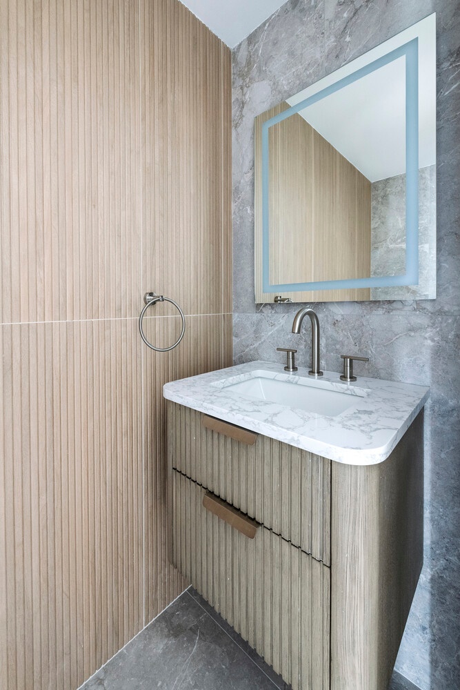 This level holds two spacious bedrooms-one with a private balcony and en suite. The spa-inspired bathroom is outfitted with Delta fixtures, a tub/shower combination enclosed with clean glasswork, beautiful tilework, and soft integrated mirror lighting.