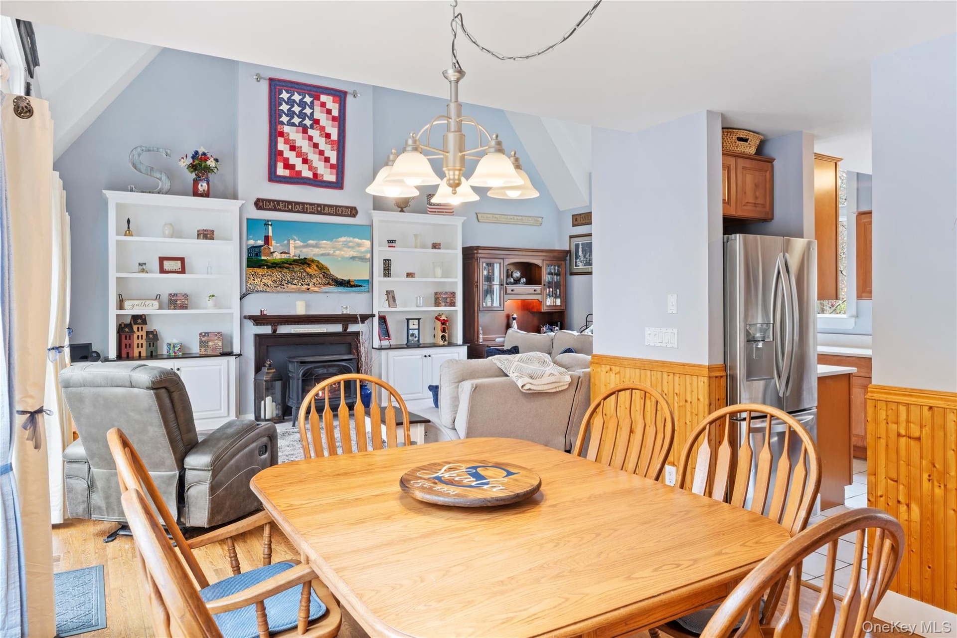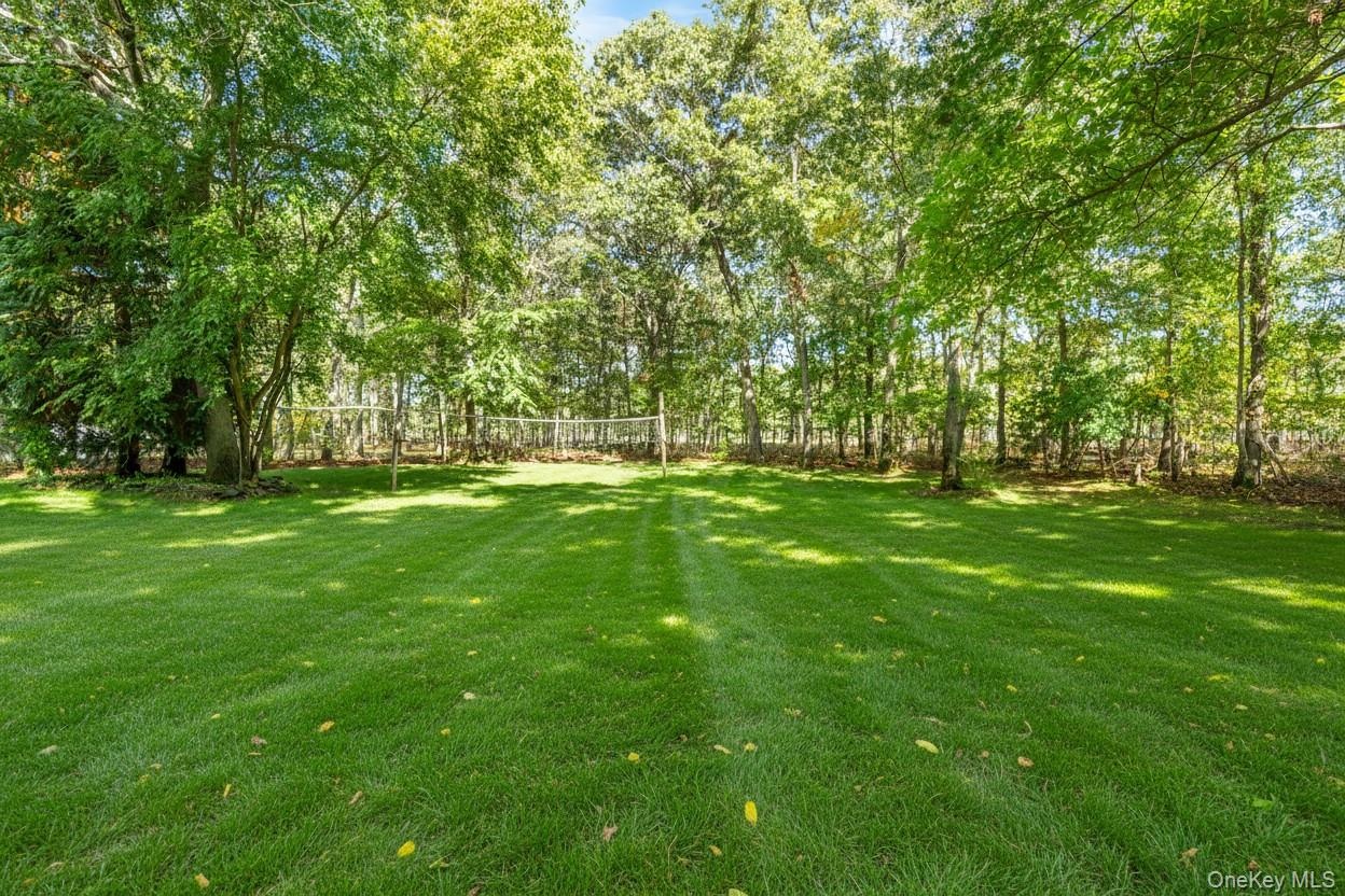 Welcome to this light-filled 4 bed, 2 bath home tucked away on a quiet dead-end street in East Quogue. Large windows throughout bring the outdoors in and brighten the interior. The main level features a living room with vaulted ceilings, a wood burning stove, and double sliders that open directly to the backyard. The living room flows into the dining area and the kitchen, which is finished with quartz countertops, stainless steel appliances, a breakfast counter, and a layout that blends seamlessly with the main living spaces. Two bedrooms and a full bathroom are also located on this floor. Upstairs, the primary ensuite is spacious and includes a soaking tub, separate shower, and a balcony overlooking the backyard. A second upstairs bedroom completes the level. A full basement with laundry provides excellent storage and additional usable space. The outdoor area includes a heated inground pool, hot tub, outdoor shower, multiple seating areas, and a sprawling grass lawn with plenty of room for volleyball, lawn games, or open play. The backyard enjoys winter views of the golf course, offering a quiet and scenic backdrop during the colder months. A shed on the property adds even more convenient storage. Close to the village, beaches, farm stands, and everything the East End is known for, this home offers comfort, space, low taxes, and a peaceful East Quogue setting suitable for year-round or seasonal living.