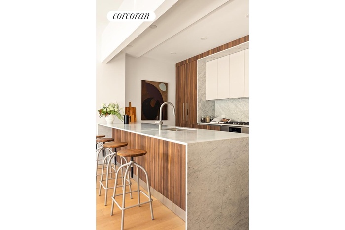 Recognized by a striking bronze-colored brick facade that seamlessly celebrates the brownstone vernacular of the surrounding tree-lined and historic streets, all the homes boast gracious layouts and timeless interiors. Extreme attention to every detail separates this jewel from the crowd, and it includes high ceilings, magnificent oak floors, multi-zoned heating and cooling, recessed lighting, and in-unit washers and dryers. Kitchens are outfitted with only the best, including Fisher Paykel, Miele, and Bosch appliances, including gas ranges; honed Carrara marble countertops and surrounds; and custom designed walnut and lacquer cabinetry with generous workspace. Classic Calacatta Gold marble and Travertine bathrooms are reimagined for a spa-like experience and include oversized slab tile, jewel-like brushed nickel hardware, custom-designed medicine cabinets and walnut vanities with great storage, deep soaking tubs, and glass-enclosed walk-in showers.