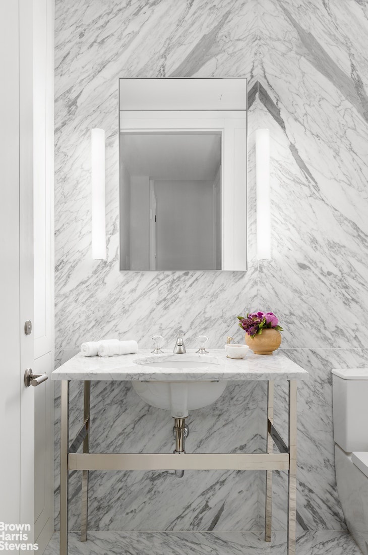 appliances (including a vented stove hood), custom pendant lights, an elegant slab marble island and Glassos counters. The bathrooms are worthy of one of the world's great spas, with custom vanities, and slab and mosaic stonework in a soothing natural palate.