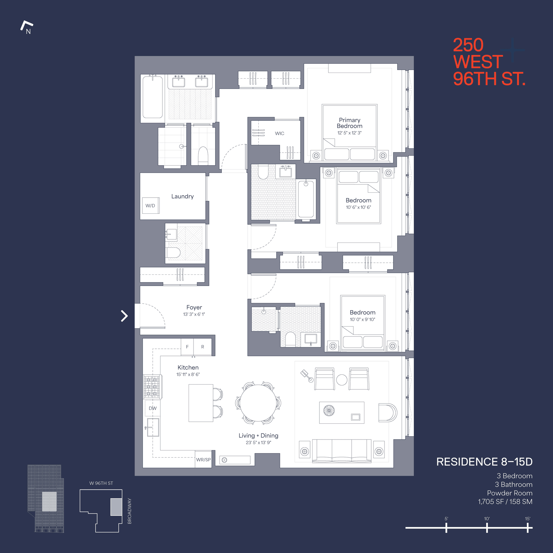 Introducing Residence 9D, a 1,705 square foot 3 bedroom, 3.5 bath east-facing home with 9’1” ceilings and floor-to-ceiling casement windows. A formal entry with a coat closet, leads to the 23’ ft living/dining area and top-of-the line open kitchen. All three bedrooms, complete with en-suite marble baths, have beautiful morning light through east-facing floor-to-ceiling windows.