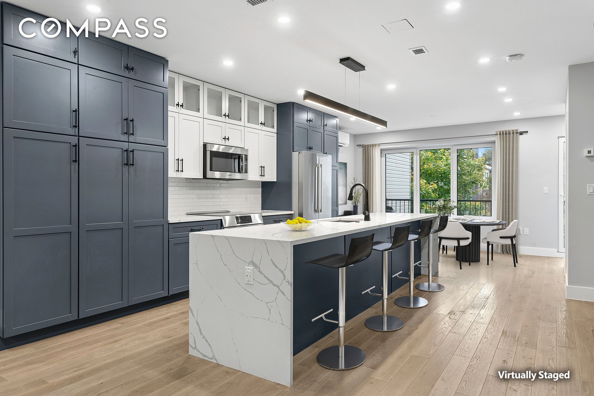 Enter through the parlor level of this classic brownstone and continue up one flight into expansive living and dining areas that bookend an impeccably designed chef's kitchen with Bosch stainless steel appliances, custom cabinetry, and an impressive 14 foot island which can seat up to 6. A powder room is conveniently located in the rear of the home as you exit to a large private balcony spacious enough for entertaining. The upper floor features a large primary suite with a large walk-in closet and en suite bathroom with double vanities and walk-in shower with dual shower heads. Two secondary bedrooms share another well-appointed full bathroom with bathtub. Continue up to the private rooftop deck for your morning yoga, coffee at your bistro table or simply to watch the sunset.