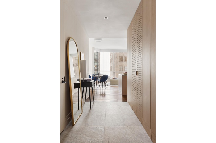 The gracious entryway features custom millwork and stone flooring. A separate guest powder room features a custom Calacatta Lincoln marble sink and feature wall. The Deborah Berke custom designed European Poliform kitchen is equipped with an elegant, honed Blue de Savoie marble countertop and backsplash, Grohe faucets, and fully-integrated top of the line appliances from Wolf, Sub-Zero, and Miele. The entire kitchen is highly designed to seamlessly integrate natural light and water elements which is evident within the stone and cabinet design elements.