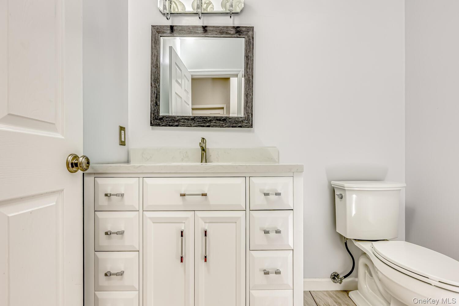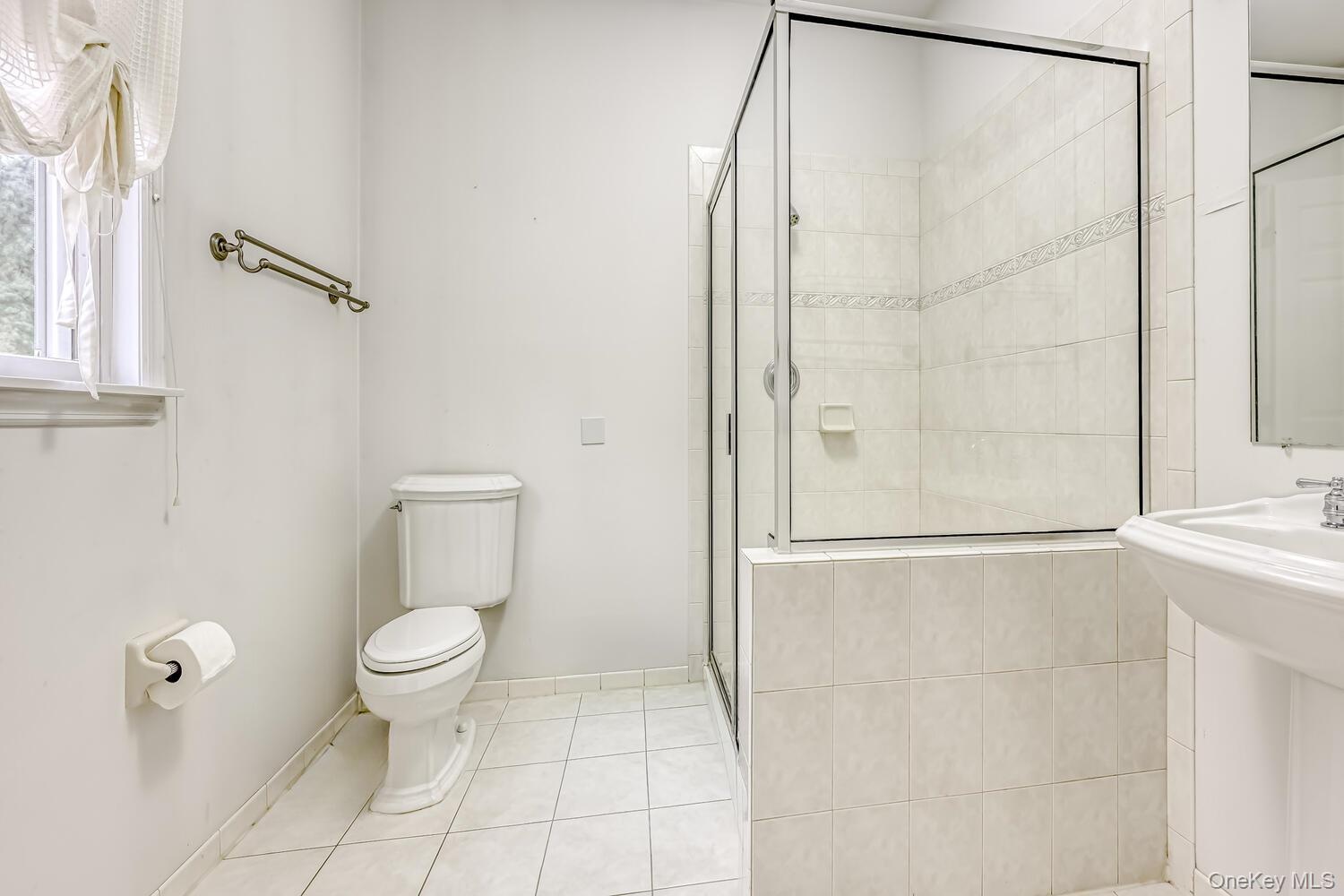 The spectacular great room serves as the centerpiece of the home, showcasing soaring ceilings, abundant natural light, recessed lighting, and a striking stone fireplace. The adjoining eat-in kitchen is designed for those who love to cook, complete with a large center island, premium stainless-steel appliances, a 6-burner Thermador cooktop, double JennAir wall oven, new refrigerator and dishwasher, two sinks, and a pantry closet. The dinette opens to a spacious deck overlooking more than an acre of lush, private grounds accented by a pond and waterfall. A half bathroom and a guest bedroom with its own full bath complete the main level.
