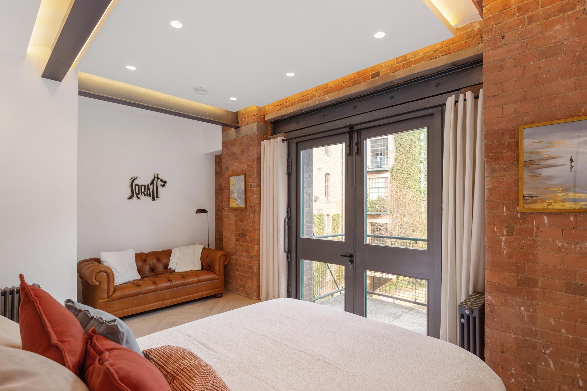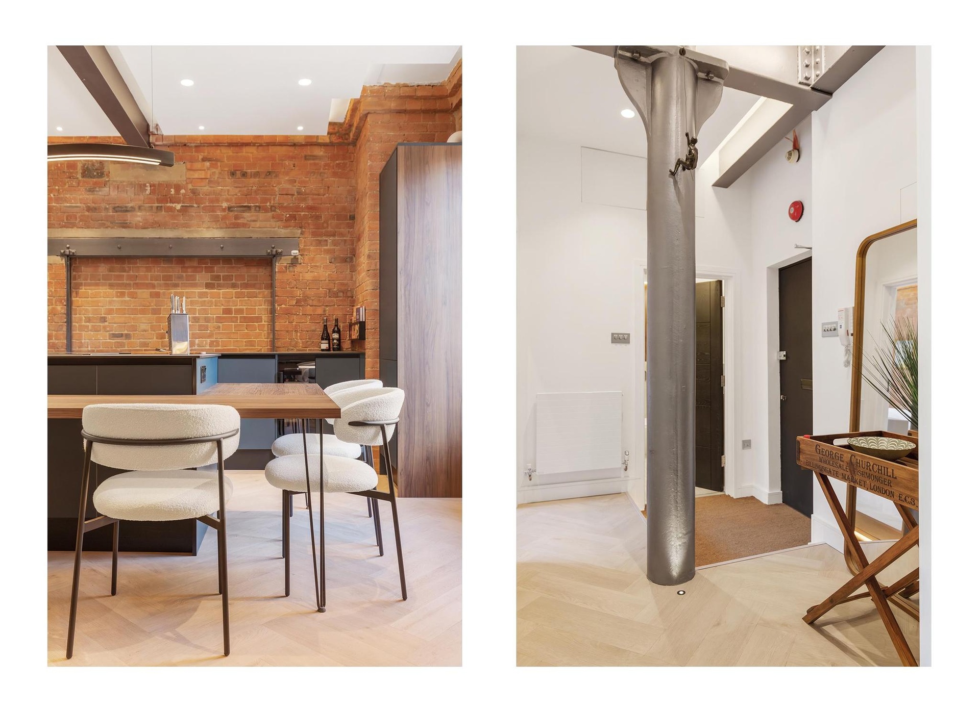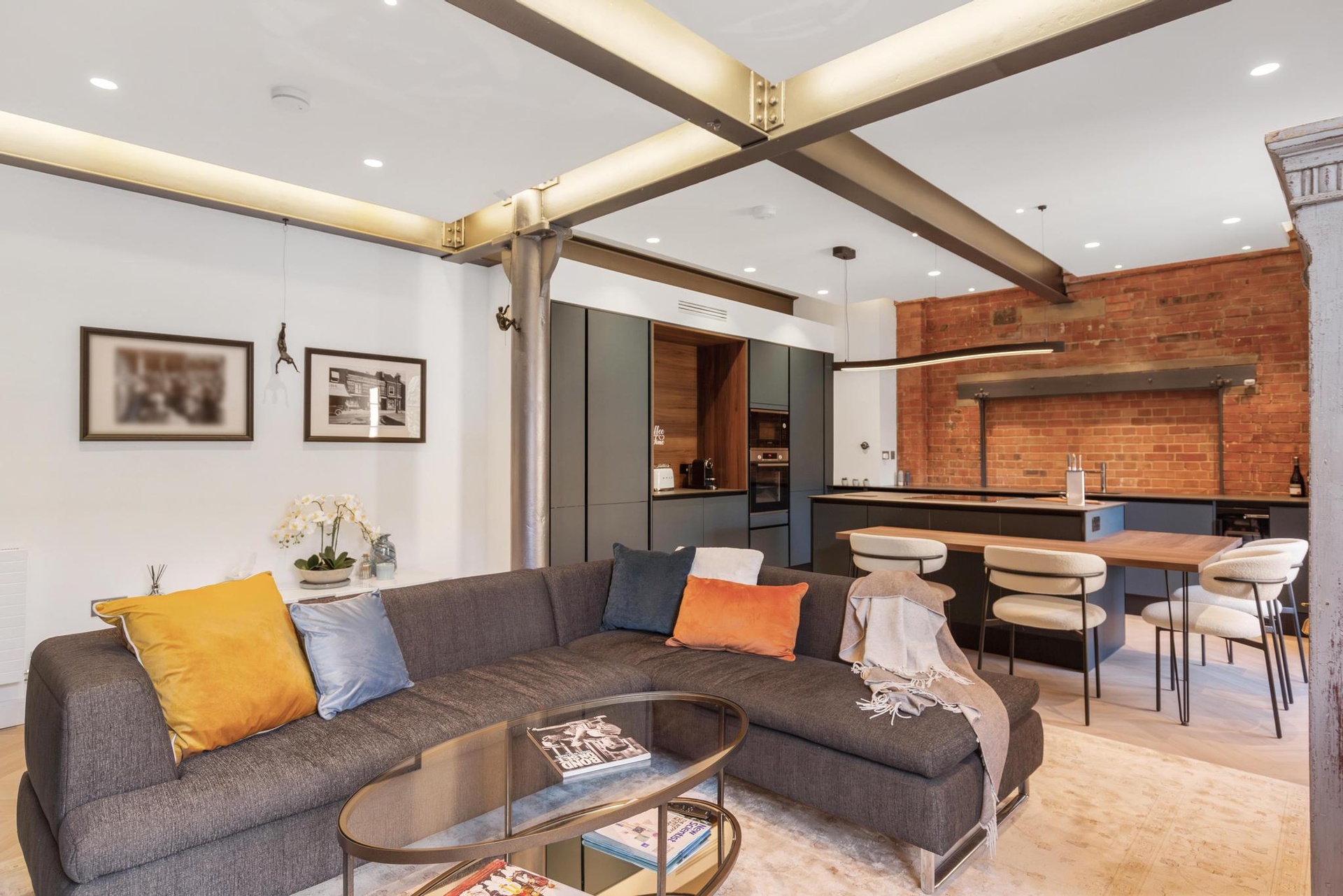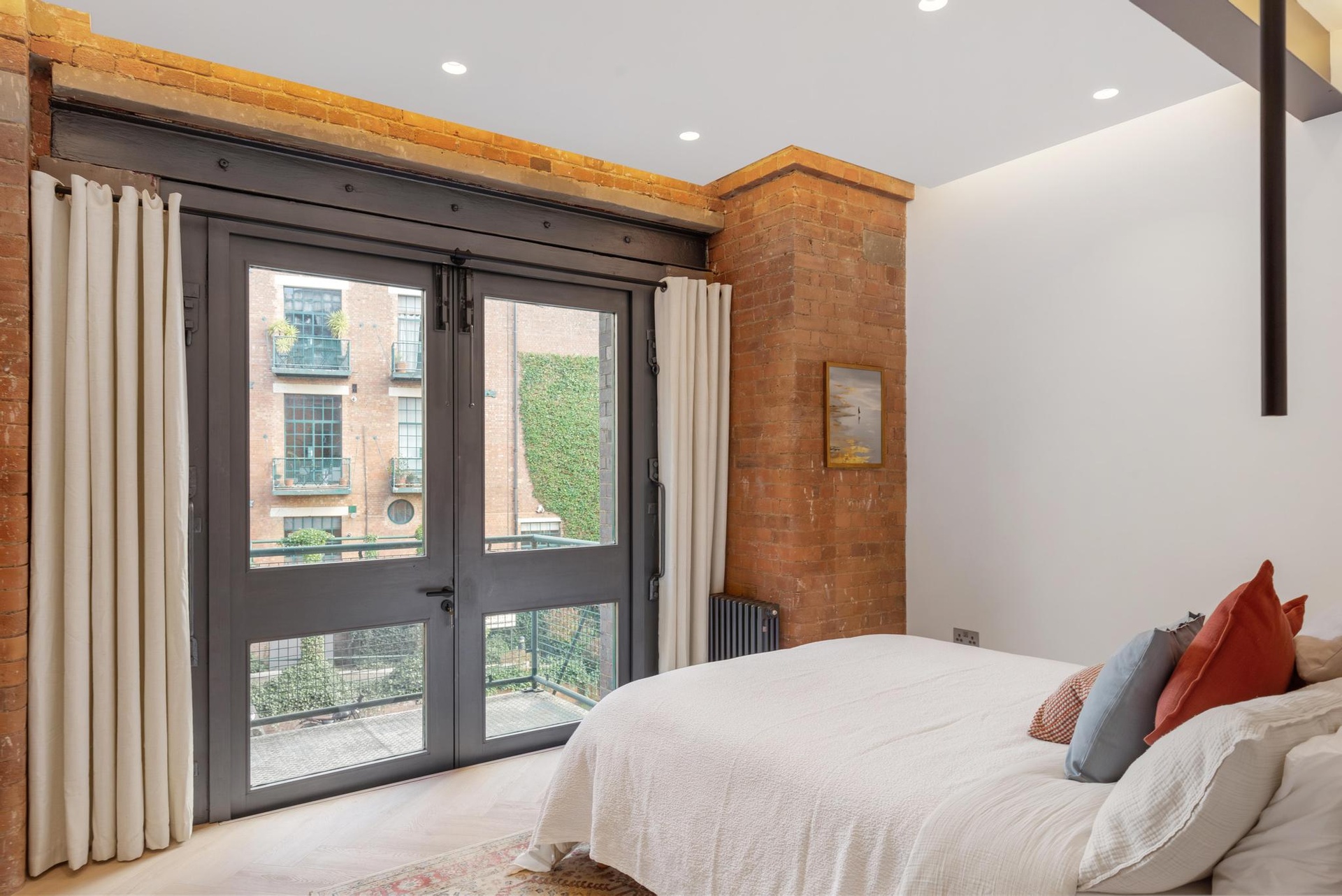 Situated on the first floor, the apartment has undergone a comprehensive refurbishment to an exacting standard. The interior showcases exposed brickwork, steel structural beams, impressive ceiling heights and expansive factory windows, all complemented by herringbone flooring and bespoke joinery. The result is a home of both character and sophistication.