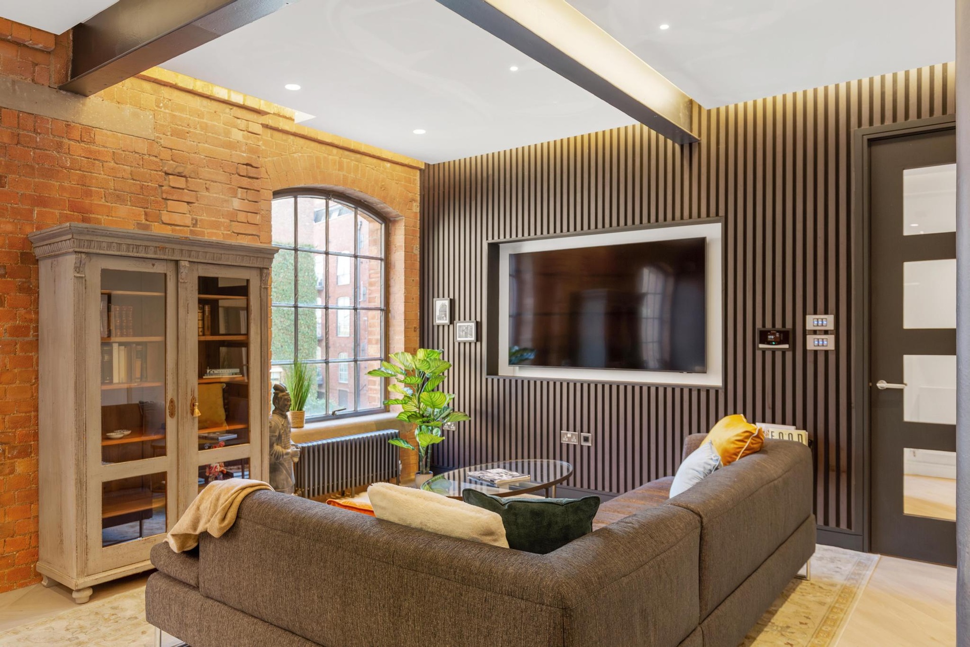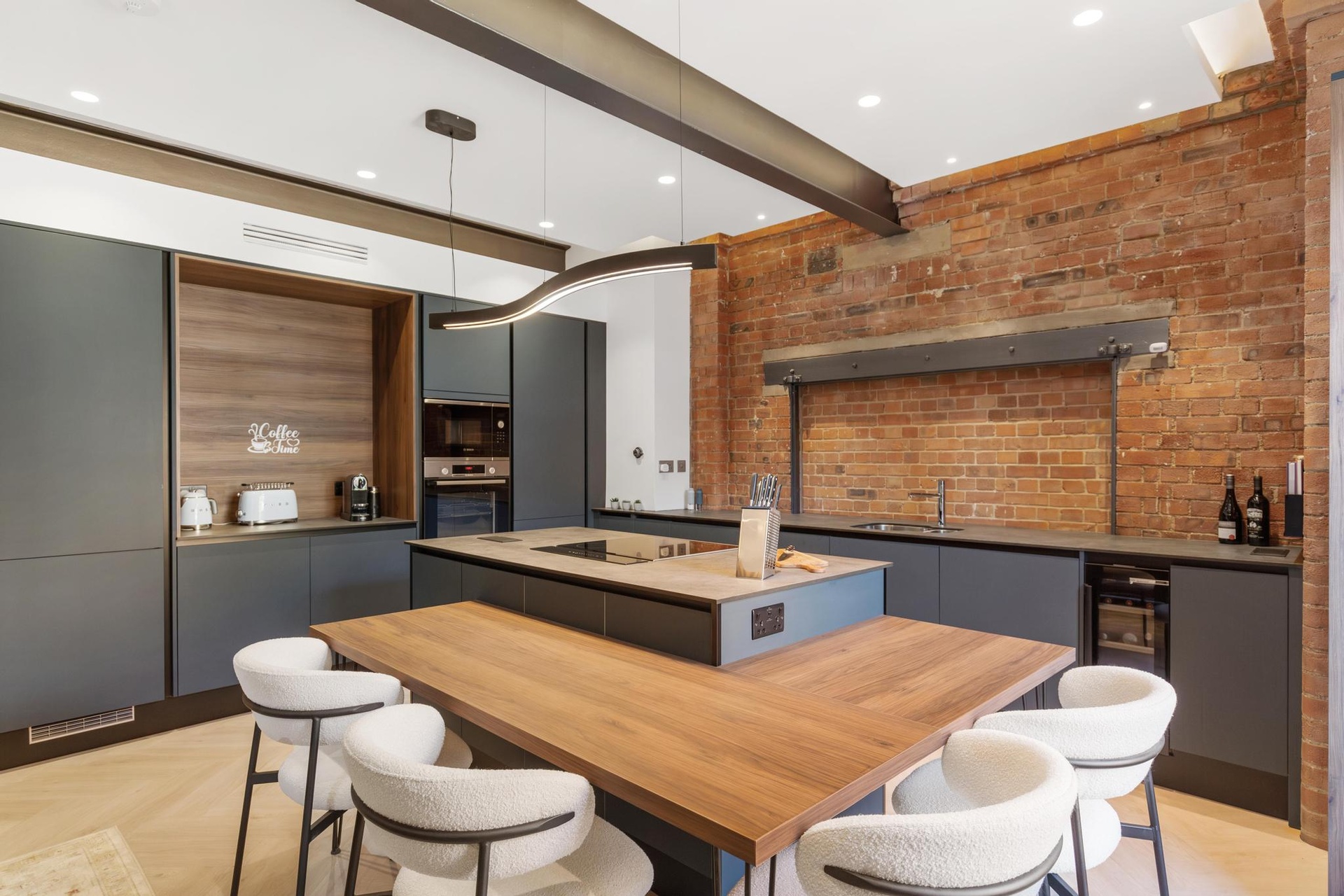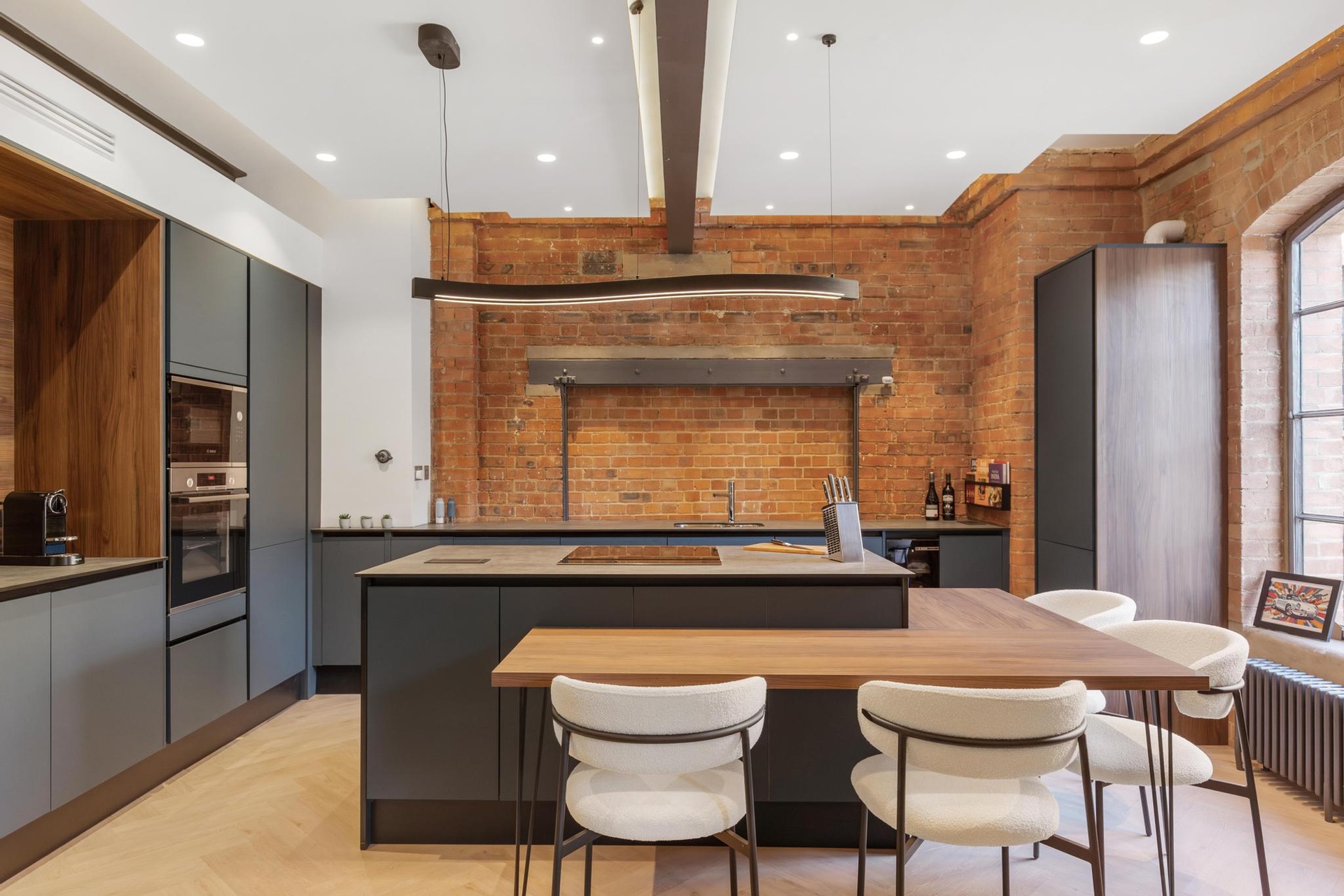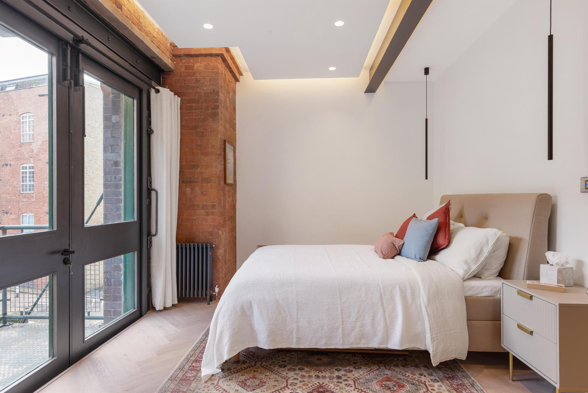 Situated on the first floor, the apartment has undergone a comprehensive refurbishment to an exacting standard. The interior showcases exposed brickwork, steel structural beams, impressive ceiling heights and expansive factory windows, all complemented by herringbone flooring and bespoke joinery. The result is a home of both character and sophistication.