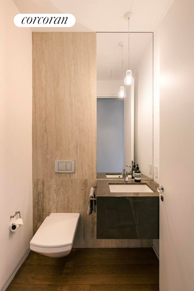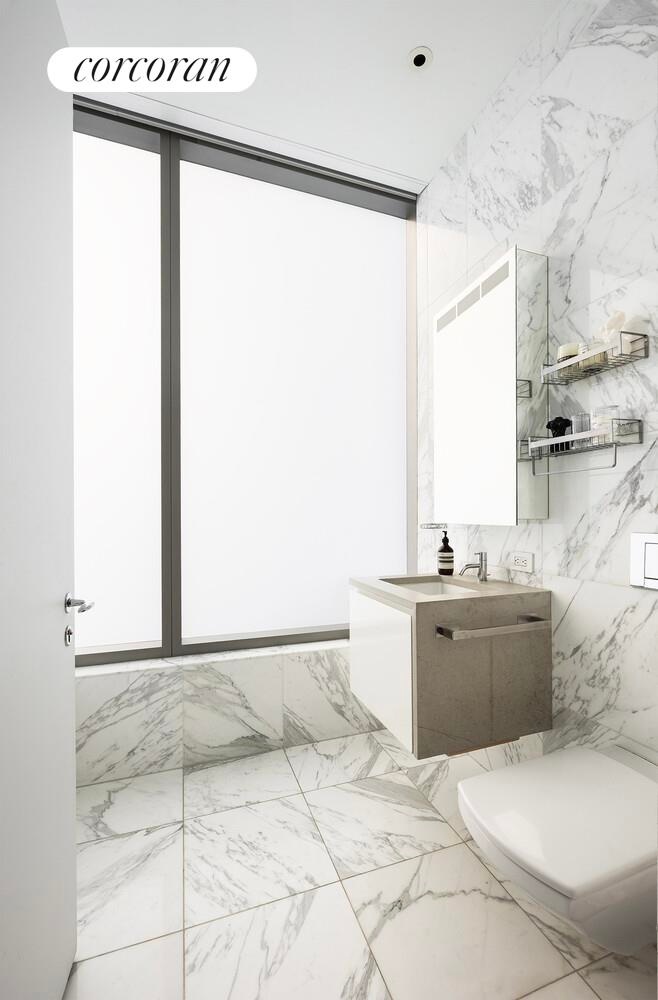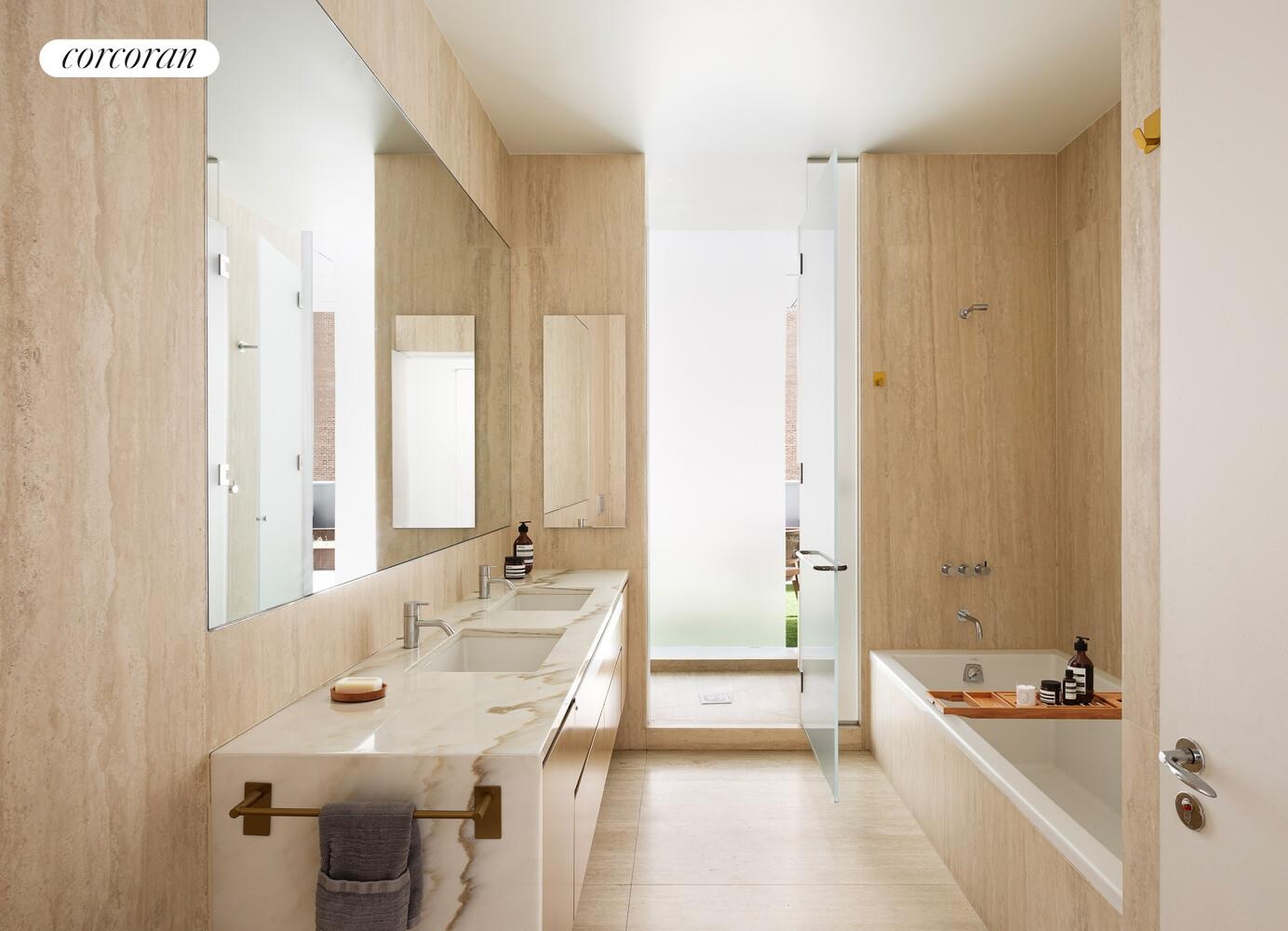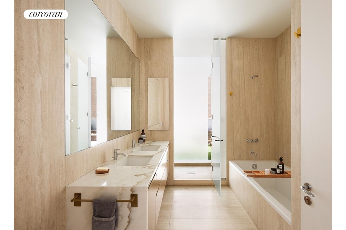 Designed with entertaining in mind, the open chef's kitchen features custom Louro Preto rosewood cabinetry, Calcutta marble countertops, Vola fixtures, and a full suite of Gaggenau appliances. When it's time to unwind, retreat to the spacious corner primary suite overlooking your private terrace. Its spa-caliber primary bathroom impresses with a marble-clad double vanity, a glass-enclosed Vola shower, a deep soaking Zuma tub, a wall-mounted Duravit toilet, and honed Italian travertine throughout.