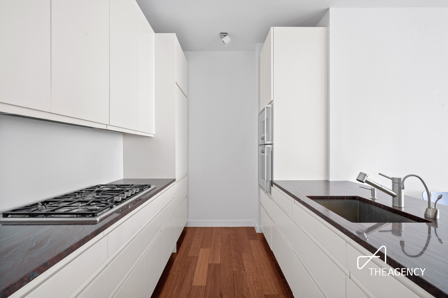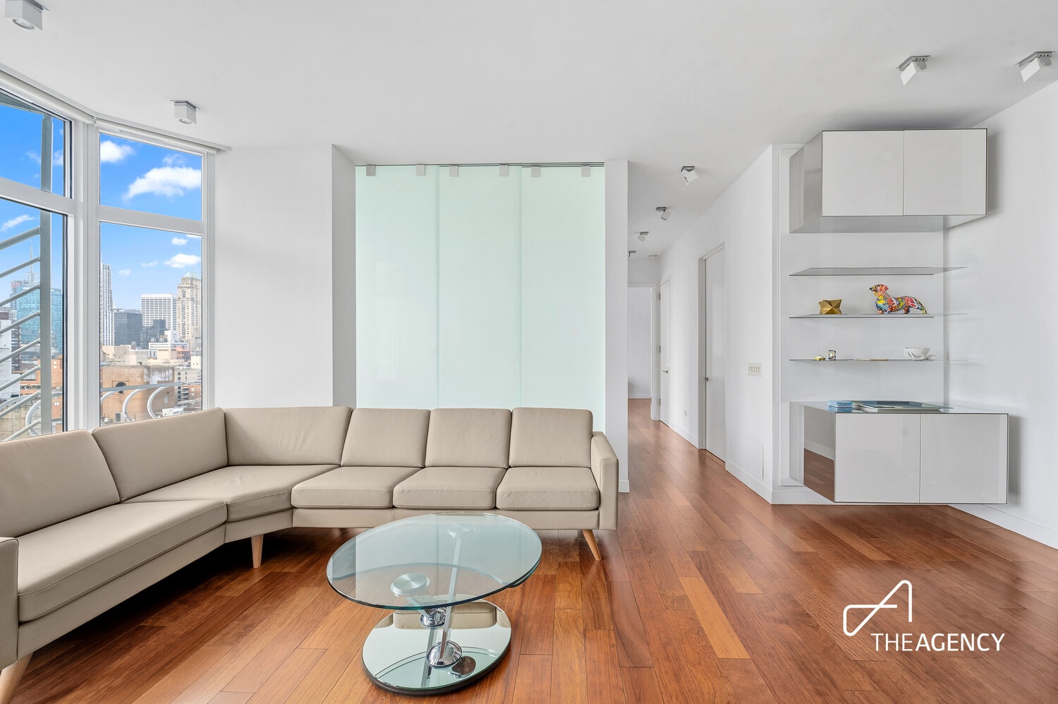 The open kitchen is outfitted with top-of-the-line stainless steel appliances-Thermador cooktop, Gaggenau convection and steam oven, Miele dishwasher, and a Sub-Zero fridge. Quartzite countertops and custom KGBL cabinetry give the space a polished, high-end feel. You'll also find an in-unit washer/dryer, custom oak-lined closets, and wood floors throughout.The living area is spacious enough for a separate dining setup, and the bedrooms are generously sized-a huge 19-foot king-size primary bedroom with an en-suite bath and double closet, plus a queen-size second bedroom.