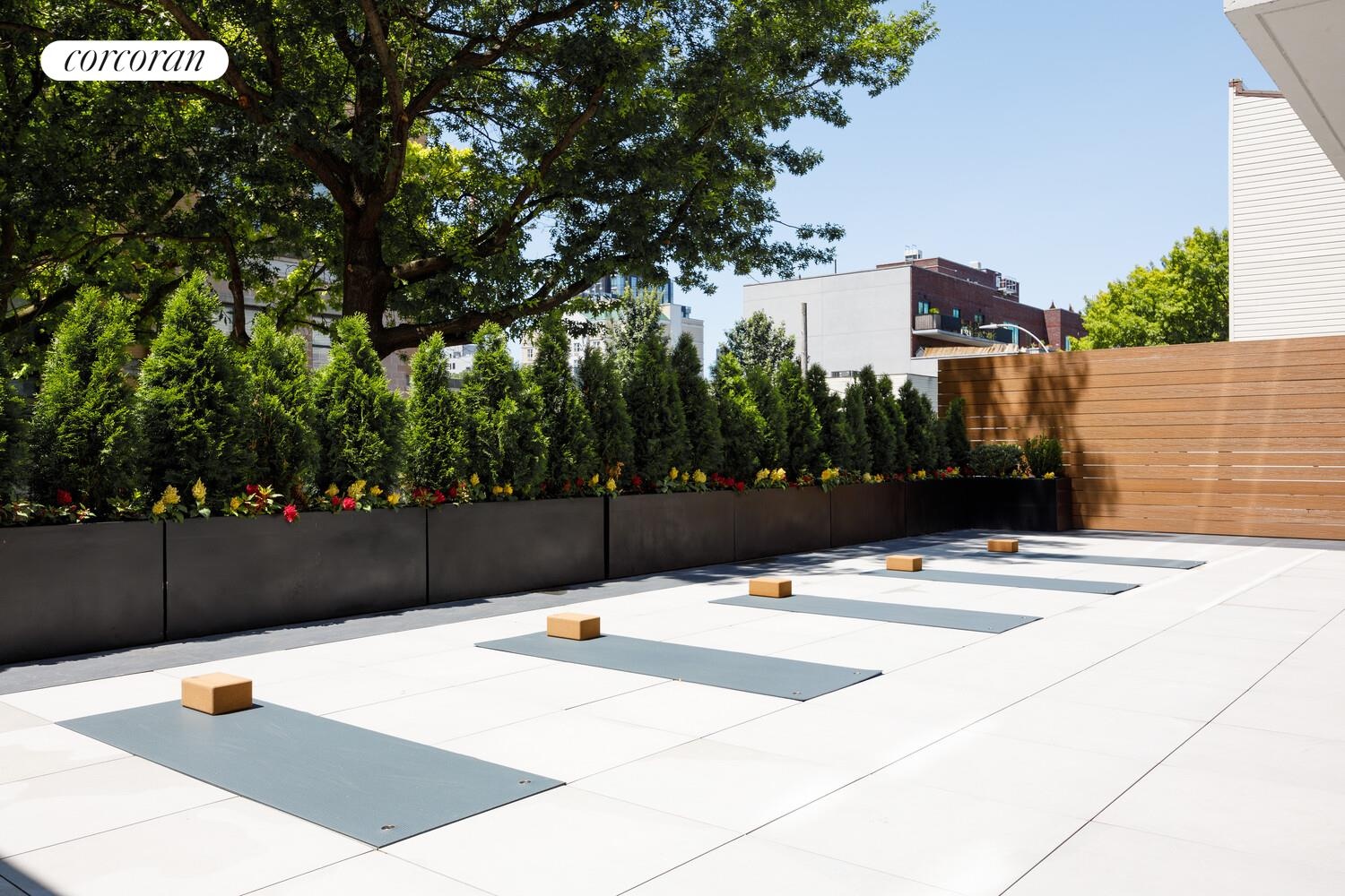 Building amenities include a large fitness center with a yoga terrace on the 2nd floor, a residents' lounge, more than 7,000 square feet of common outdoor space, including a 4,200 square foot landscaped roof deck with a grilling station, bicycle storage, garage parking, a pet spa and Latch keyless entry. Onsite personal storage locker licenses are available for purchase. Some services may be fee-based.