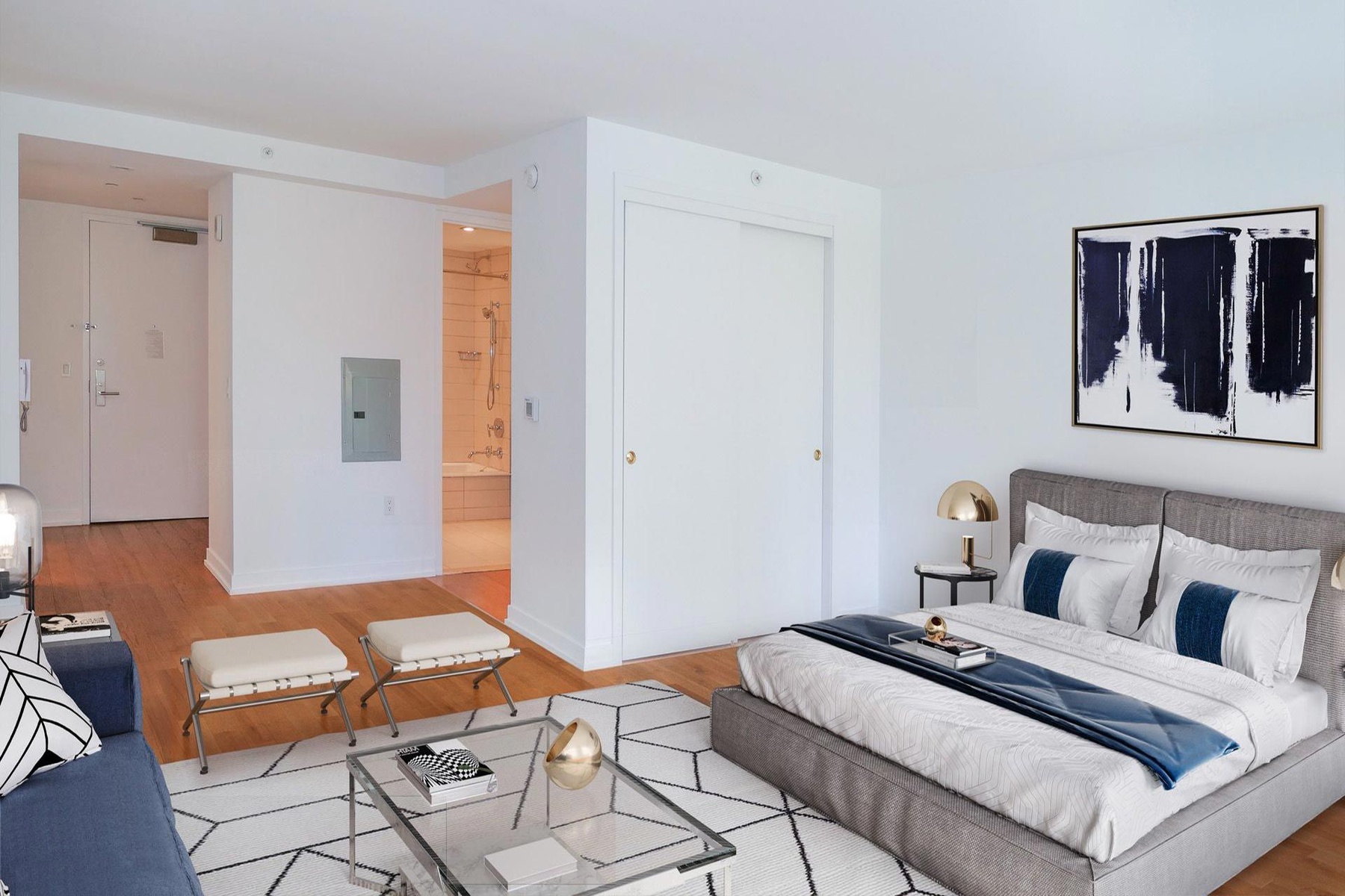 Spacious studio featuring a wall of windows, gourmet kitchen with stainless steel appliances, and stone counters, and an in-unit washer/dryer. This great home also has room for a dedicated dining or home office space and wood floors thoroughout.