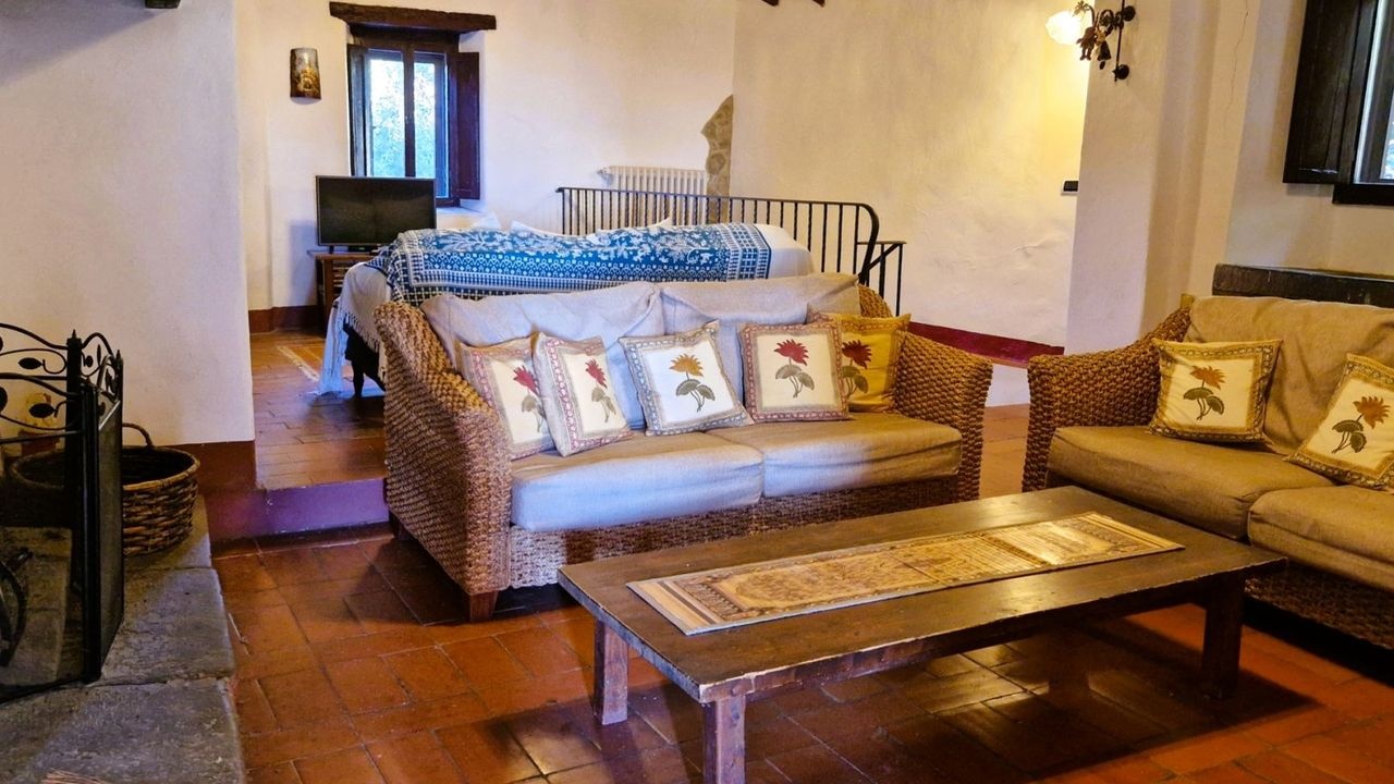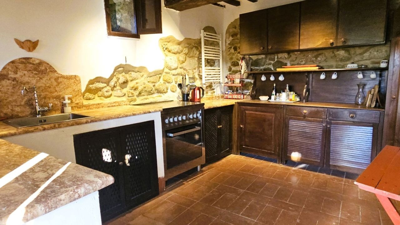 A short distance away is the outbuilding of 25 sqm, consisting of a living area with kitchen and fireplace, overlooking a terrace covered with lush vines, as well as a bedroom with a panoramic window and a bathroom.