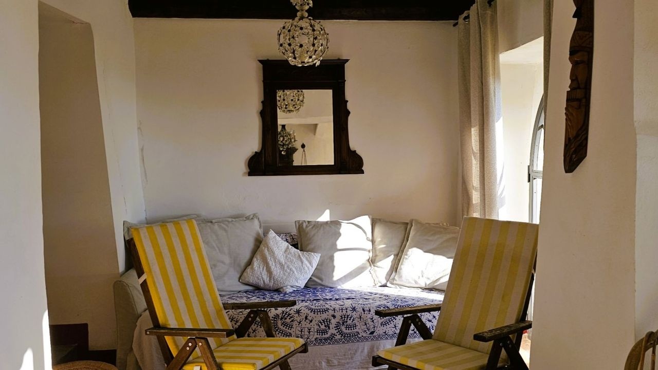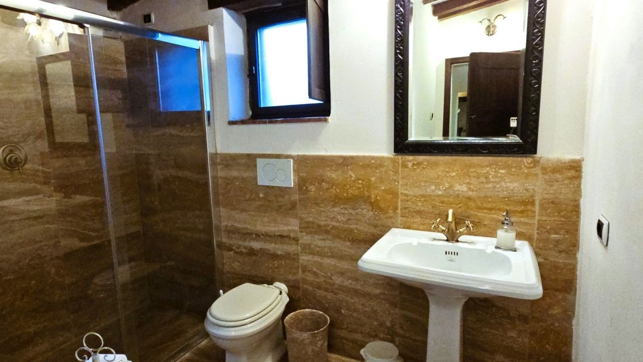 The ground floor houses three bright adjoining living rooms, embellished with two large French windows overlooking the greenery, a bedroom, and a bathroom finished with elegant travertine tiles. An open staircase leads to the dining area with a wood-burning stove and the kitchen with direct access to the garden, where a majestic carob tree offers refreshing shade on hot days.