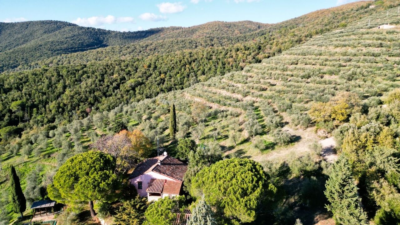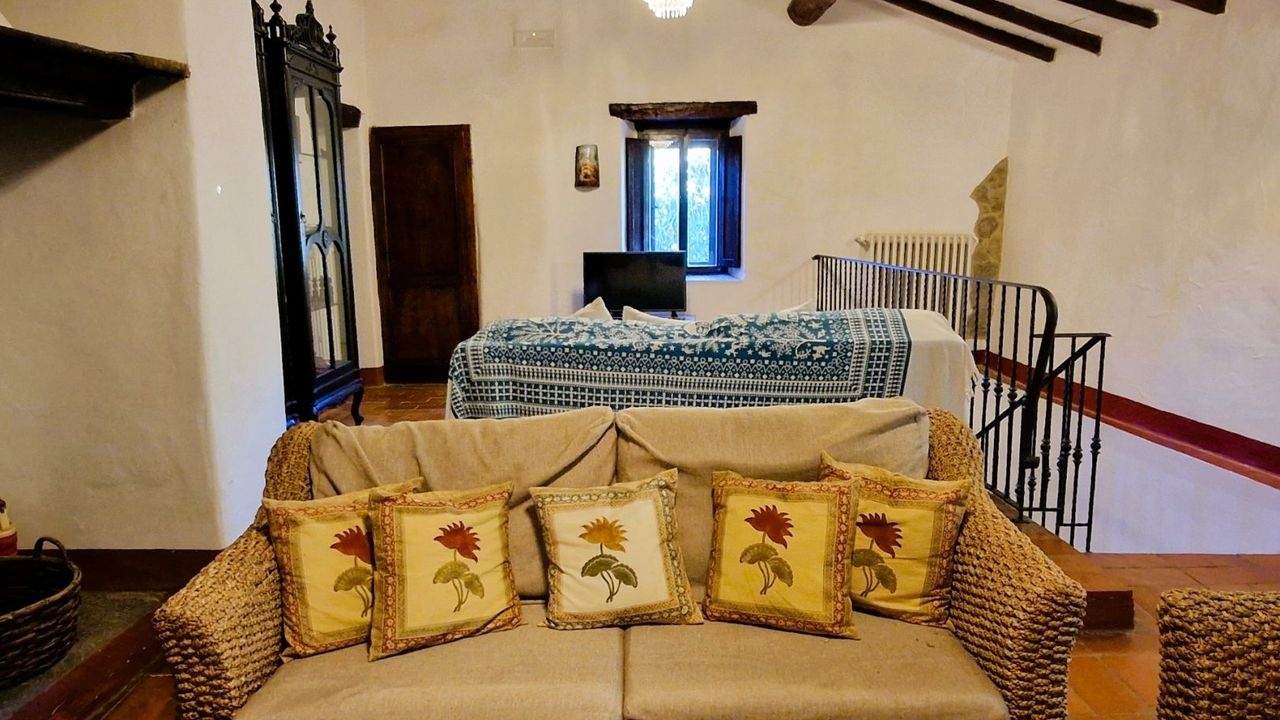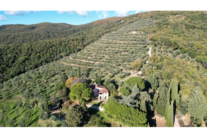 Dating back to the 18th century, the 364-sqm house is surrounded by 3.6 hectares of terraced olive groves and retains all the authentic charm of rural dwellings, as evidenced by the wooden beamed ceilings and terracotta floors.