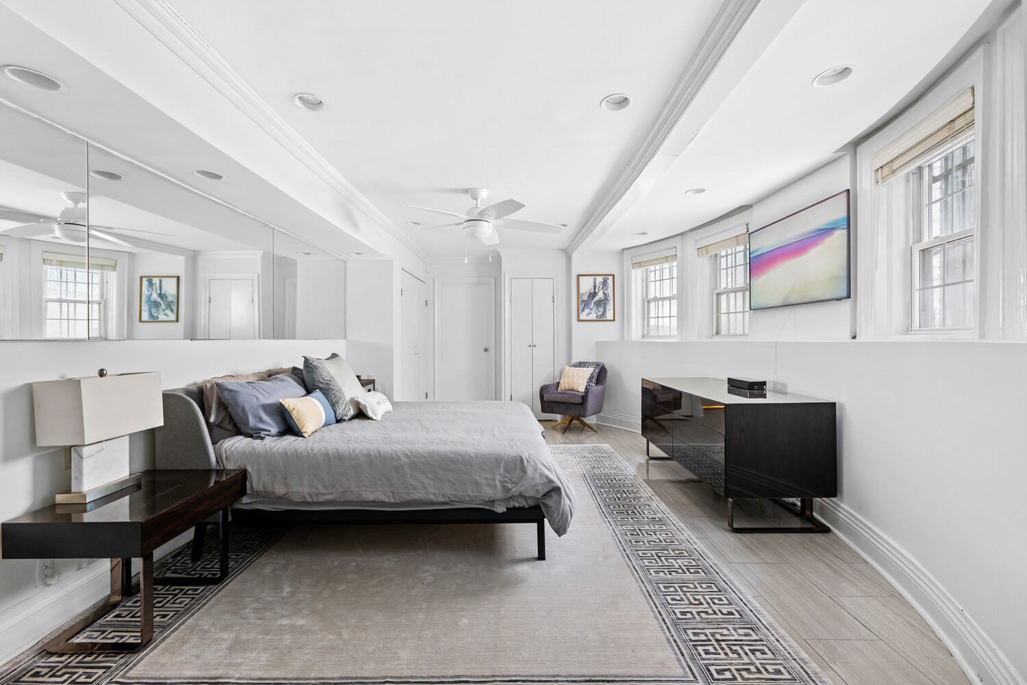 The garden level functions as a full-floor primary suite. Large bow windows overlook the private outdoor space, bringing natural light through the room. The suite includes two closets, a vanity area, recessed lighting, and enough space for a king-sized layout. The windowed primary bathroom features a soaking tub, a separate stall shower, and direct access to the private garden, creating a seamless indoor-outdoor connection.