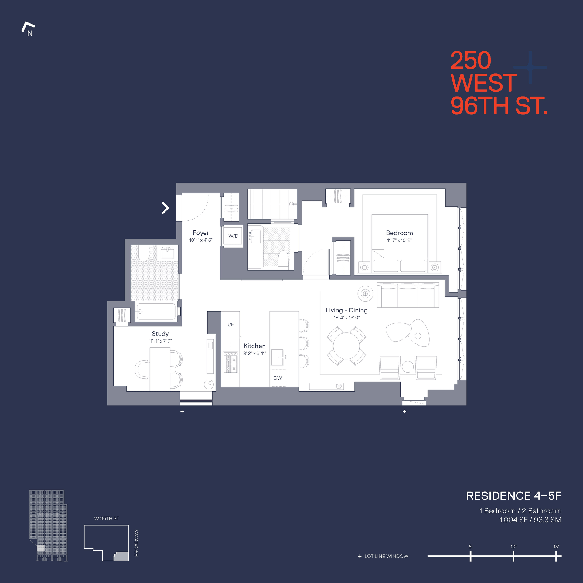 Residence 4F is an exceptional 1000+ sq ft 1 bedroom/ 2 bath home with a separate substantial office, study or 2nd sleeping space, featuring 9'1" ceilings.