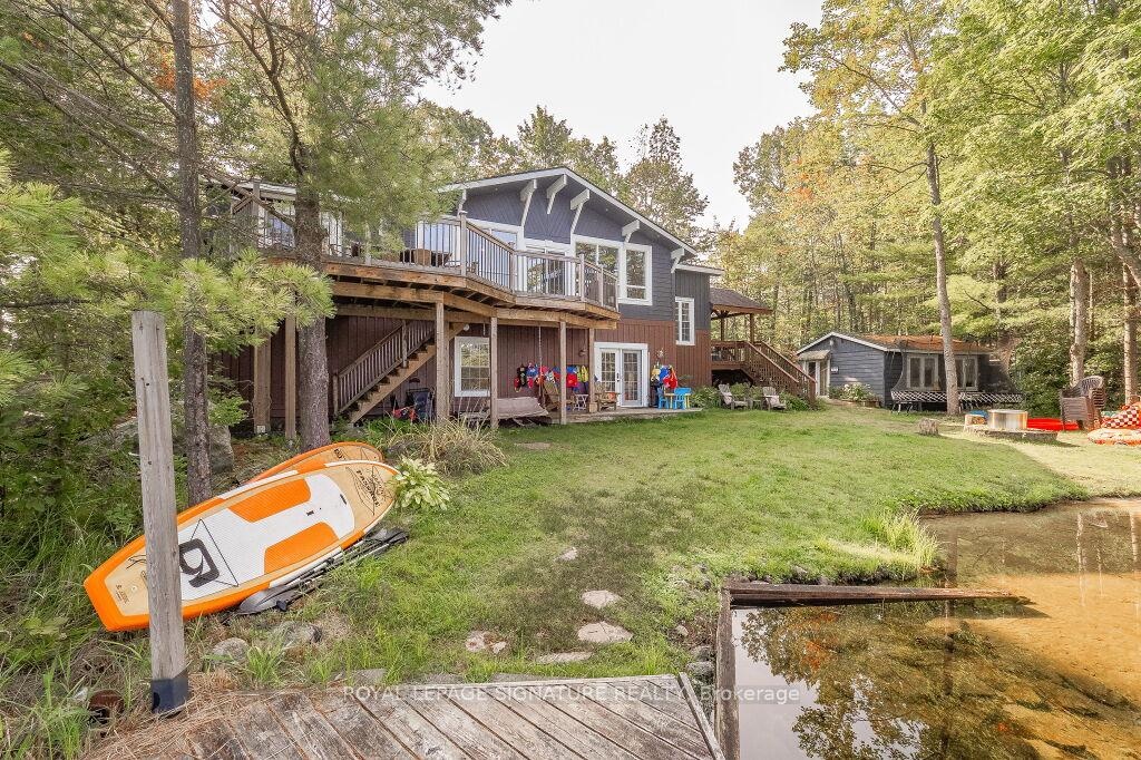 Fully Furnished, Spectacular 4-Season Lake Front Property On The Serine & Private Sunny Lake! Open Concept Main Floor With High-End Chef's Kitchen & Exposed Beam Ceiling. Cozy Family Room With Views Of The Lake From Every Window. Walkout Deck From Main Floor Overlooking Lake With Incredible Sunsets! 3 Bedrooms & A Second Living Room On Lower Level With Wood Burning Fireplace. Private Beach & Dock. Seeing Is Believing!