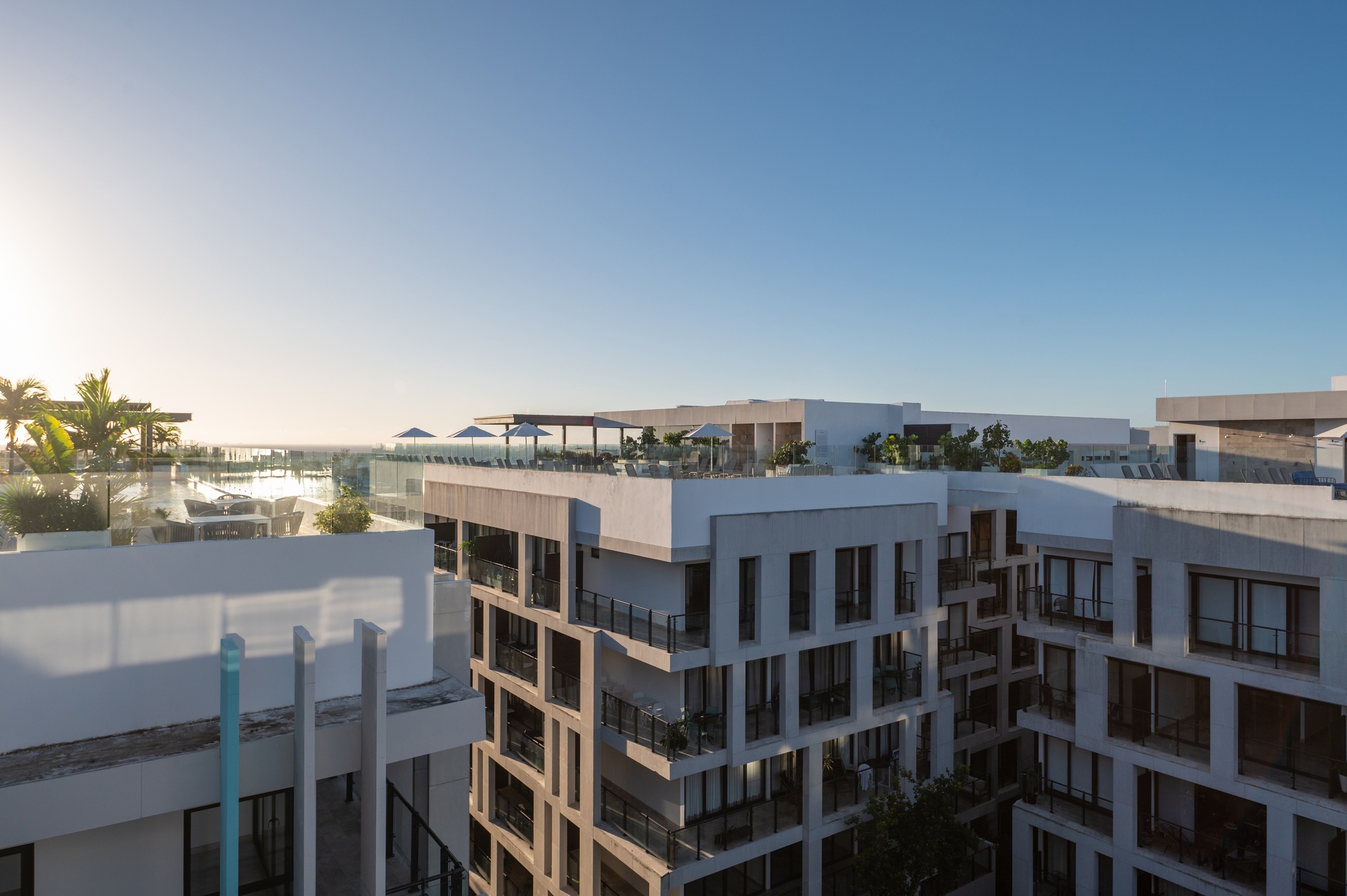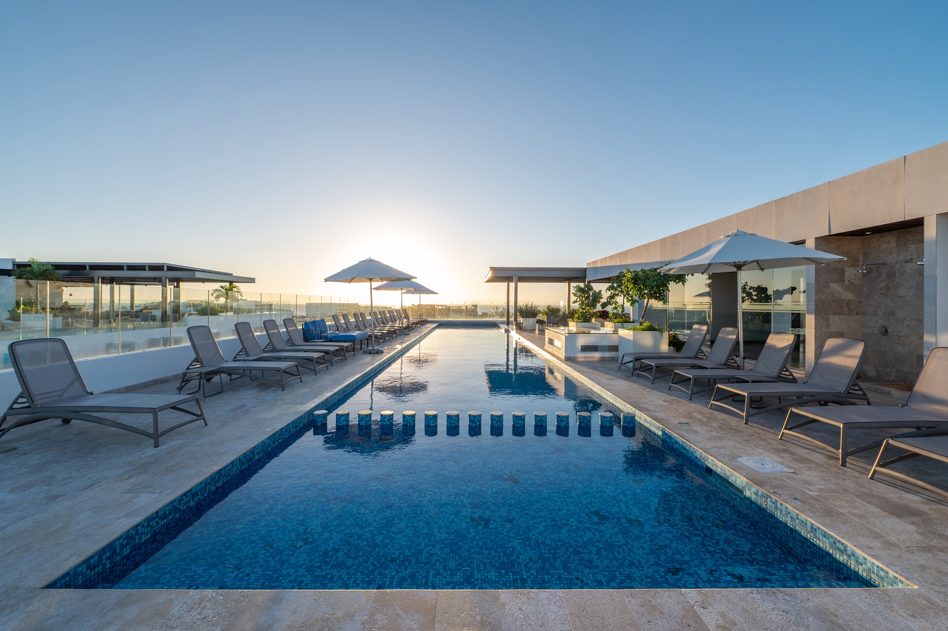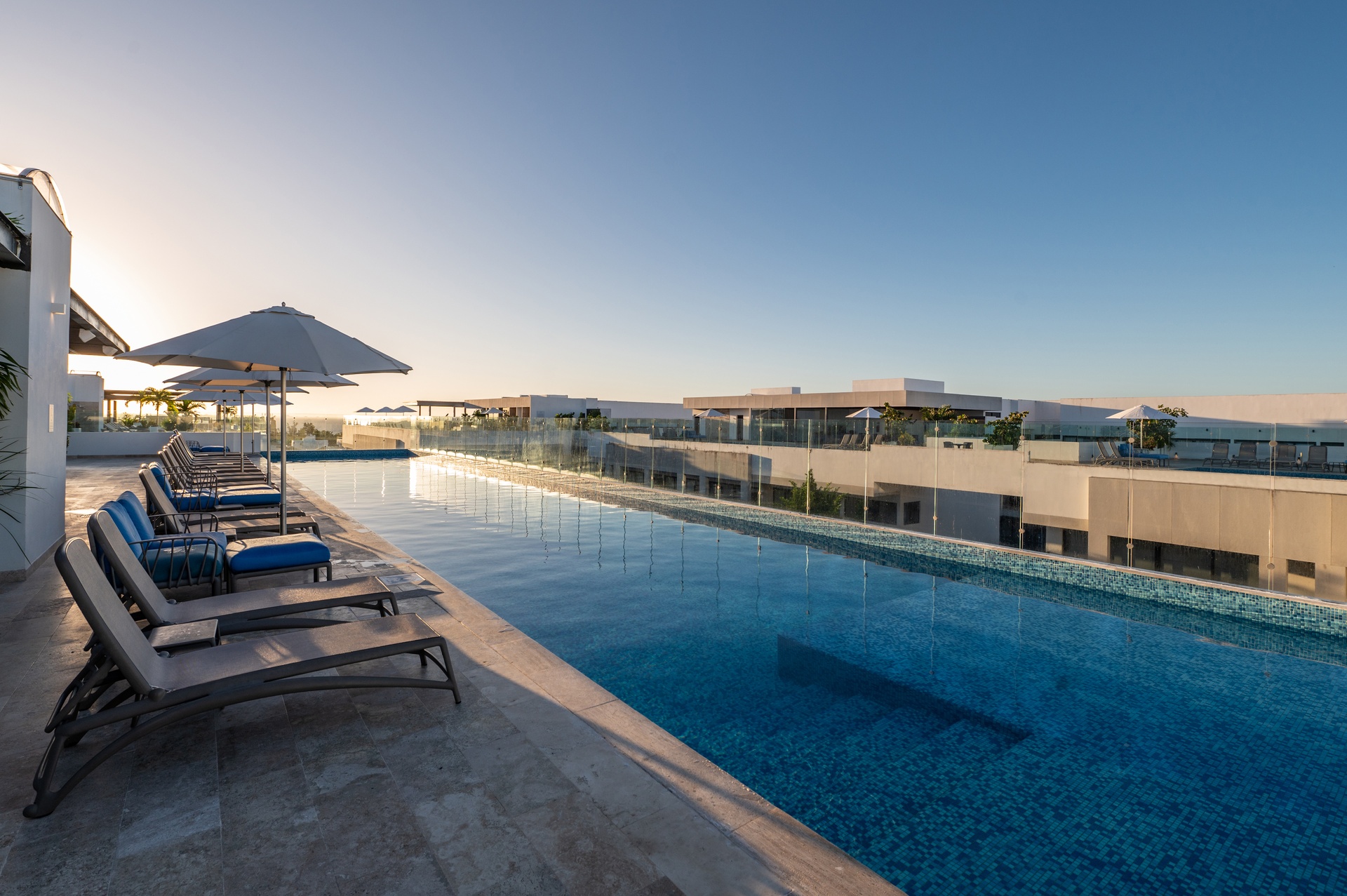 interconnected towers, all featuring rooftop amenities with pools offering panoramic